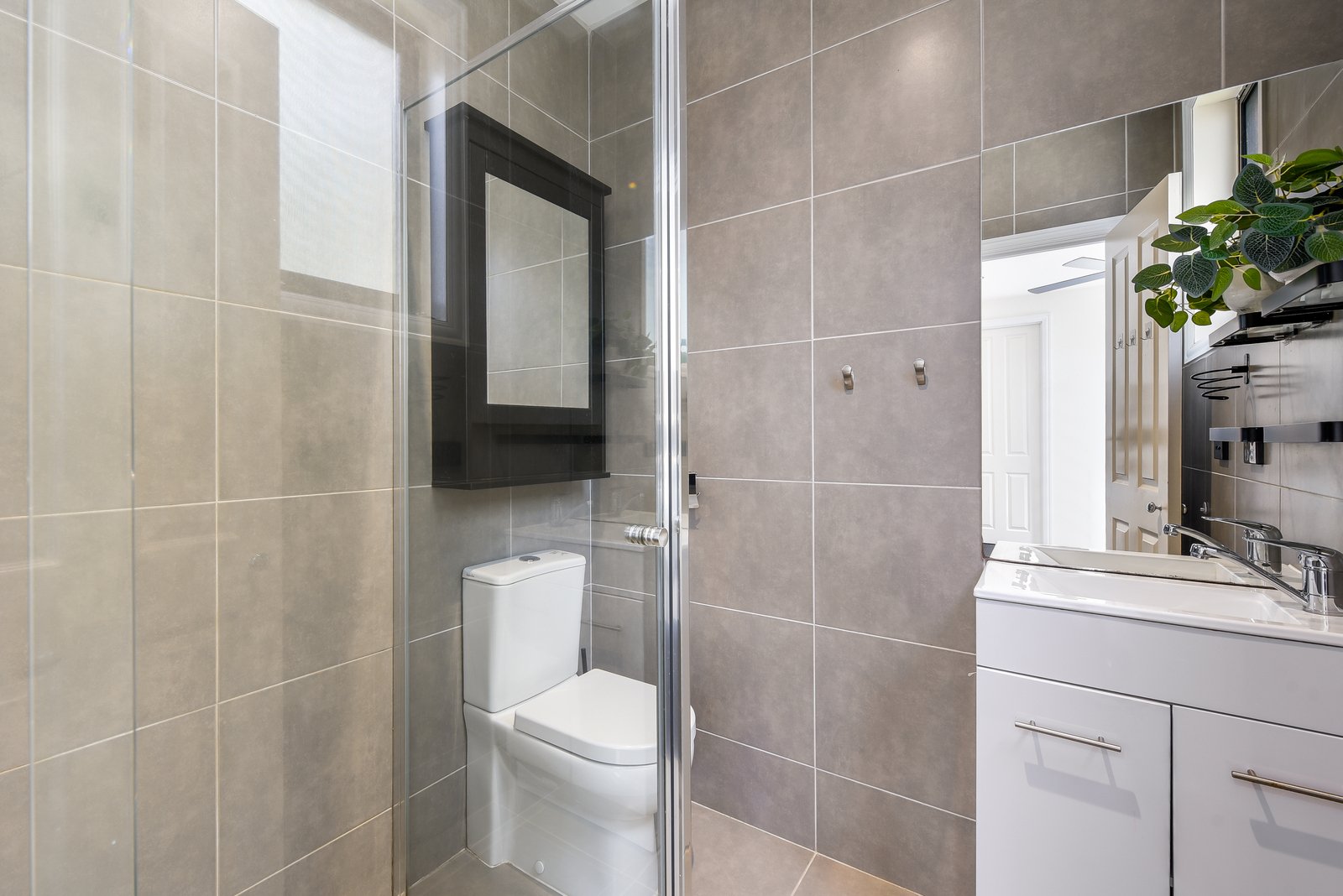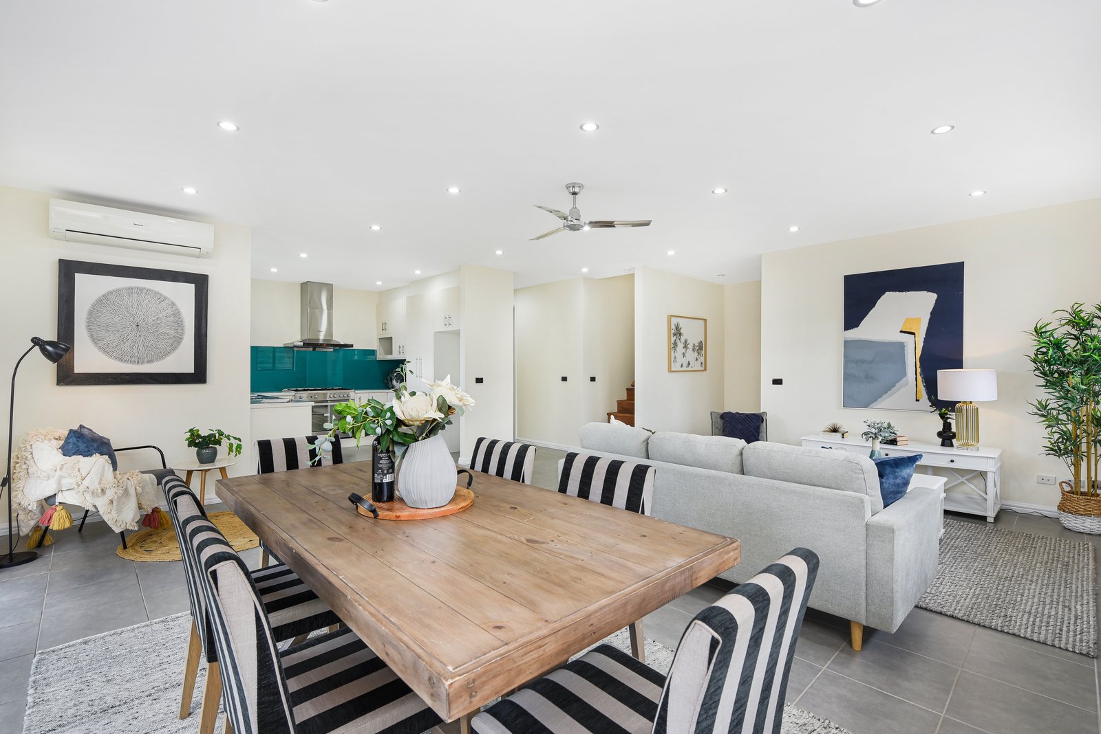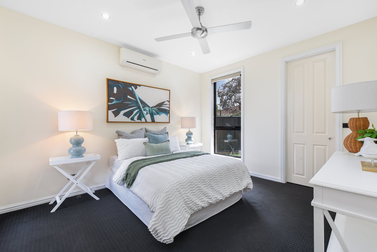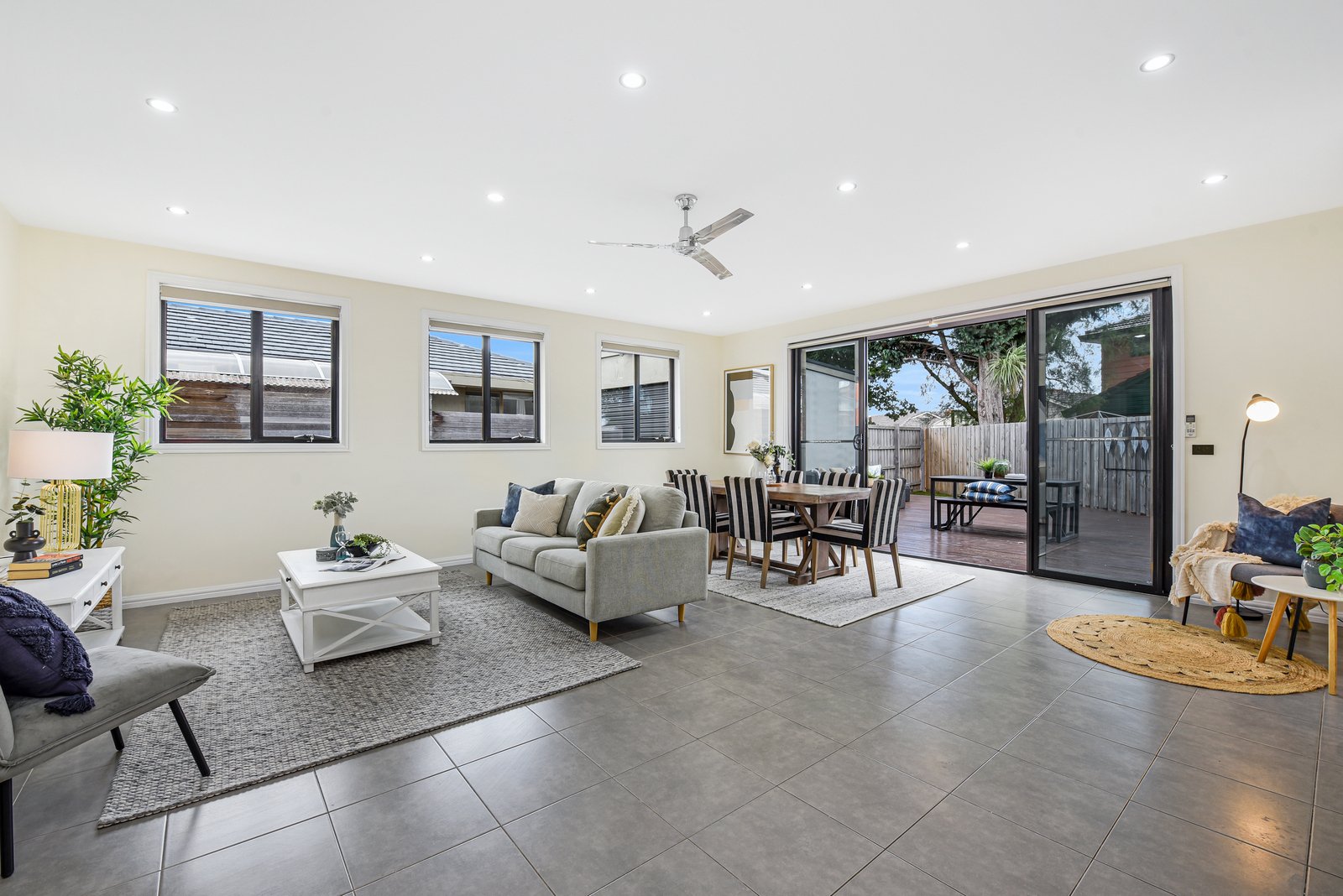 The spacious, freshly-painted open-plan layout enjoys cool evening breezes from the South that make their way inside via quad-stacker glass sliding doors that adjoin a sizeable outdoor entertaining deck. A ceiling fan and AC unit keep things cool, while roller blinds provide privacy. Concrete-look ceramic floor tiles are stylish and modern, as are the LED down lights that illuminate the space. Outdoors, buyers will love the easy-maintenance faux turf that ensure weekends are spent relaxing rather than mowing.