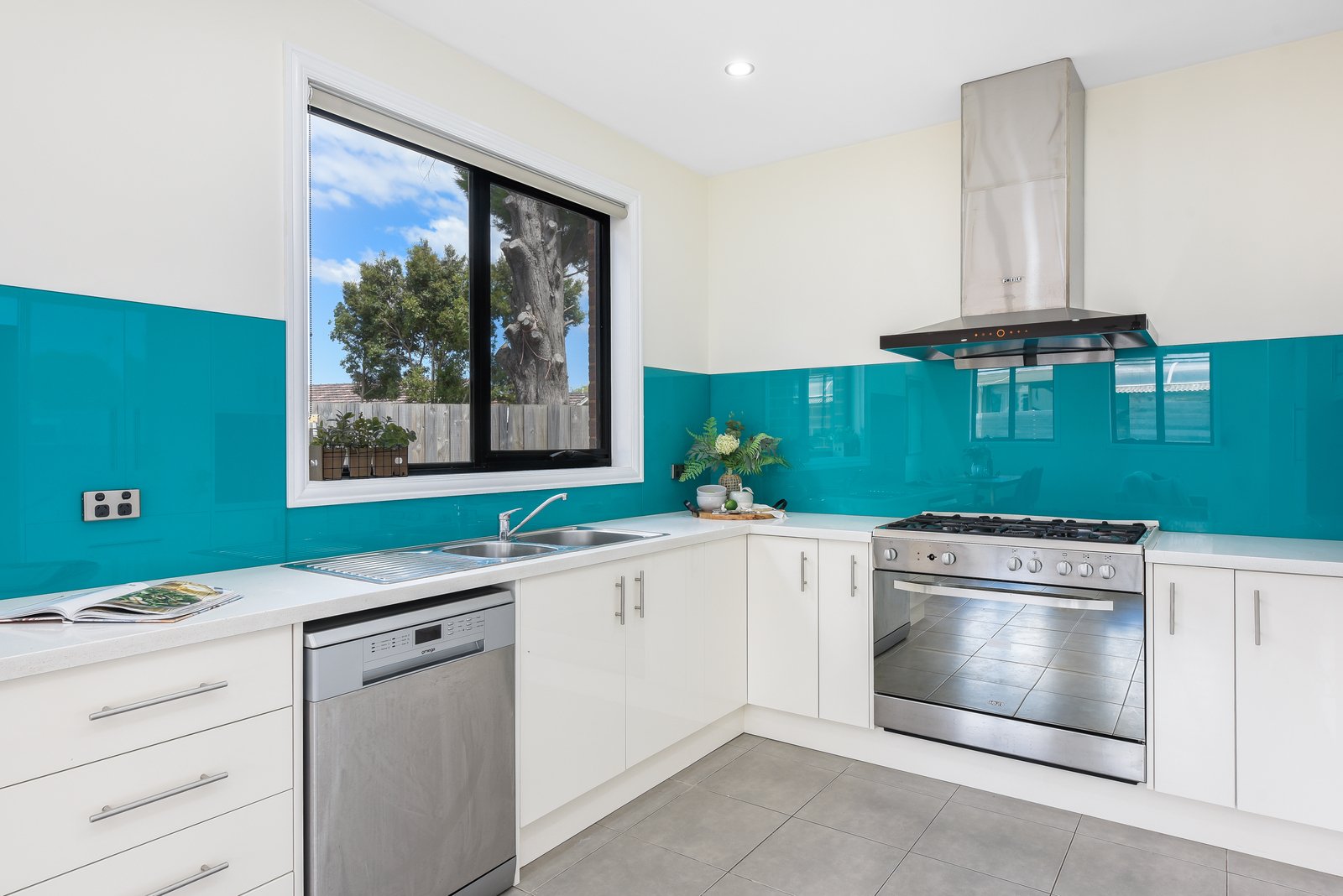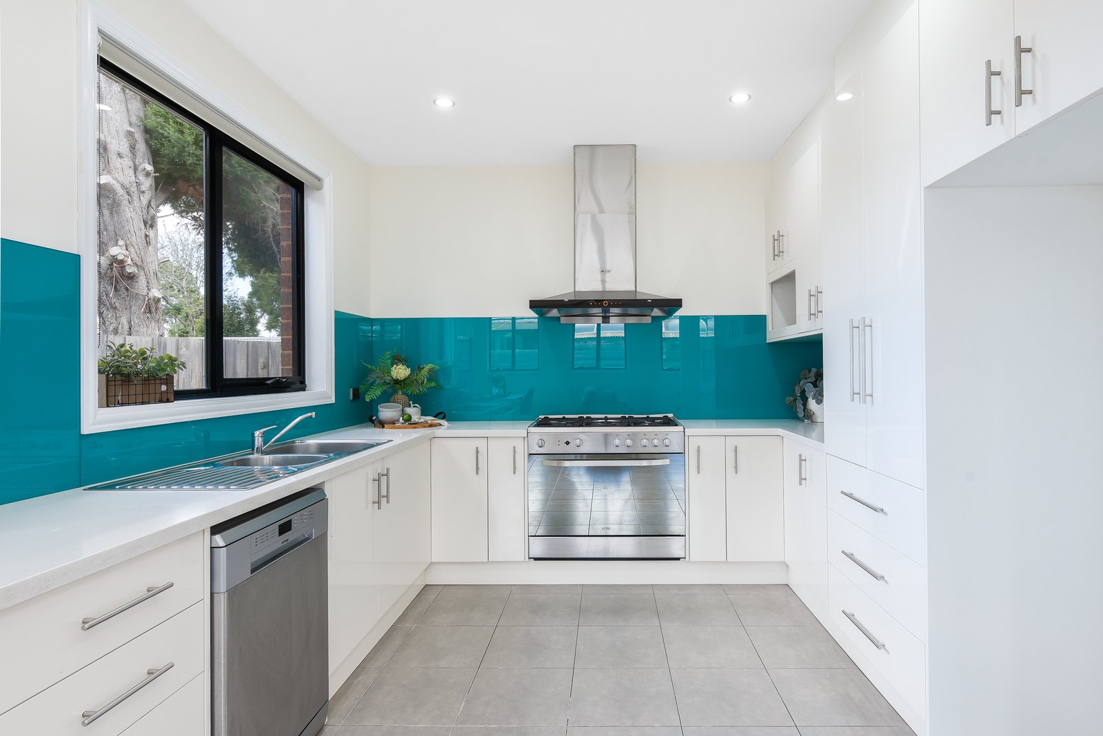 The kitchen is luxurious, highlighted by 40mm stone bench tops, gloss-white cabinets and drawers and tied together by a deep emerald glass splashback that runs perimeter. An integrated 900mm electric oven and gas burner cooktop are adorned by a gourmet rangehood, while a stainless steel dishwasher ensures cleaning up is a breeze.