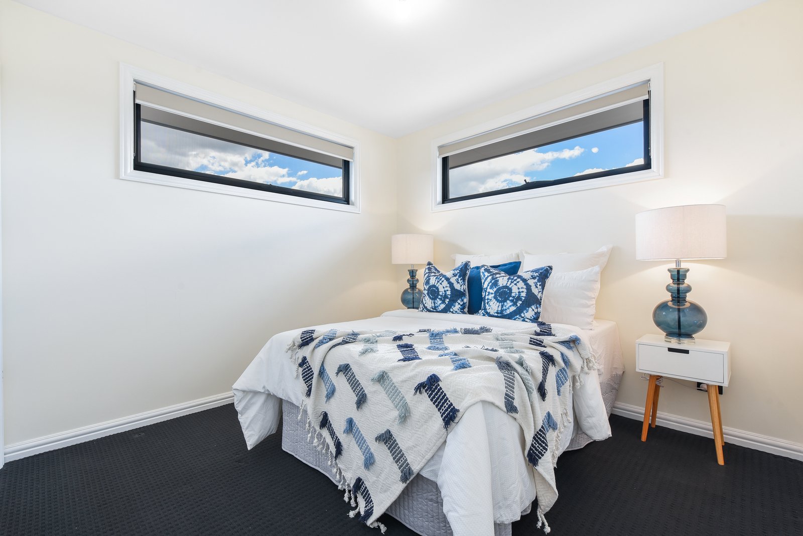 All four bedrooms are air-conditioned and enjoy loads of built-in storage. The master suite is positioned on the ground floor, adding a walk-in robe and private ensuite. Atop a luxe timber staircase, three more bedrooms are separated and enjoy lots of natural light. Both bathrooms in the home are opulently finished with full height wall tiles and semi-frameless showers. A tiled hob bathtub features in the main, perfect for families with young children.