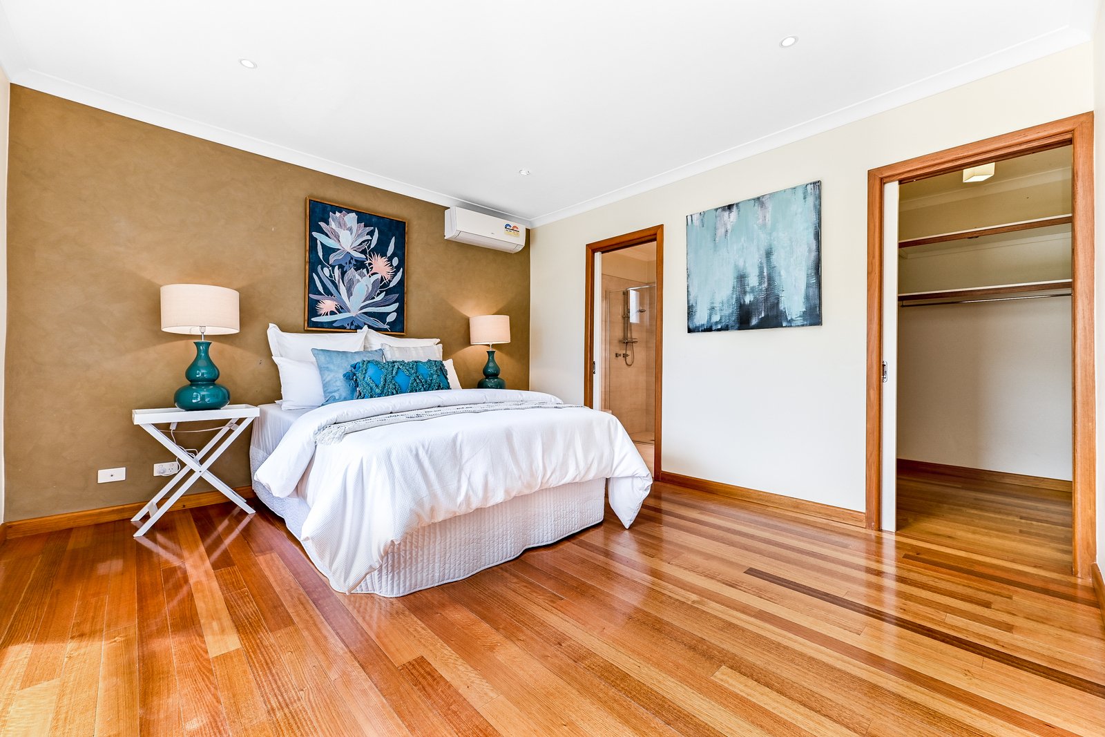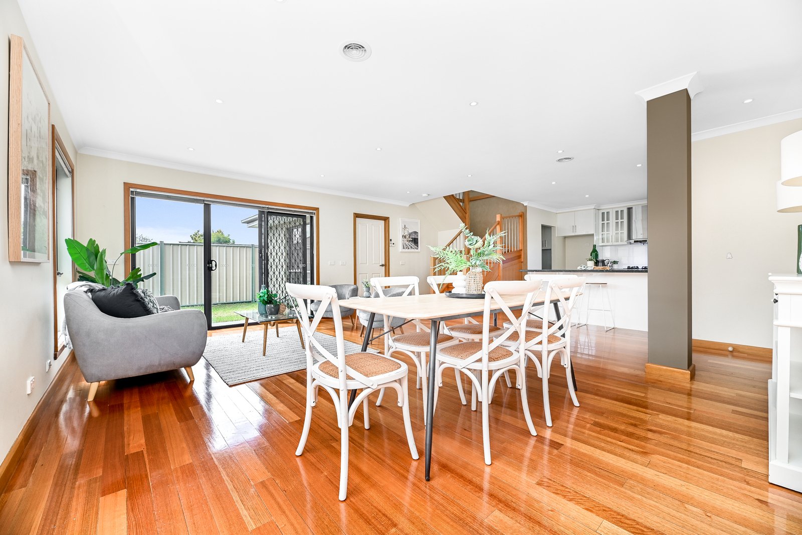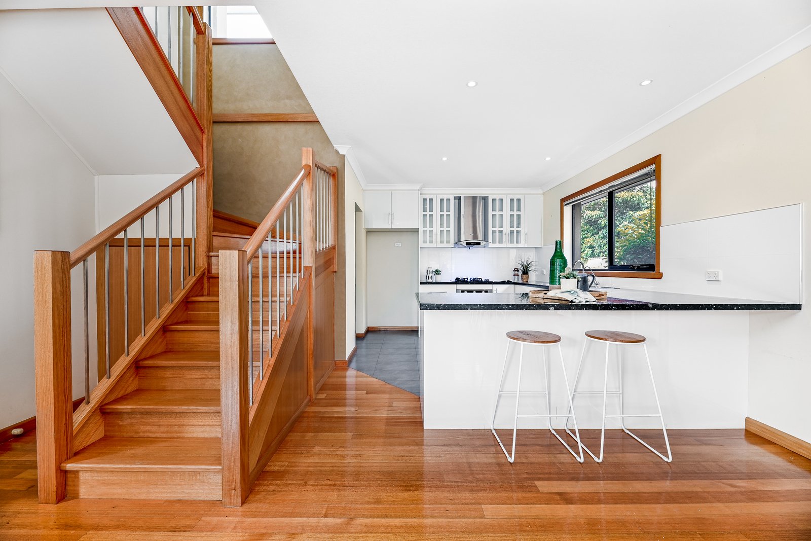 The ground floor is warm and inviting, spacious in an open-plan design. Polished hardwood floors are accentuated by a stunning matching timber staircase and timber architraves around windows and sliding glass doors. LED down lights are modern and fresh, and the home is comforted by ducted heating and split system air conditioning to all bedrooms and living spaces. Venetian blinds to windows offer privacy, while outside a sunny yard is neatly turfed and adds a paved space, perfect for the morning coffee.