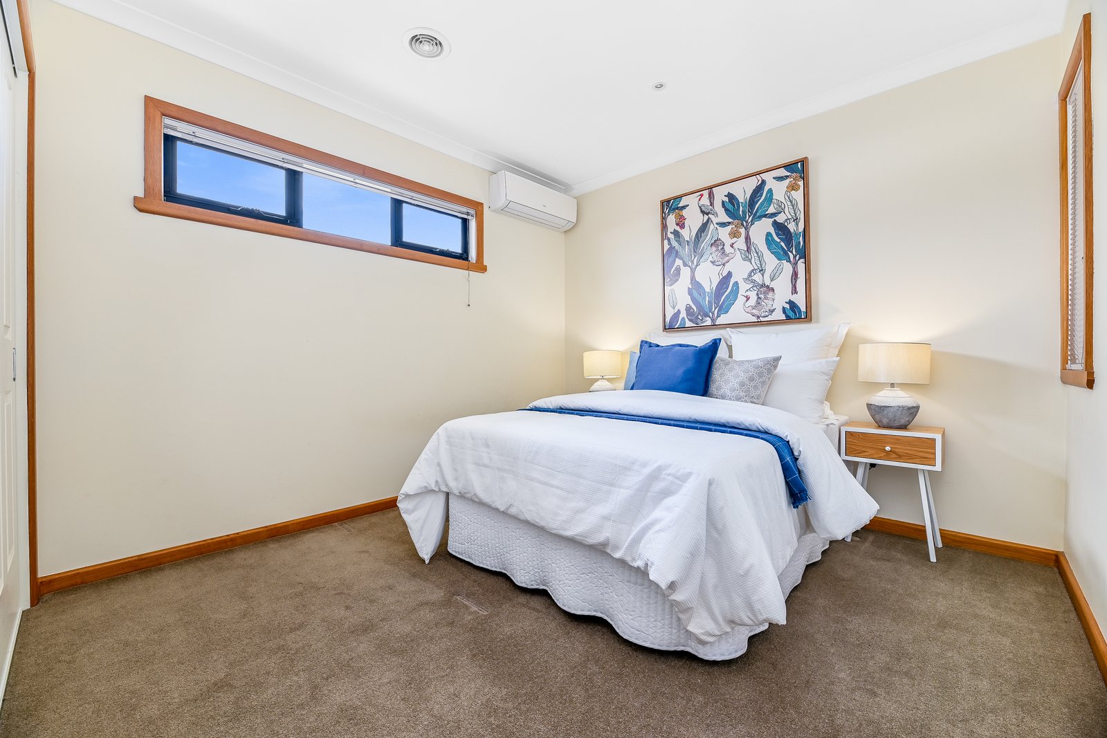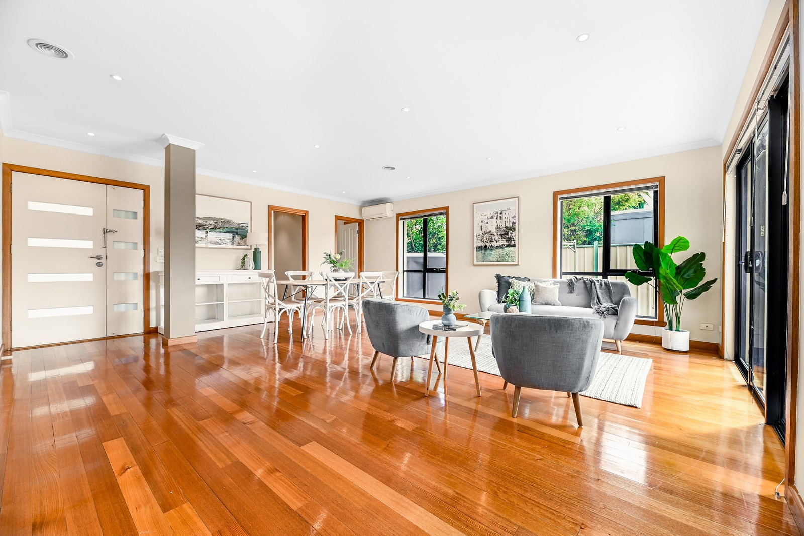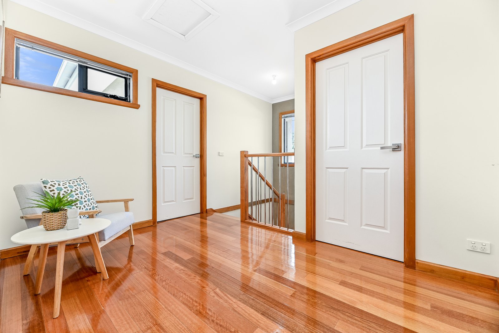 The ground floor is warm and inviting, spacious in an open-plan design. Polished hardwood floors are accentuated by a stunning matching timber staircase and timber architraves around windows and sliding glass doors. LED down lights are modern and fresh, and the home is comforted by ducted heating and split system air conditioning to all bedrooms and living spaces. Venetian blinds to windows offer privacy, while outside a sunny yard is neatly turfed and adds a paved space, perfect for the morning coffee.