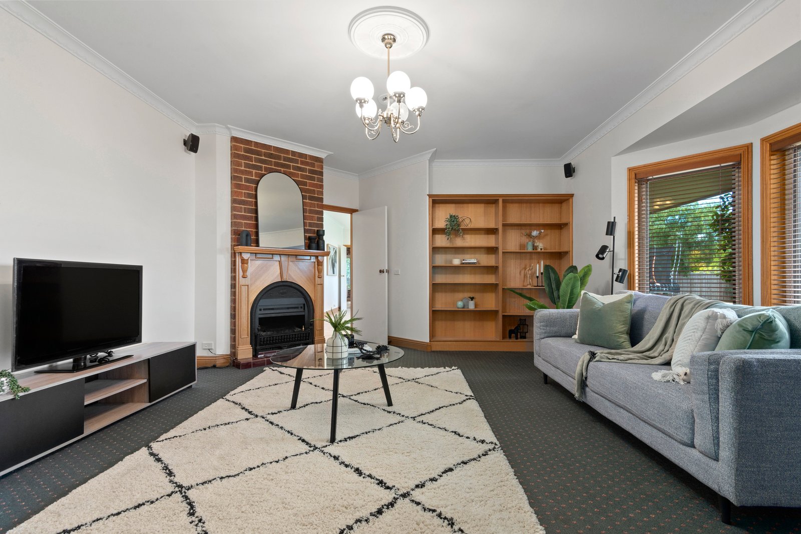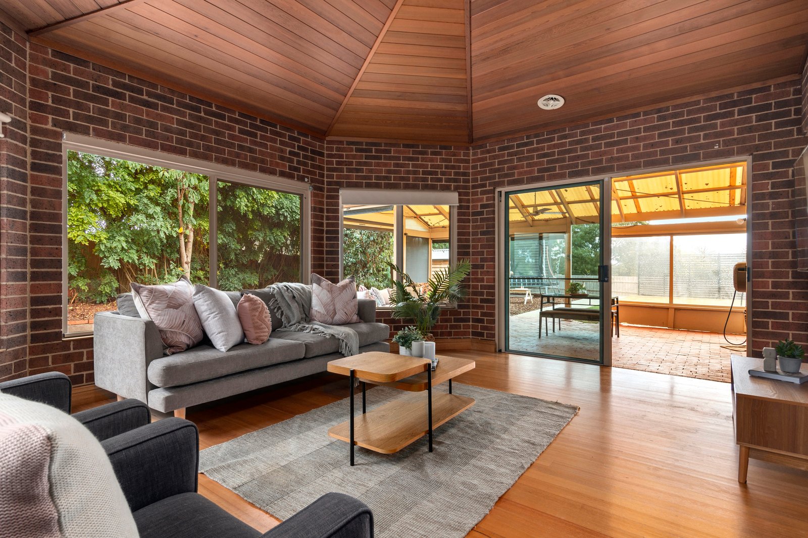 Nestled in a quiet court behind established gardens, the home enjoys a private setting. Stepping inside, a wide entry leads through to the formal living which features a beautiful bay window, timber mantel and gas log fire, offering an ambient space to relax or entertain. The adjoining kitchen is well-equipped including a Bosch 600mm oven, induction cooktop and dishwasher, excellent storage and bench space, and is centrally positioned to service the casual meals, formal dining and alfresco for effortless entertaining. A second living area at the rear offers a pavilion style space capturing north-facing light, with stunning timber lined ceilings, bi-folds opening up to the dining room and glass sliders leading to the alfresco, creating an impressive layout for entertaining.