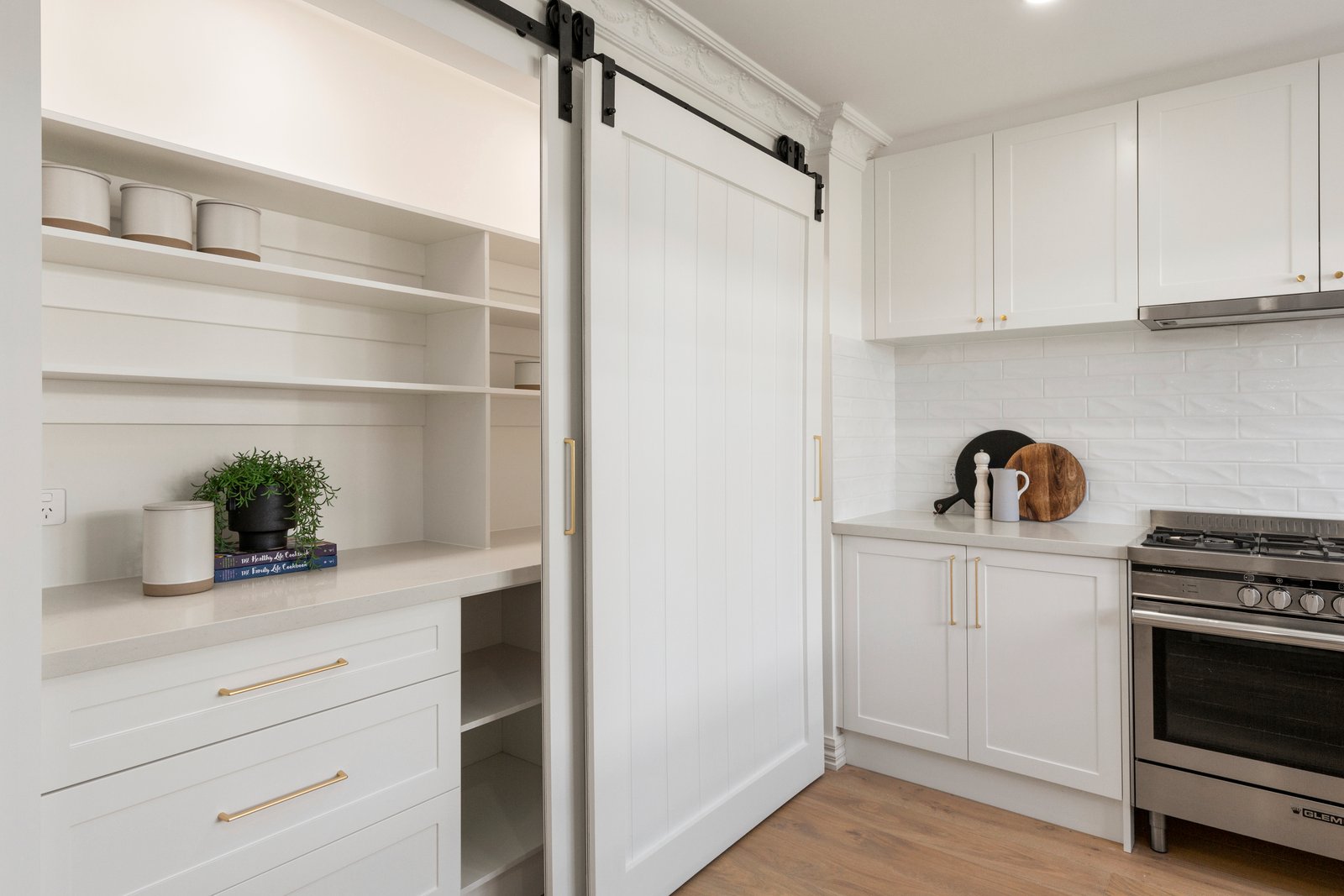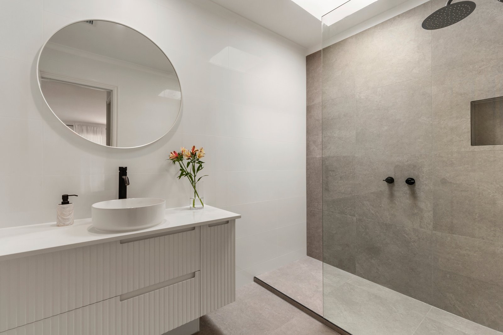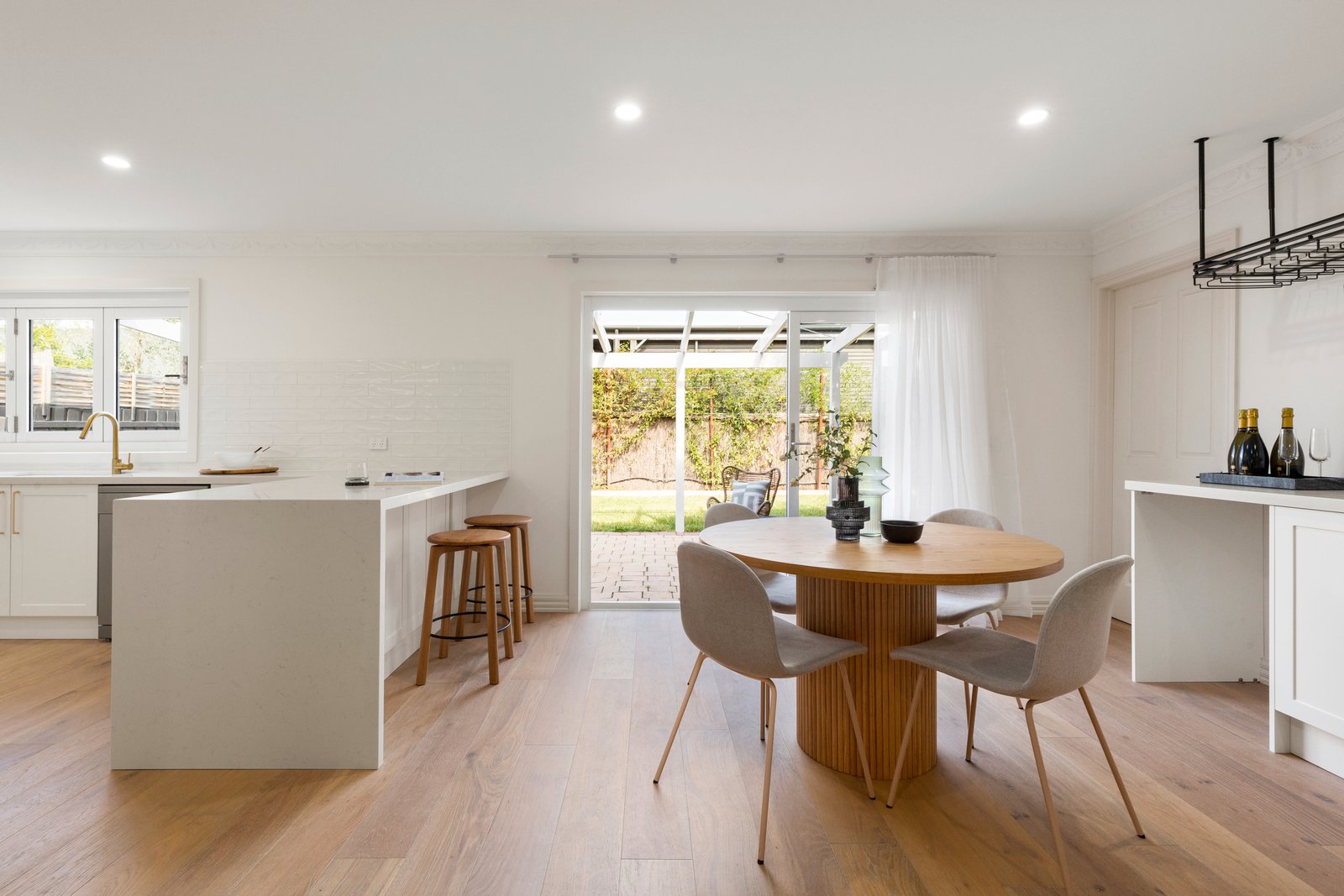 Awash in natural light, an open-plan living and dining space, with built-in bar, seamlessly transitions through fully-retracting bi-folds to a generous alfresco terrace set in private leafy surrounds.