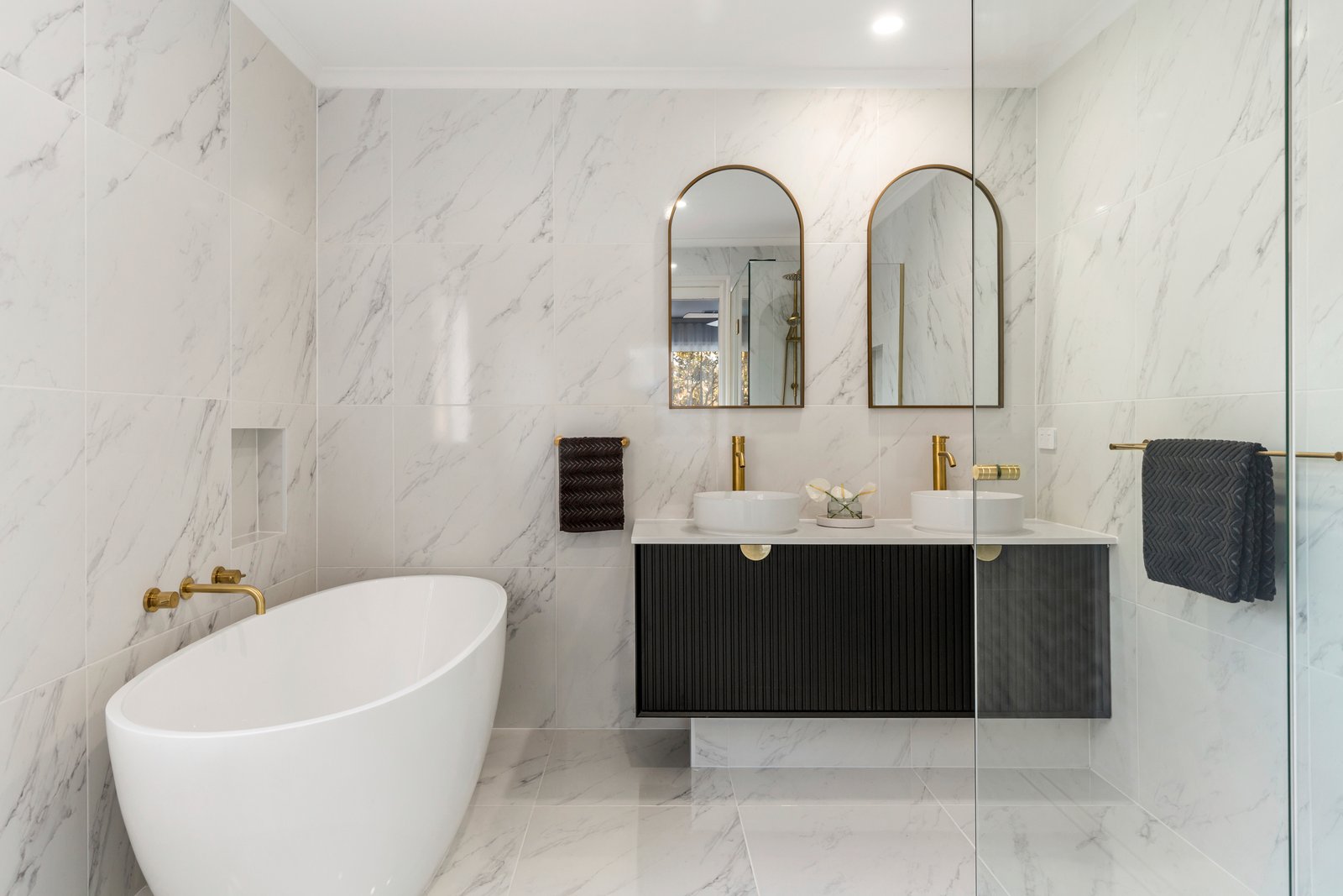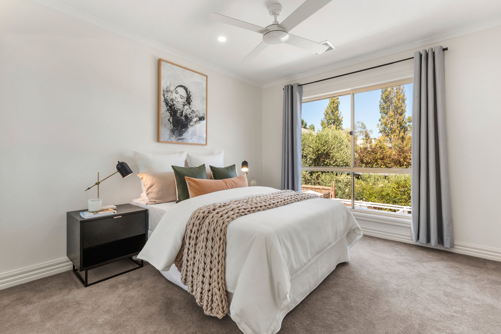 Upstairs, a sun-drenched retreat with bay window adjoins a study nook where sliding doors spill to a covered balcony enjoying delightful tree-top vistas. Four bedrooms on this level, each feature ceiling fans, including the indulgent master bedroom suite with walk-in robe and sumptuous twin-vanity ensuite featuring deep soaker tub. Three additional bedrooms, with mirrored built-in robes, share a luxe bathroom and separate WC; while on the ground floor a fifth bedroom, with fully-tiled ensuite, is perfect for guests or as an alternate master bedroom.