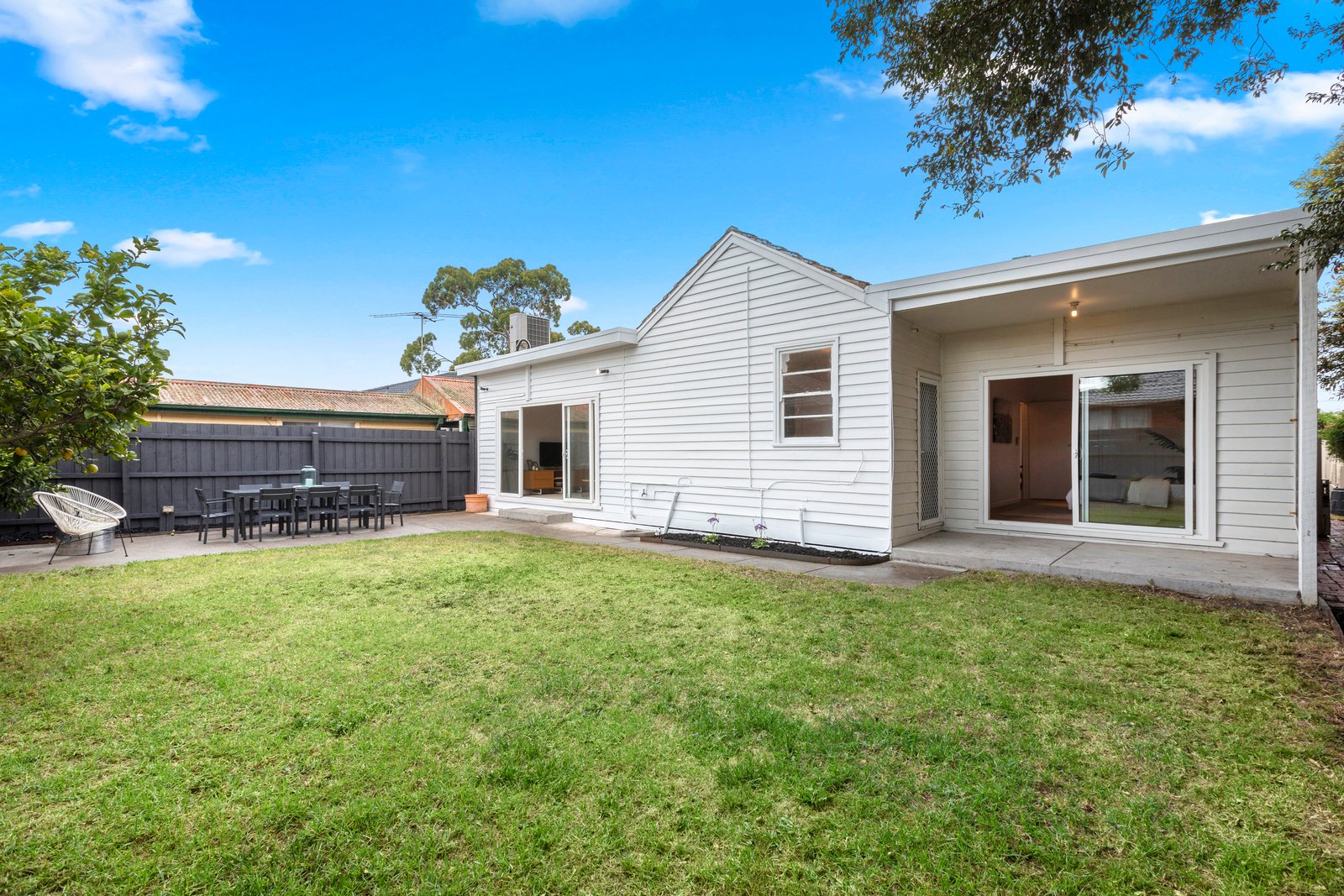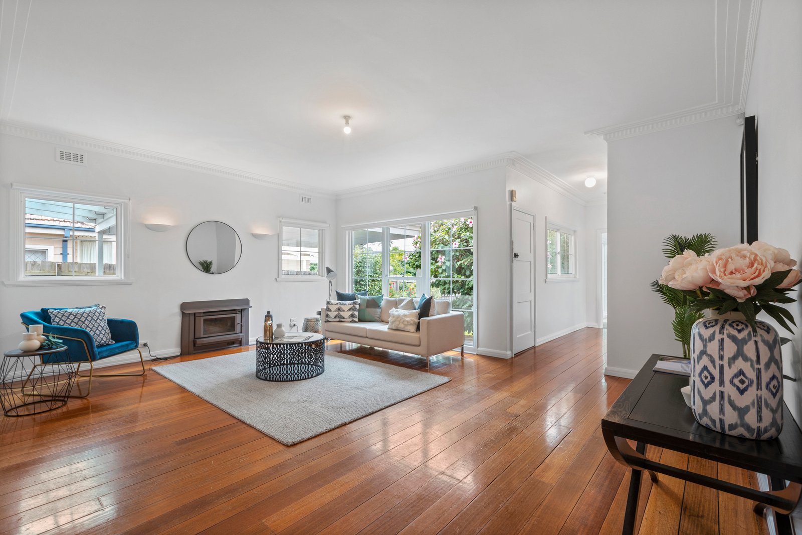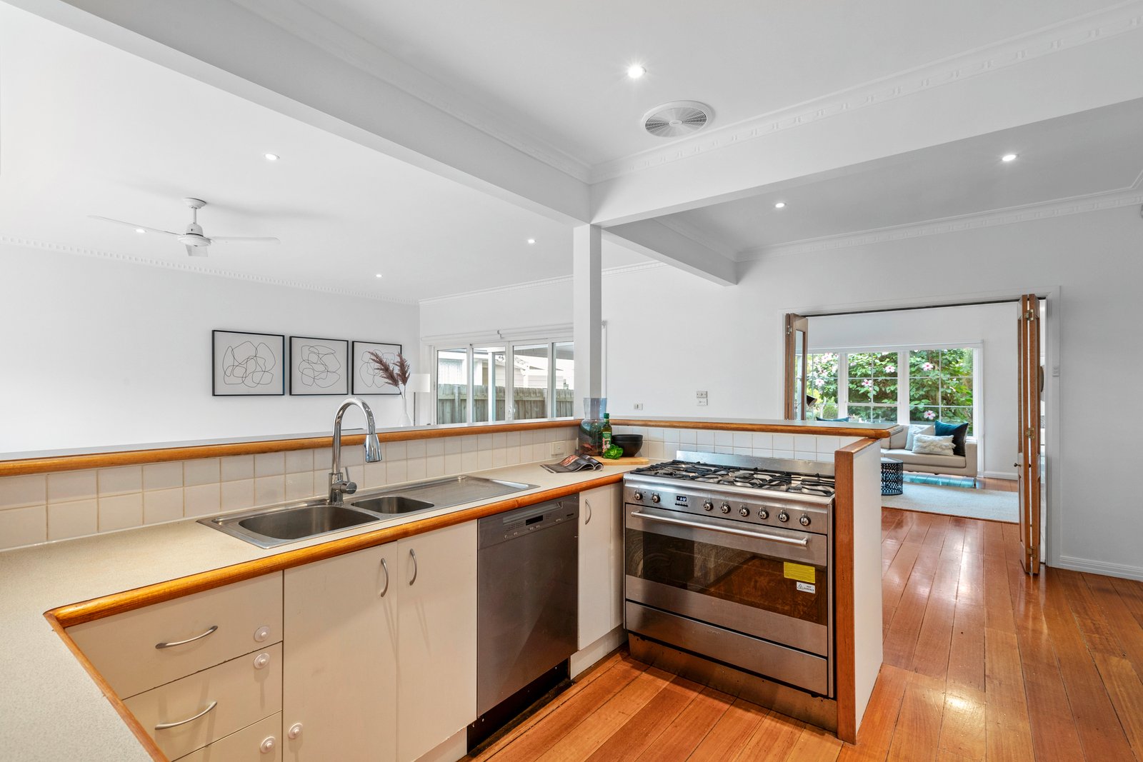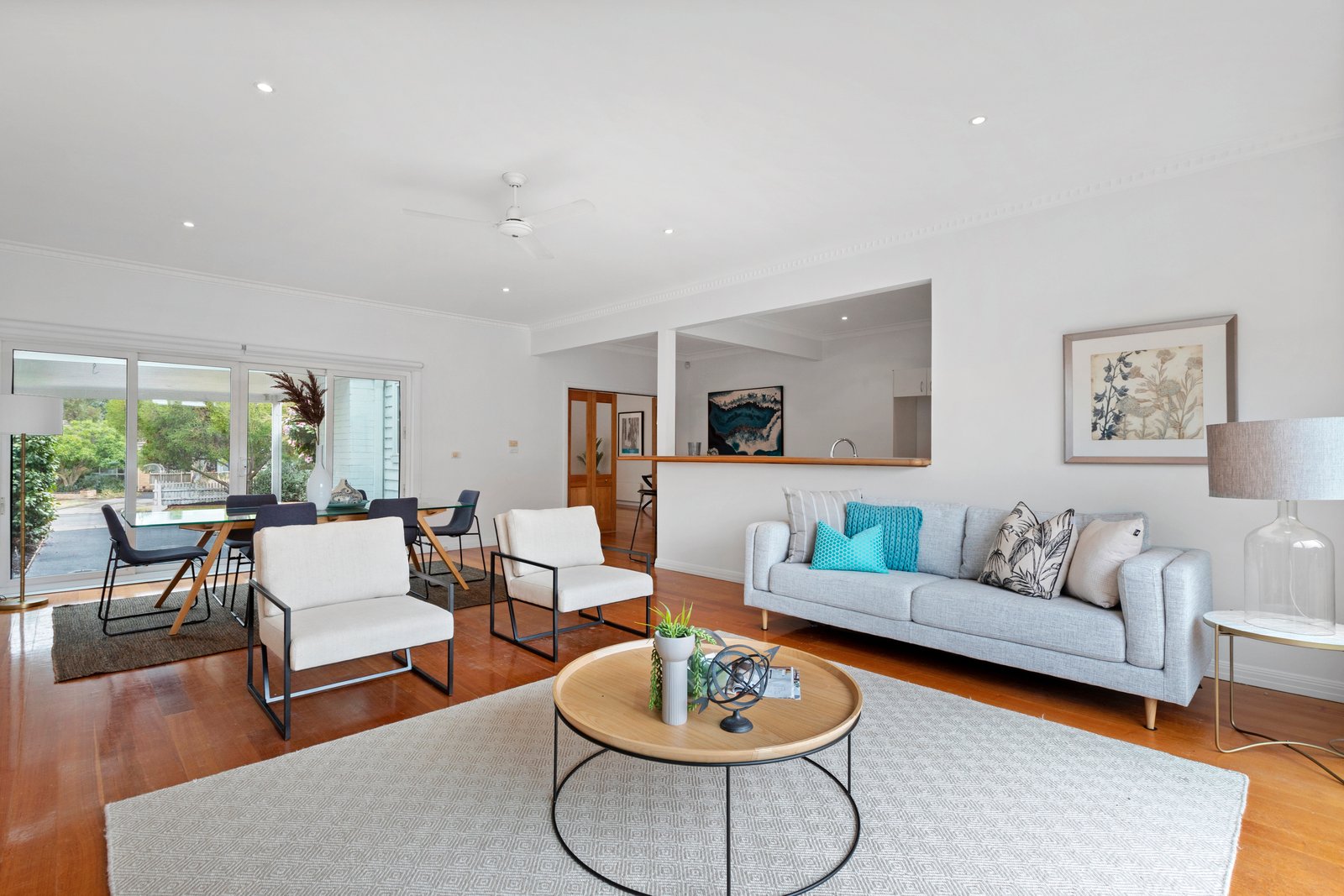 Sliding doors at either end of this large room connect the interiors with the gardens, the rear area featuring an alfresco patio and plenty of lawn for the kids.