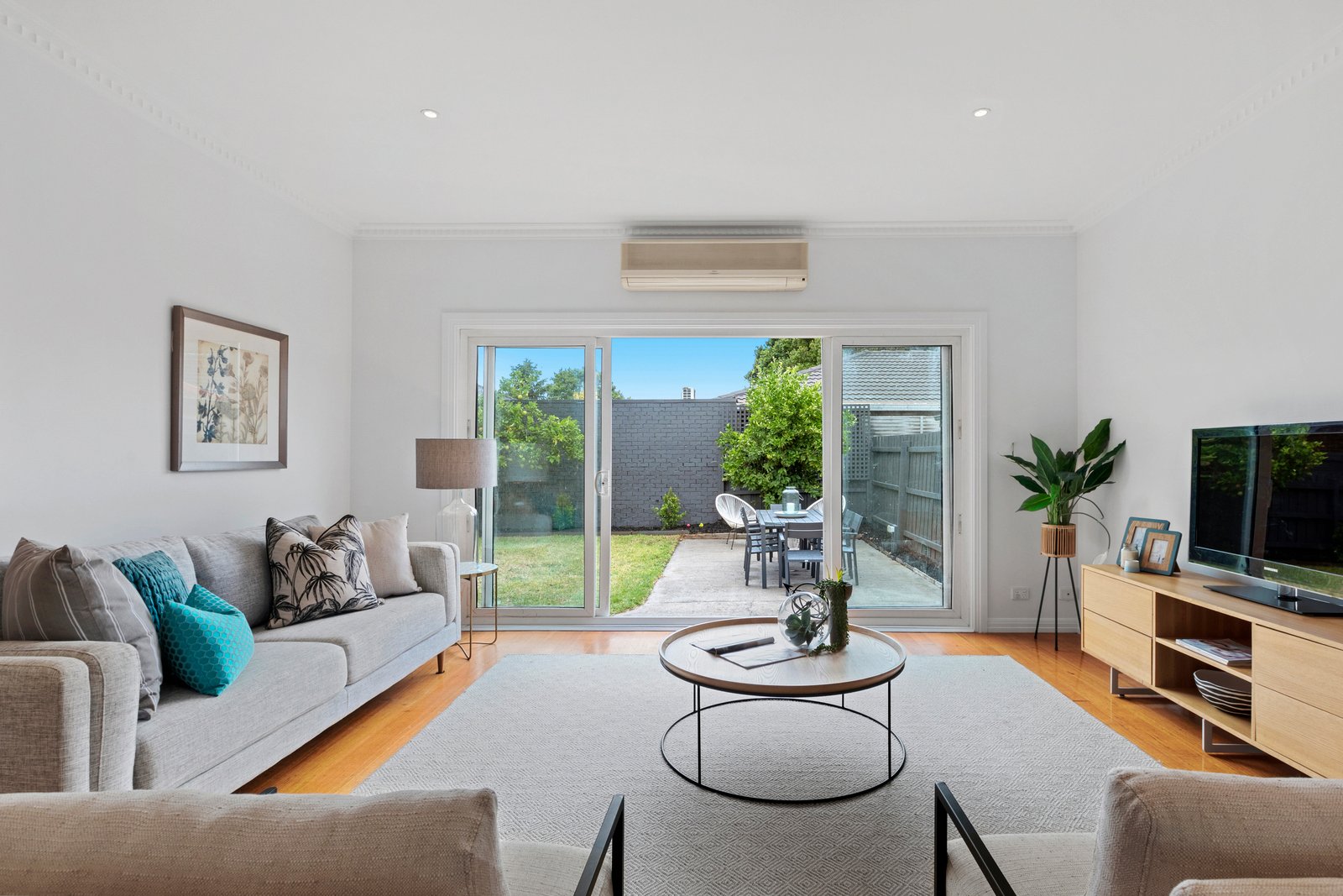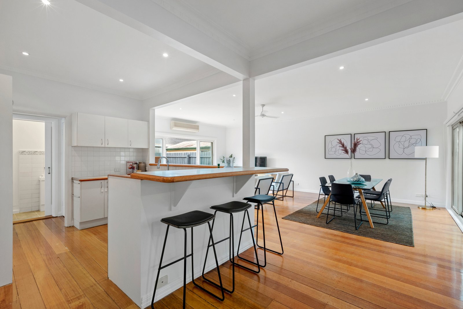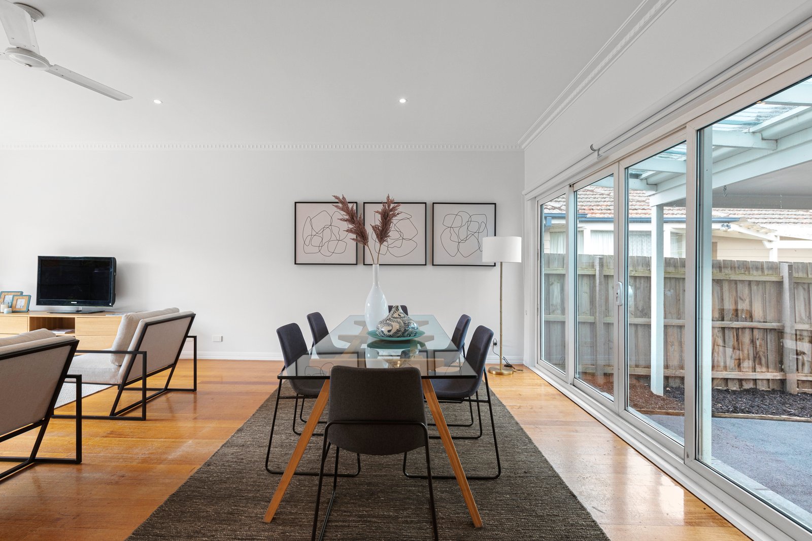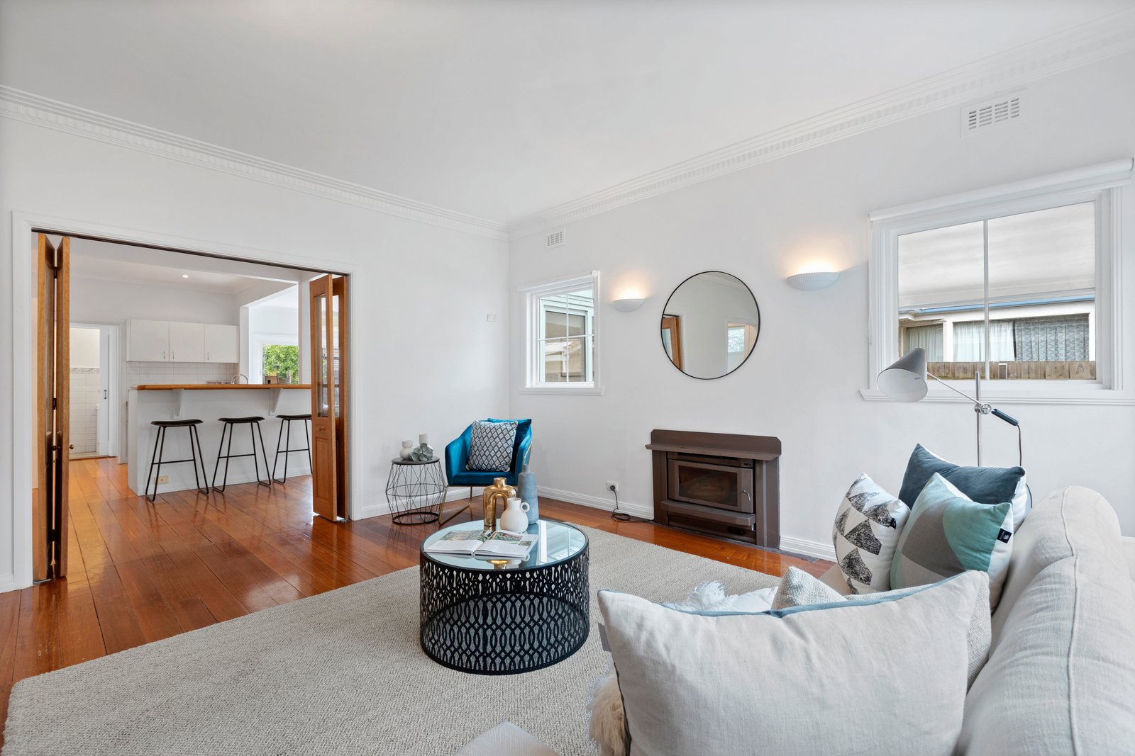 Sliding doors at either end of this large room connect the interiors with the gardens, the rear area featuring an alfresco patio and plenty of lawn for the kids.