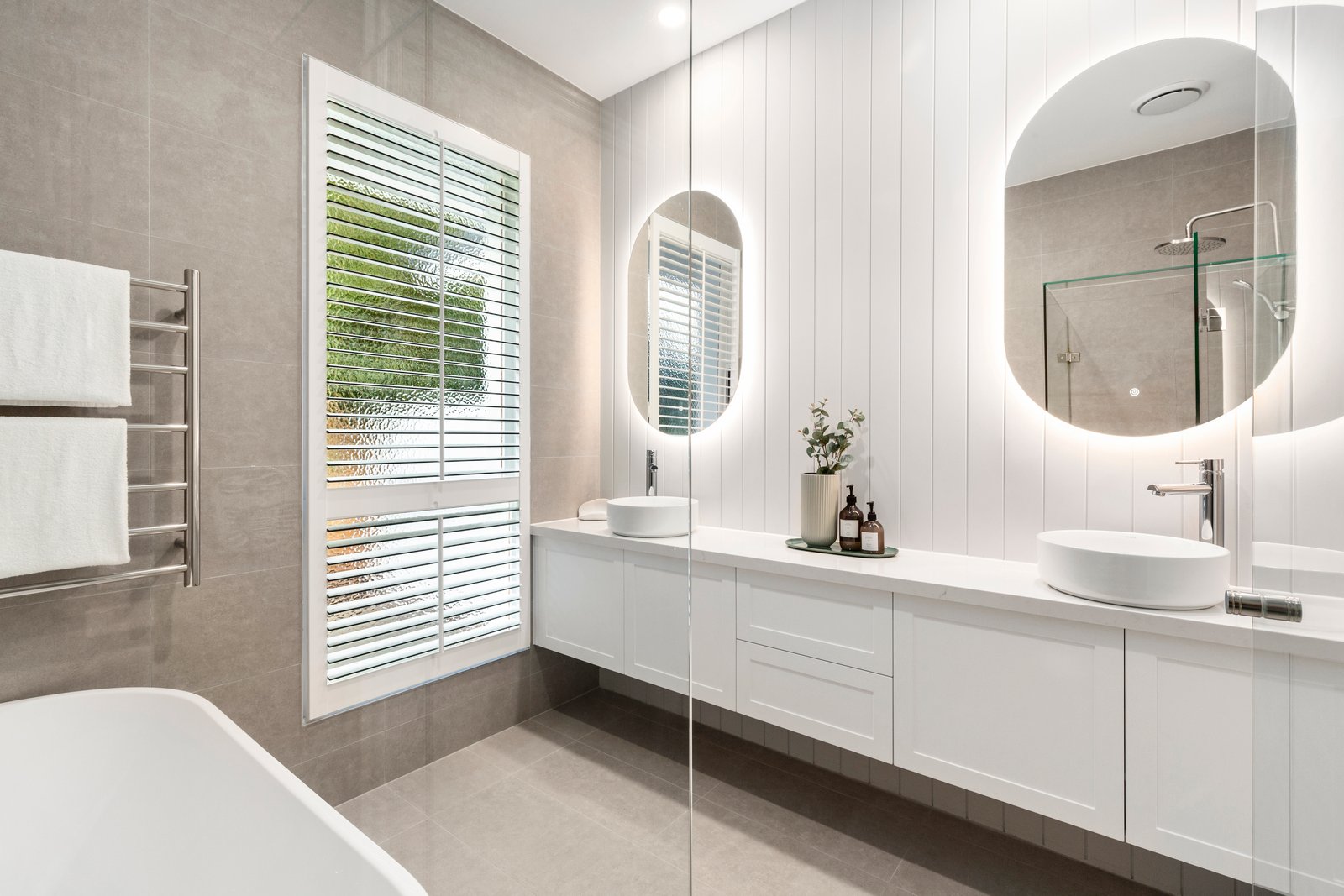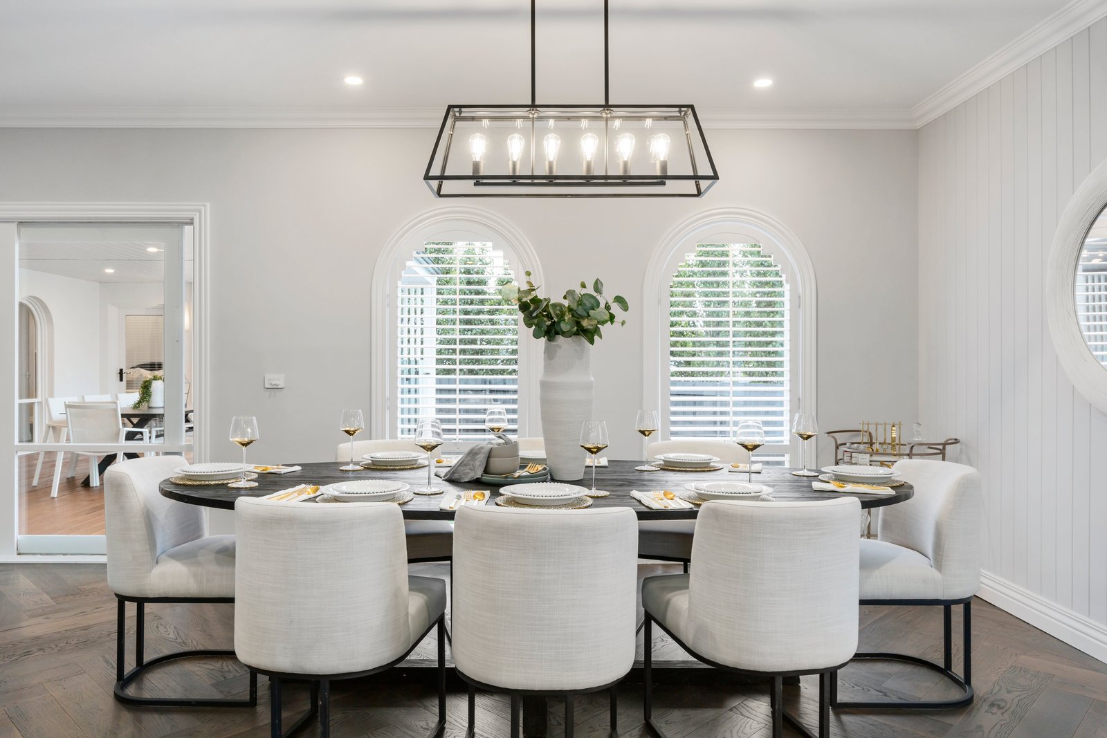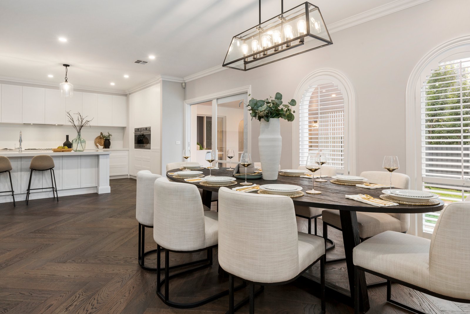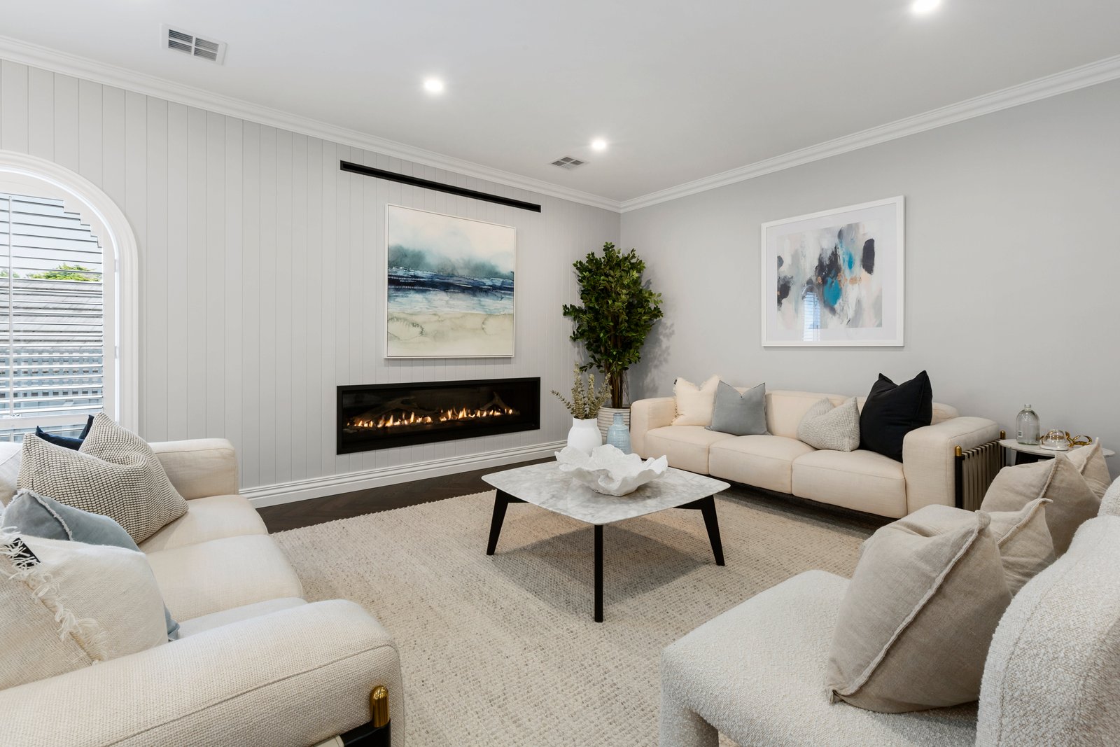 Endlessly elegant with a mix of full-height tiling and V-groove panelling for both dual-vanity bathrooms, chocolate Oak herringbone-parquetry floors plus the plushest carpets, and Michelangelo Quantum Quartz benchtops on custom cabinetry, the home’s interiors are meticulously detailed from an eye-catching farmhouse sink, to discreet anti-fog backlit mirrors, to super-wide 2m gas-fireplace topped by a high-tech Coolwall system to safeguard future media screens.