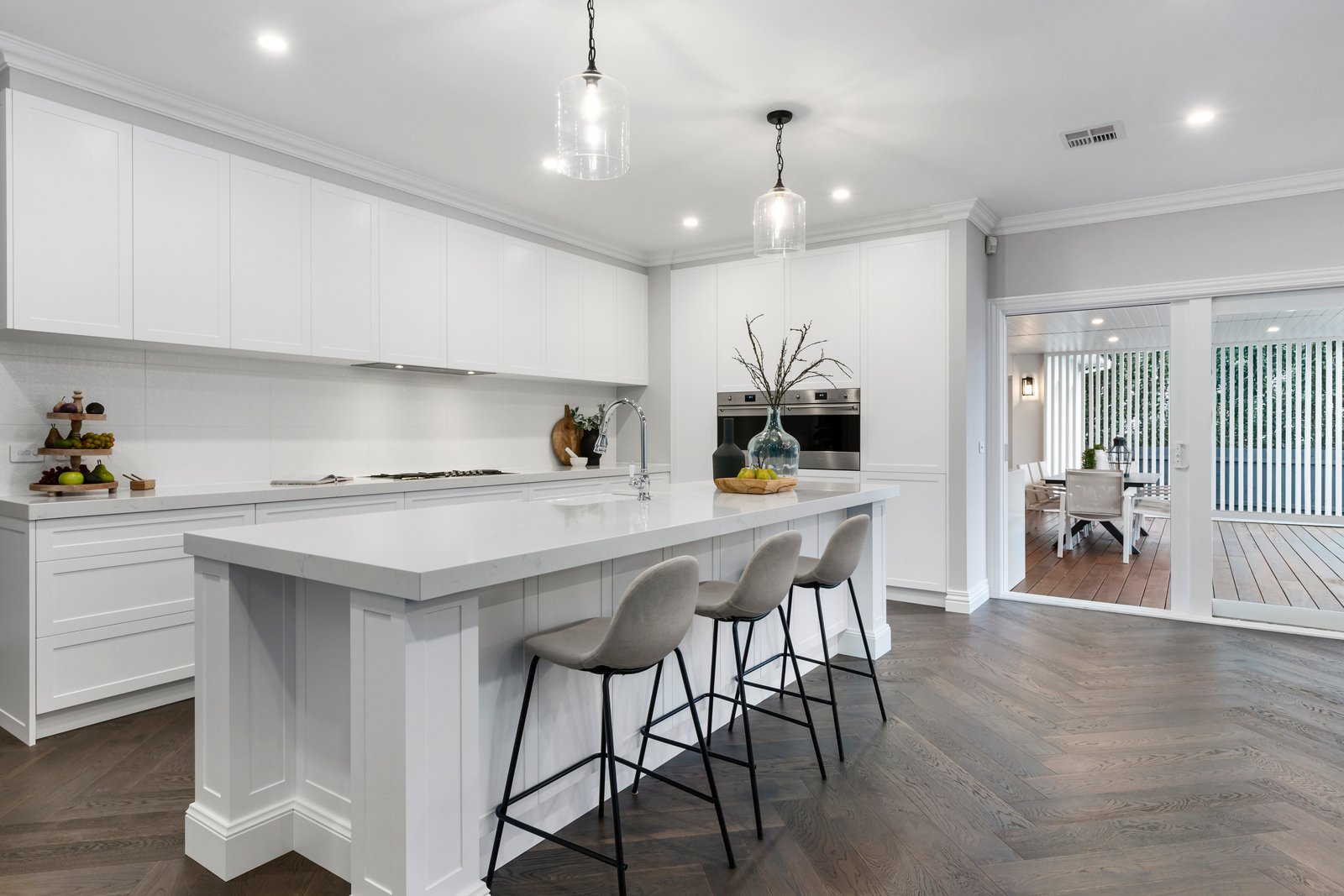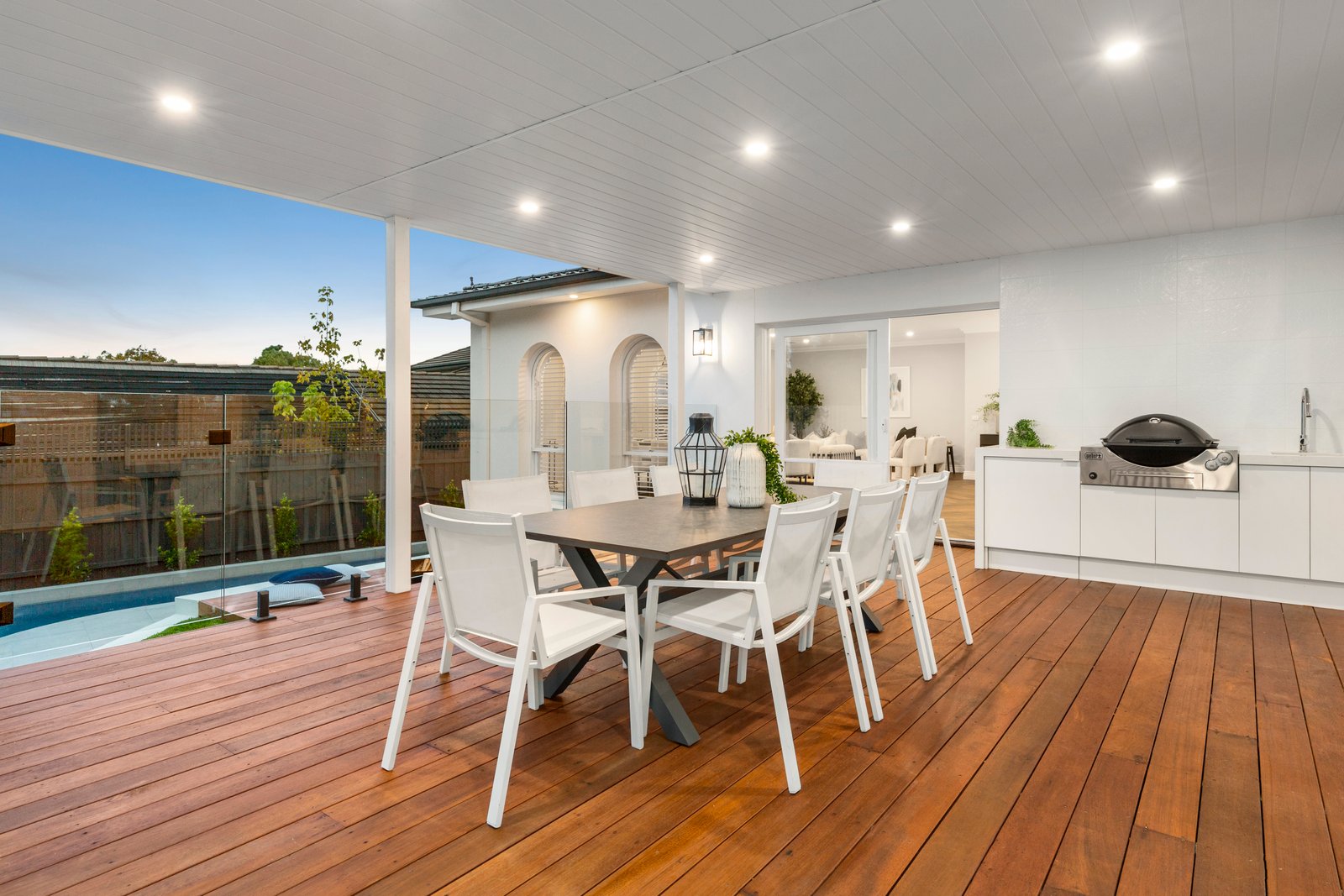 Expertly crafted with a state-of-the-art Smeg appliance kitchen (with dual ovens and two integrated dishwashers) centred on a grand 3m four-post island-bench, the home takes entertaining outside with a fully-plumbed al fresco kitchen (with Weber Family Q BBQ and bar-fridge) wrapped by waterfall-edge stone.