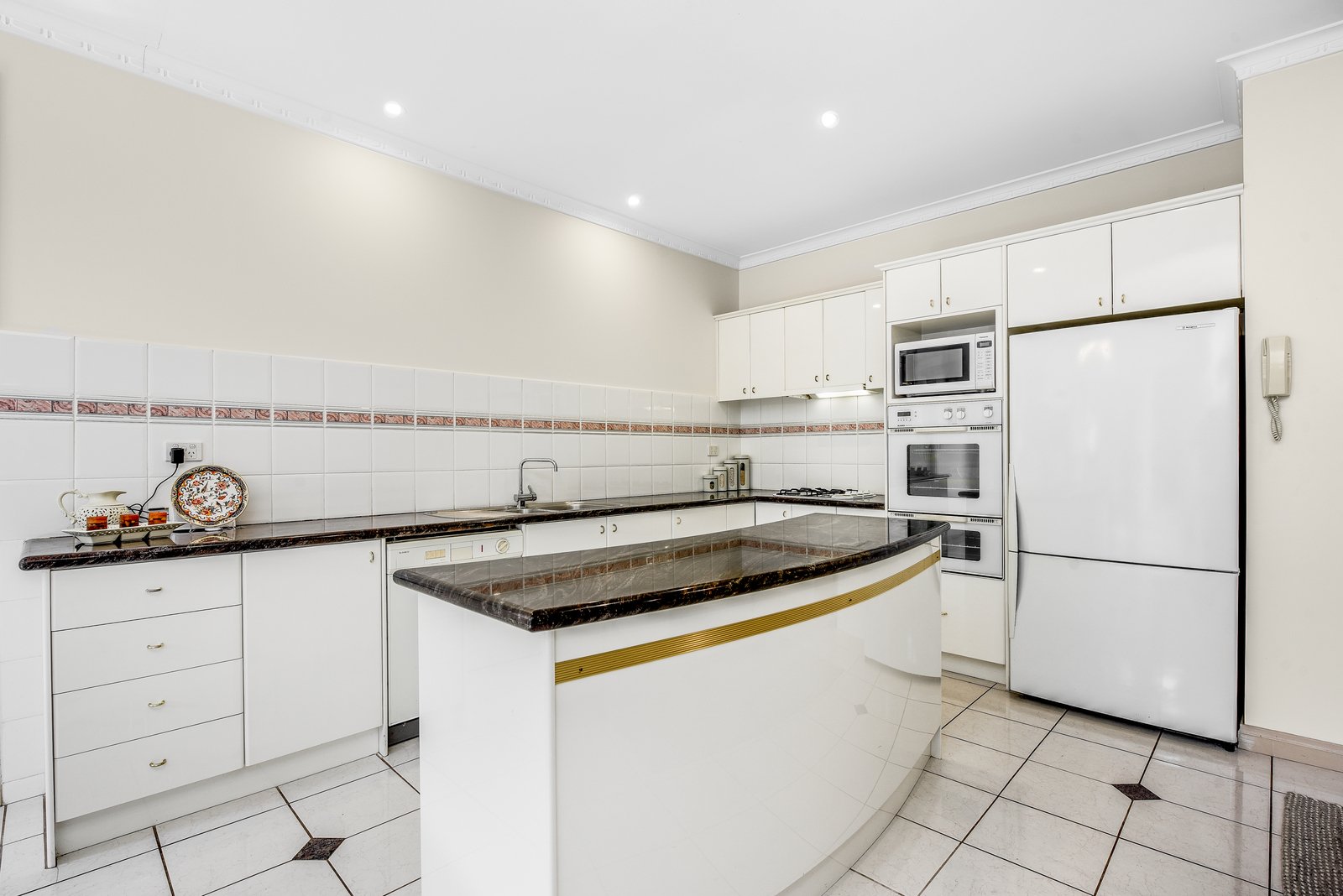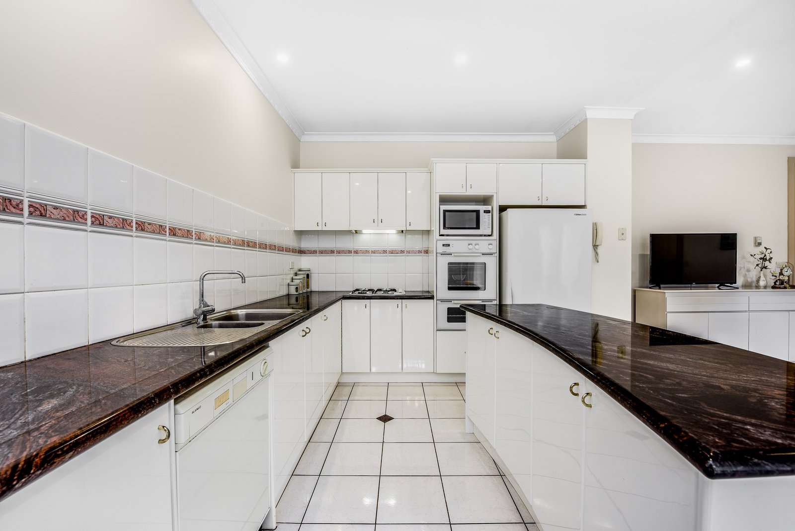 The modern kitchen includes a granite island-style bench, a gas cooktop, an electric wall oven, dishwasher and tile splashbacks for easy clean-up. Ample cabinet and granite bench space offer plenty of room for storage and meal prep - This is an above standard build.