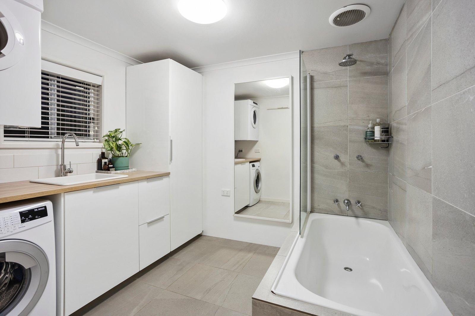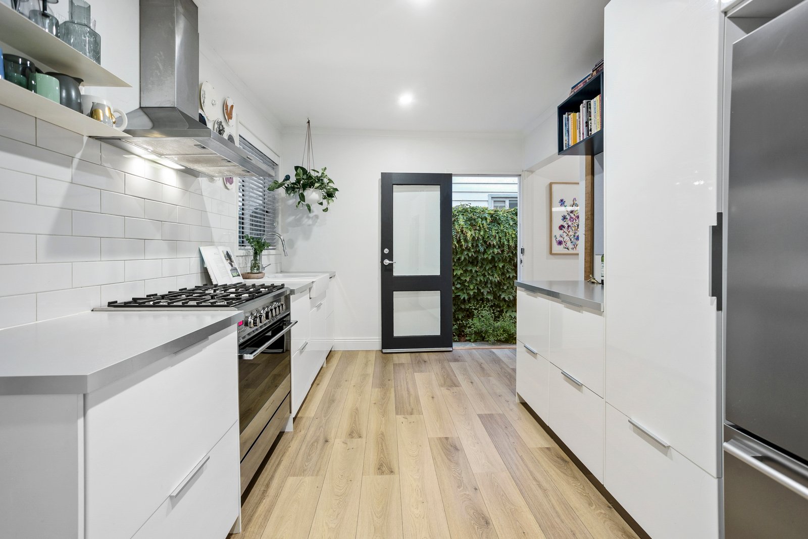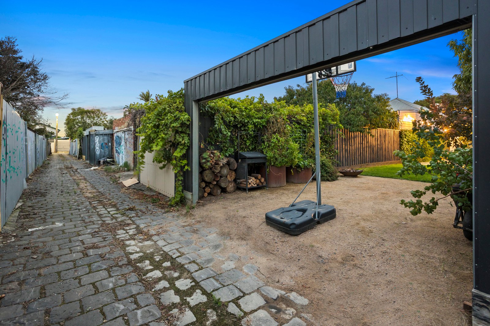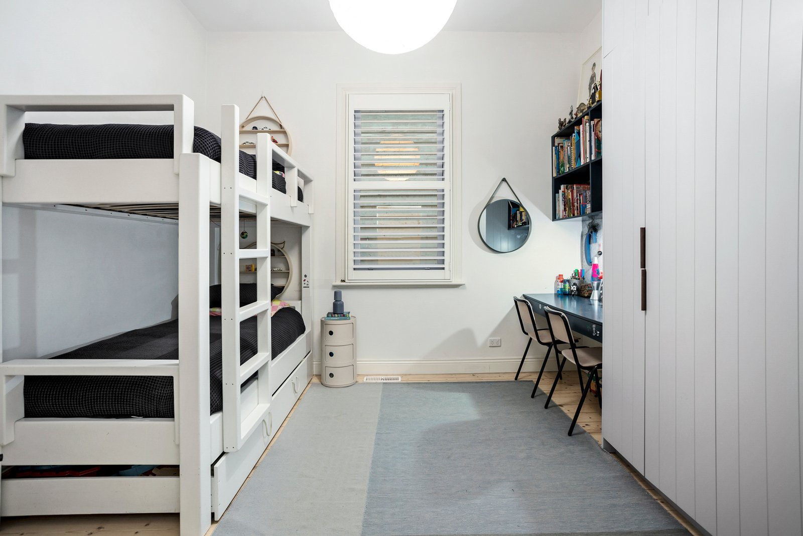 For convenience, there's rear lane access with an electronic double roller door, providing ample off-street parking. Inside, custom v-groove floor-to-ceiling joinery by Inner West Joinery offers plenty of storage space, including a built-in desk in the second bedroom.