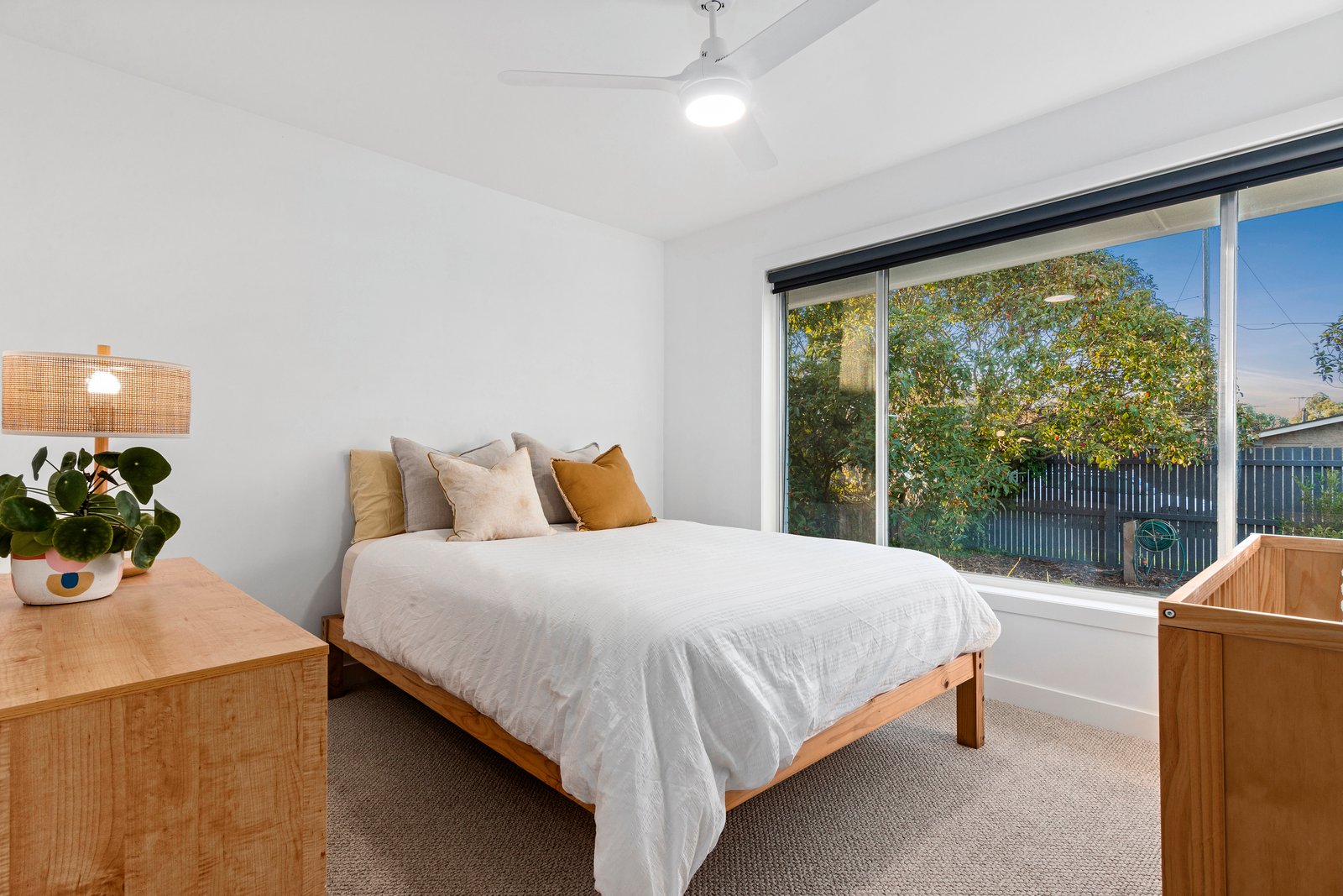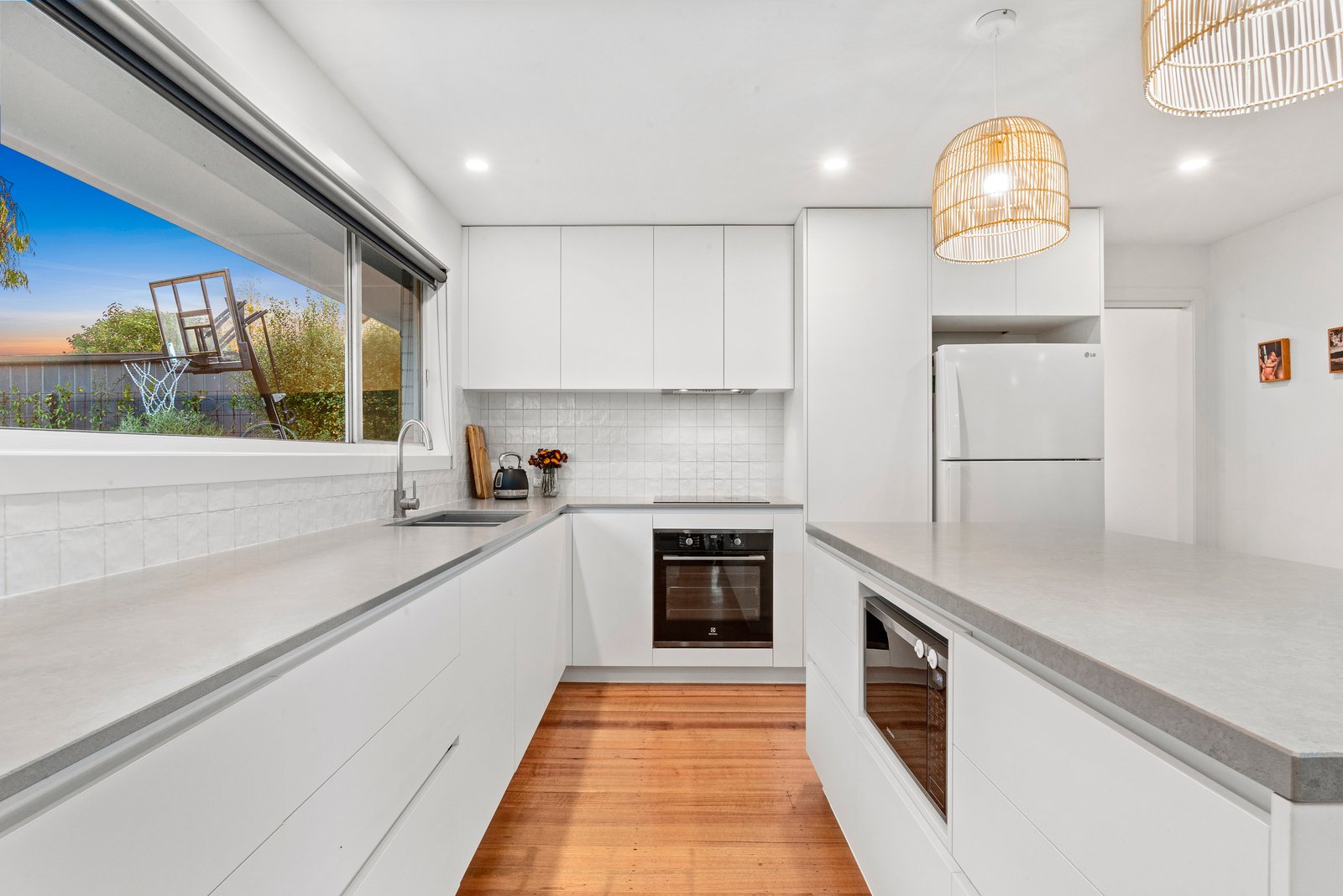 Polished floorboards and fresh white walls evoke a breezy ambience, with on-trend accents showcased throughout. The open plan living/dining/kitchen zone is awash in natural light, where you can relax by the gas log fireplace as you keep an eye on the kids playing outside. Just open the sliding door onto the covered alfresco deck, and the scene is set for casual gatherings with loved ones. The kitchen is beautifully appointed with concrete-look stone benchtops, clean-lined cabinetry and high-end appliances (integrated Bosch dishwasher, Electrolux oven, Electrolux induction cooktop).