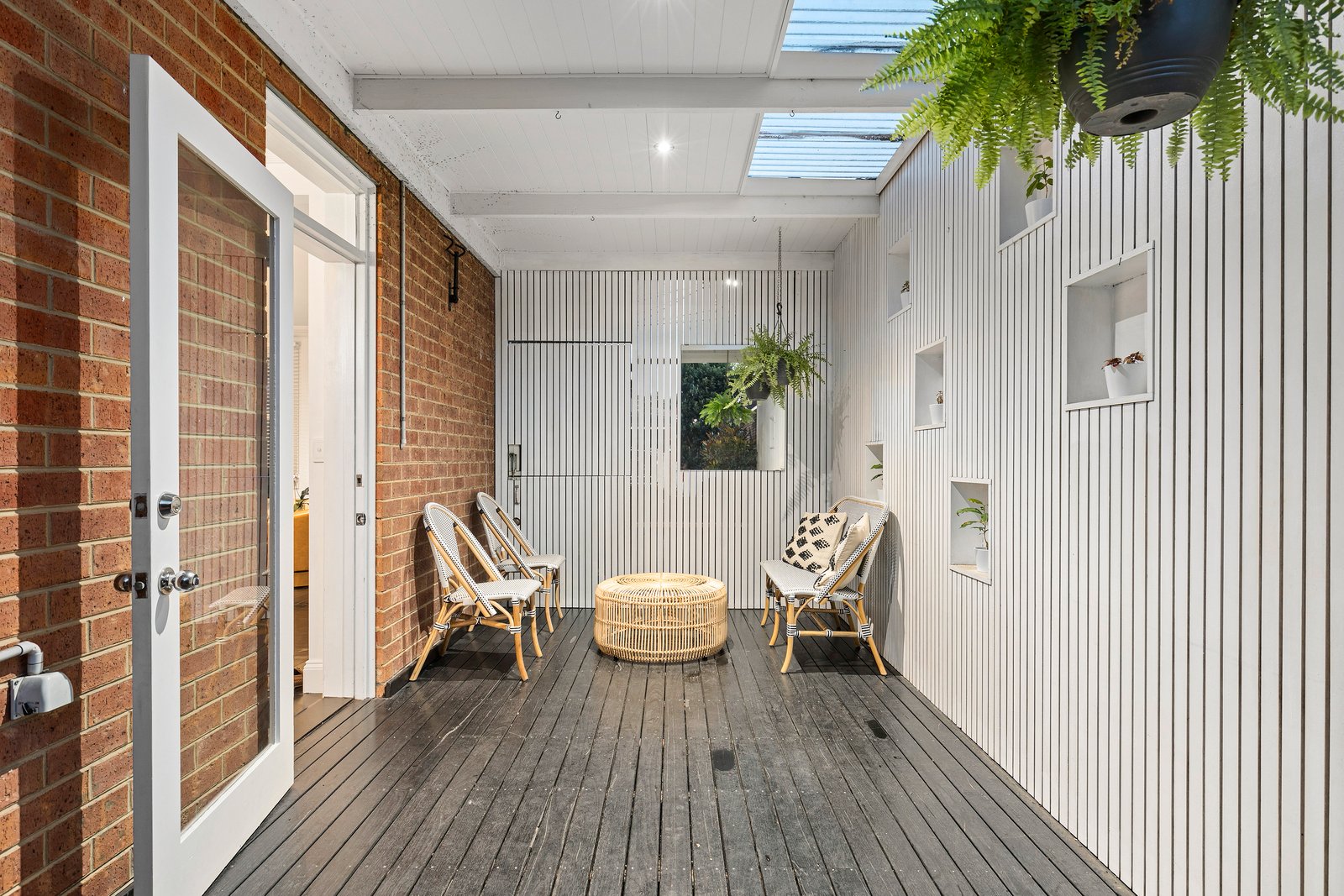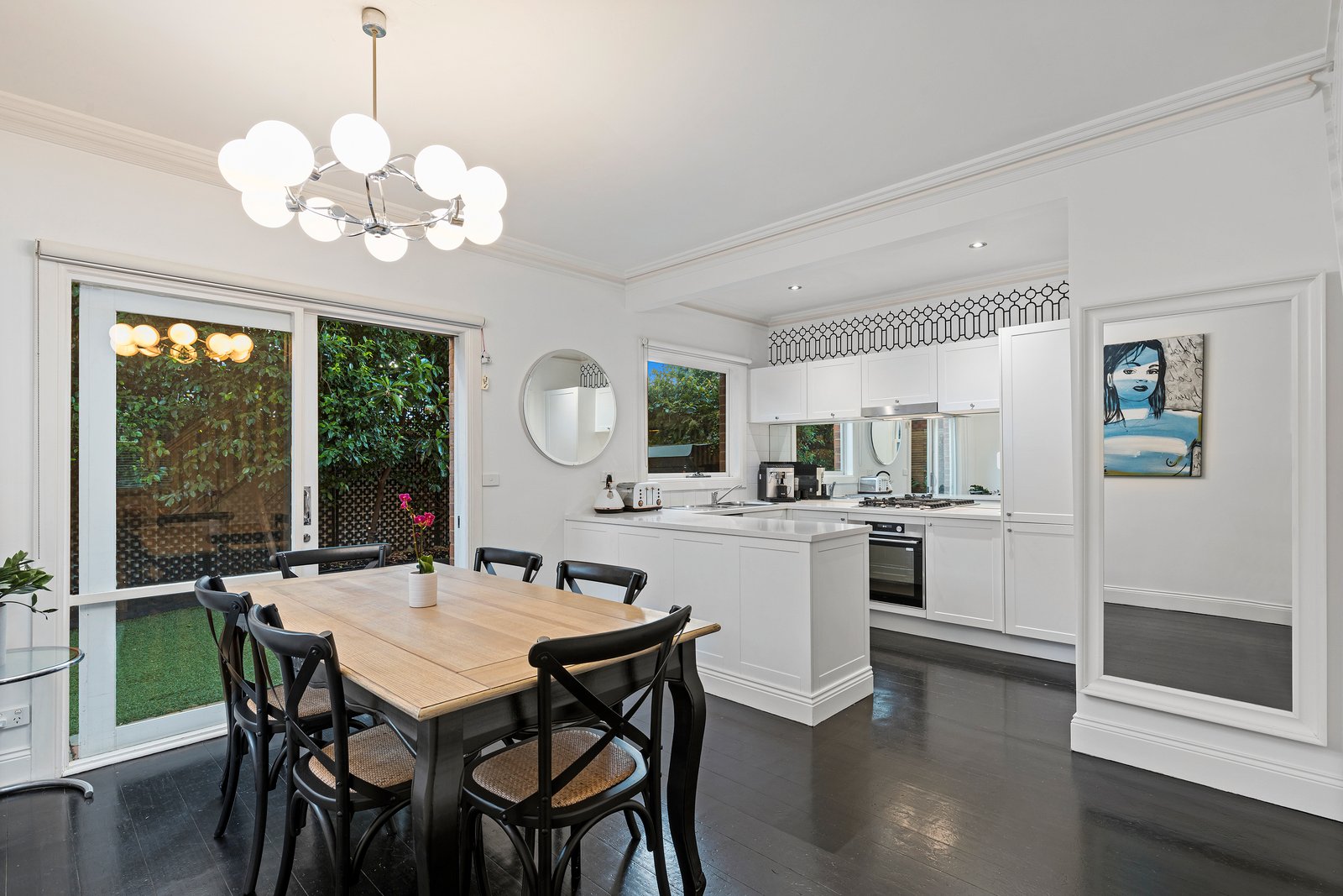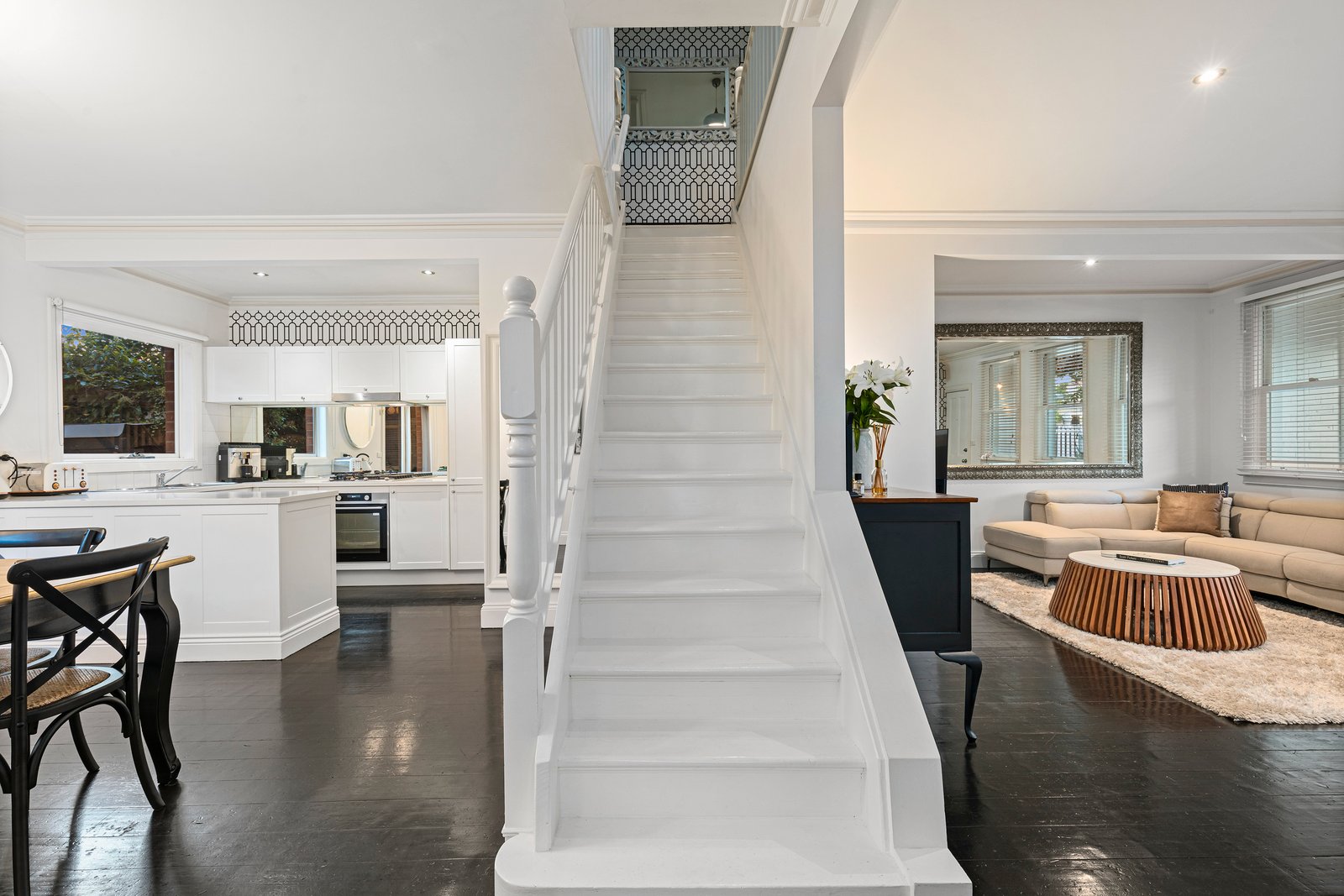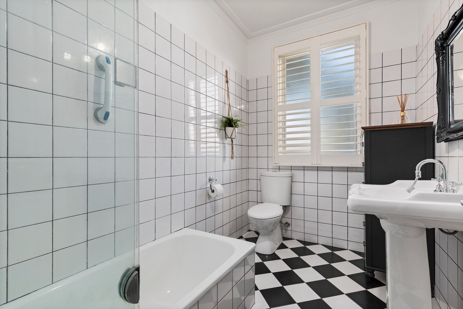Upstairs are three bedrooms, two with built-in-robes, and the generous master with a spacious walk-in-wardrobe. A central black-and-white bathroom with a bathtub oozes period charm and features a diamond-patterned tile floor.