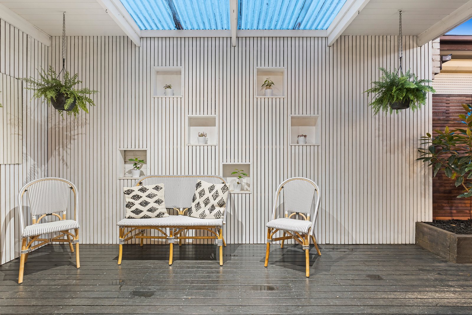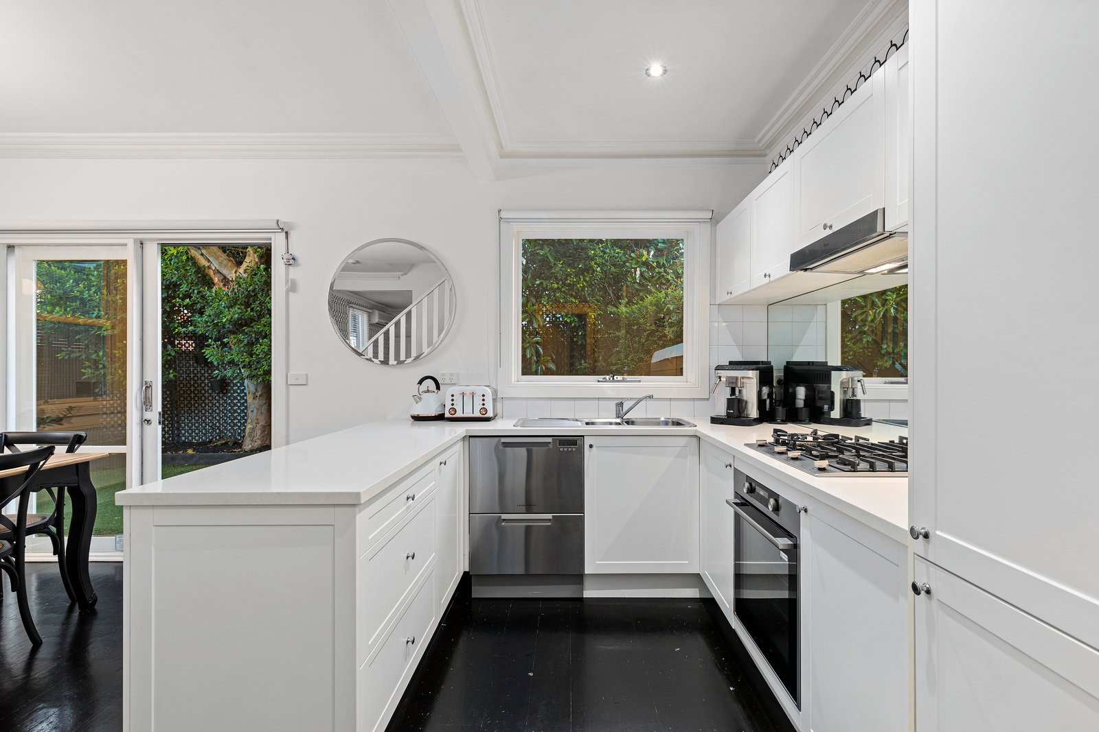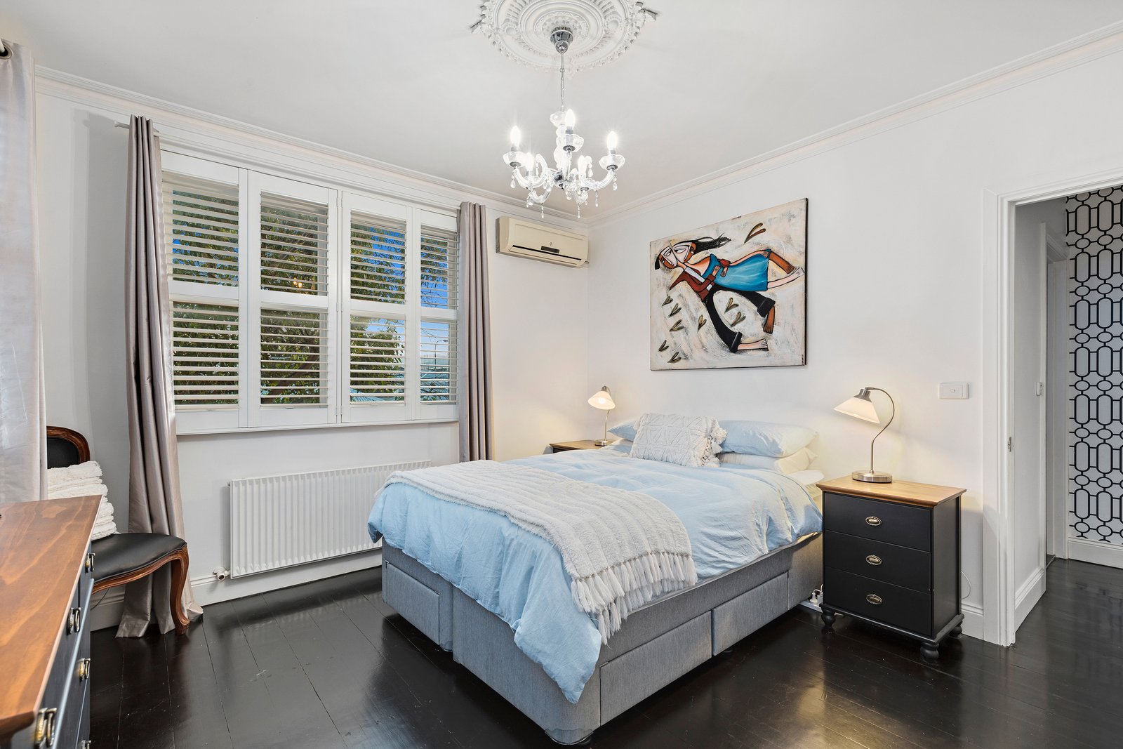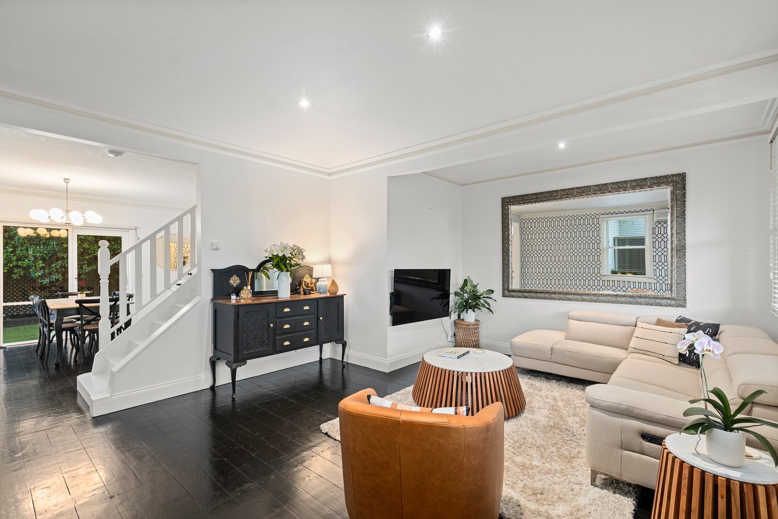 Upstairs are three bedrooms, two with built-in-robes, and the generous master with a spacious walk-in-wardrobe. A central black-and-white bathroom with a bathtub oozes period charm and features a diamond-patterned tile floor.