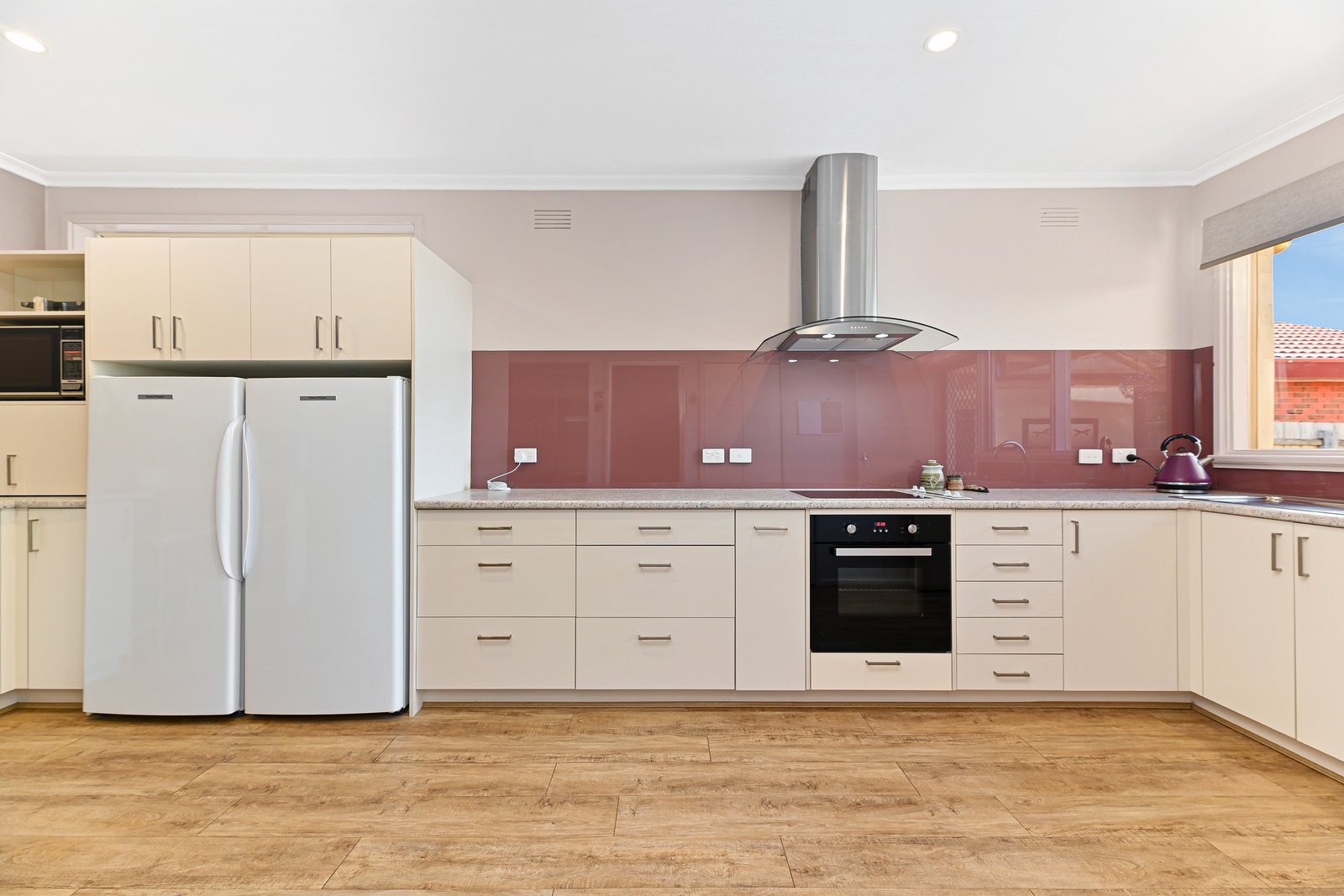 The spacious kitchen is a delight, with 40mm rounded-edge laminate countertops, a burgundy glass splashback, and plenty of cabinetry. The gourmet glass rangehood, 600mm electric oven, induction cooktop, and integrated dishwasher make life easy.