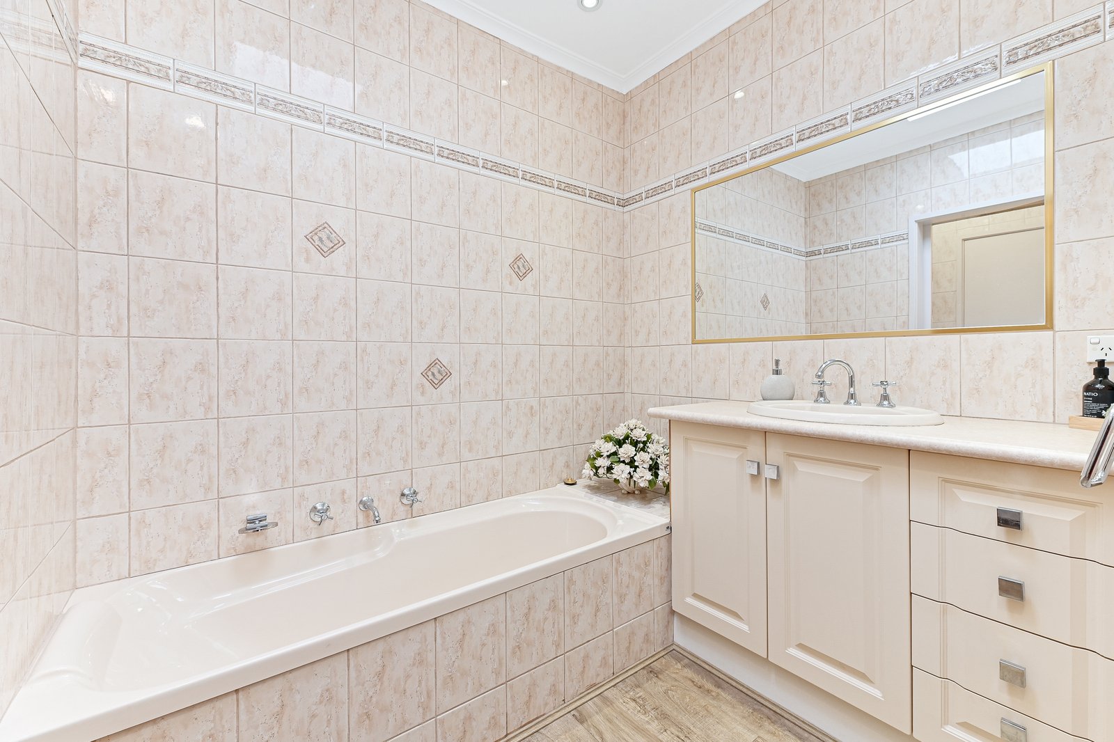 Three well-sized bedrooms enjoy plenty of built-in robe storage, while the main bathroom is elegantly presented in its amazing finish, showcasing full-height wall tiles, a tiled hob bathtub and generous vanity.