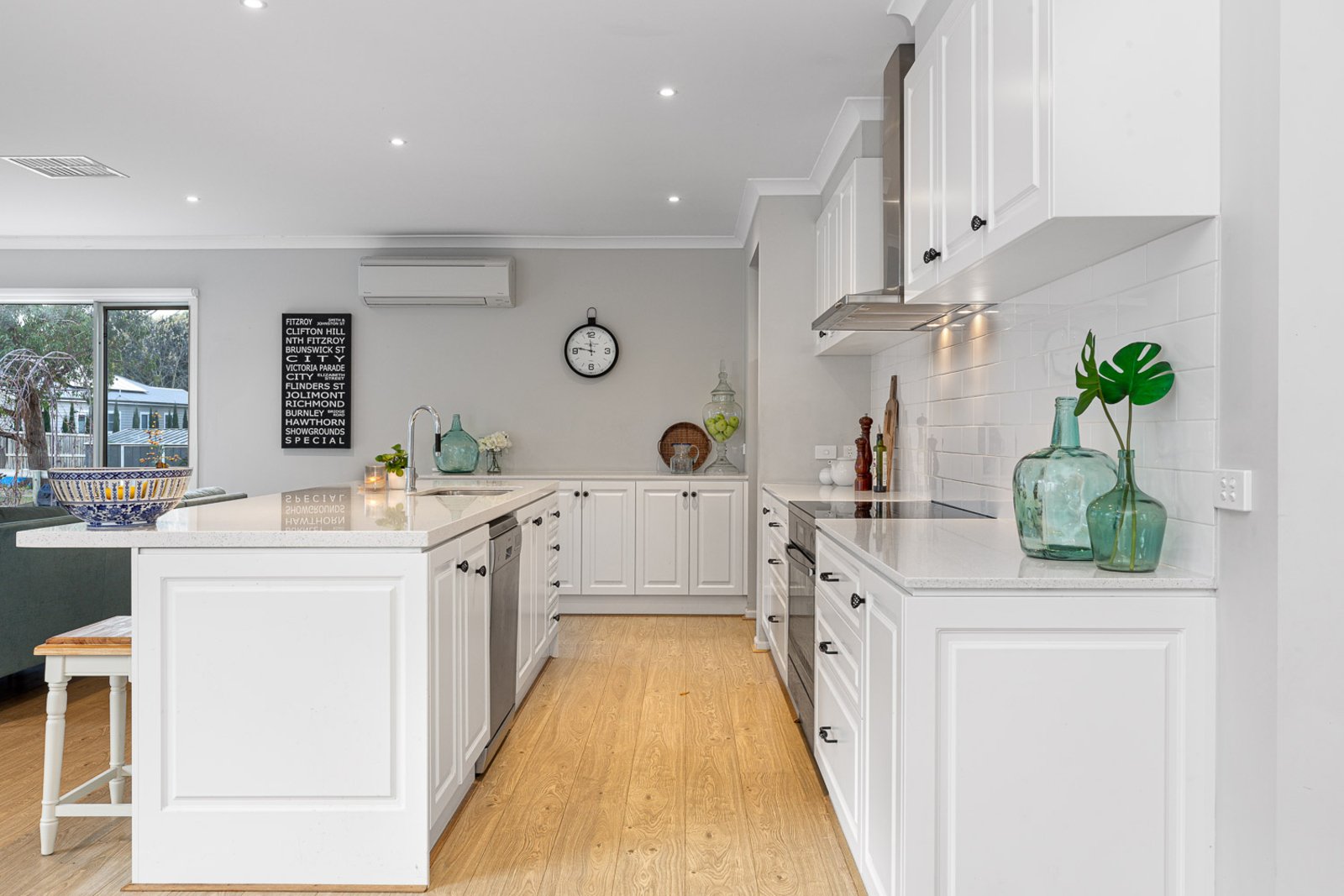 The heart of the home lies in the beautifully appointed kitchen, complete with induction stove, ample storage, and a breakfast bar for quick meals on the go. Immerse yourself in the joy of culinary creativity, preparing delicious meals to be shared with family and friends. There are four split systems, evaporative cooling and ample Solar Power to control down those bills.