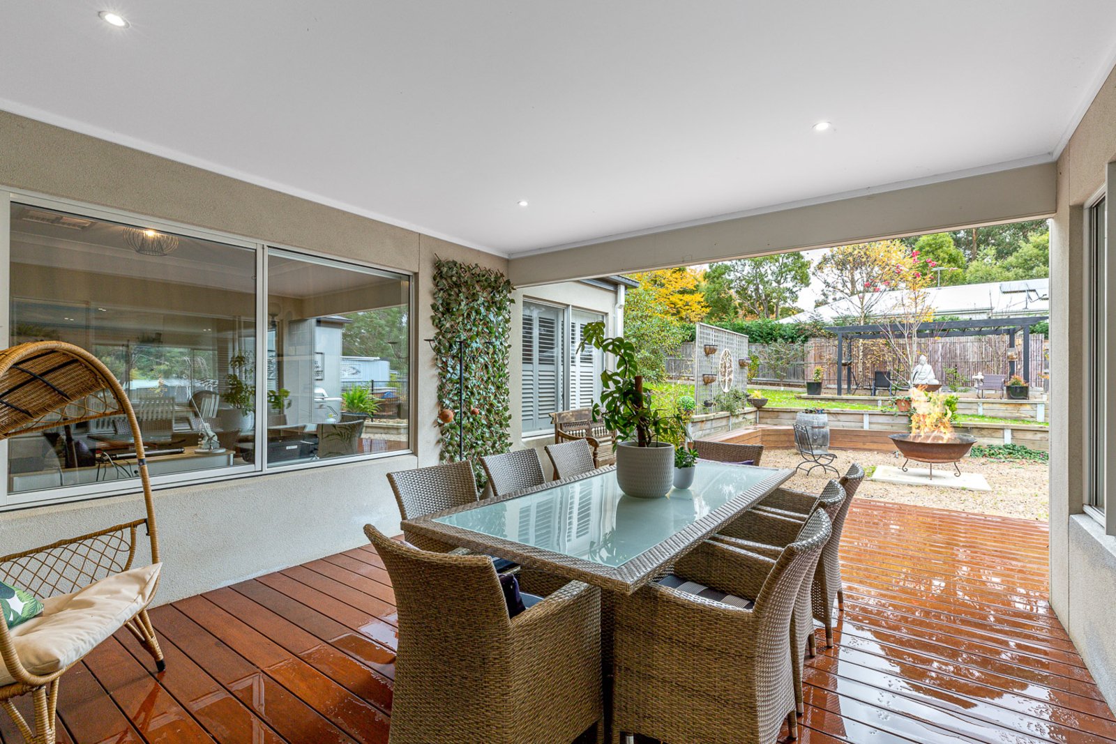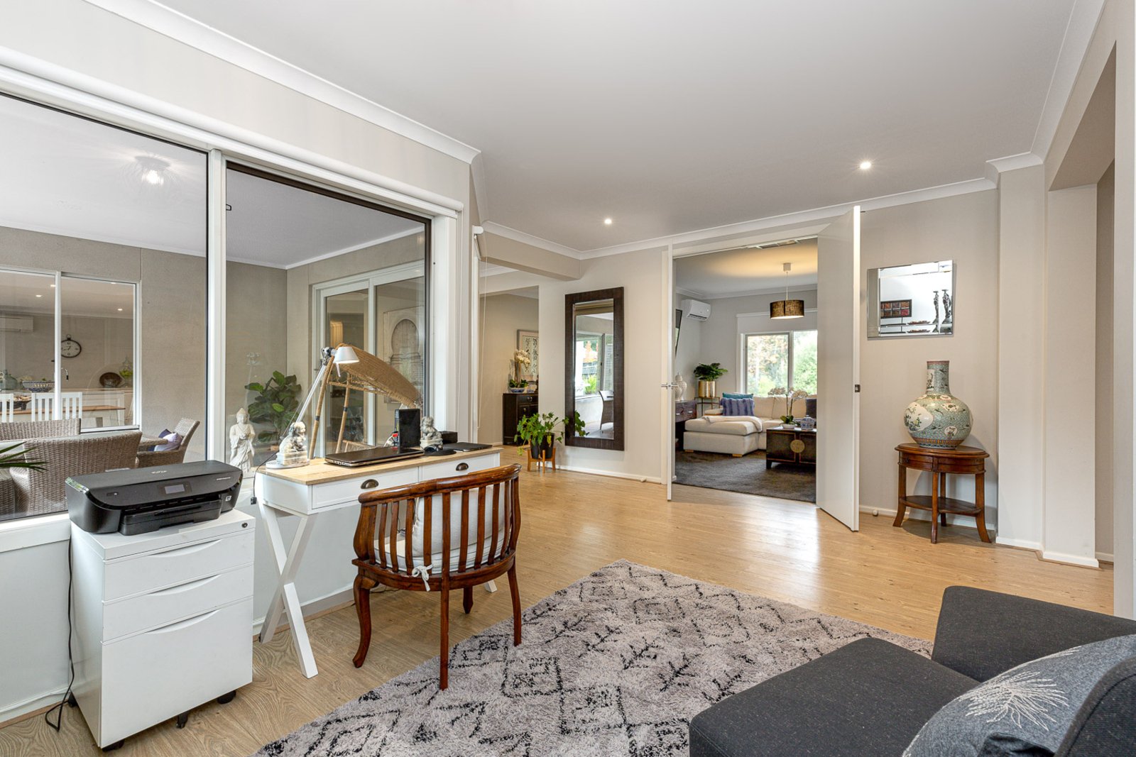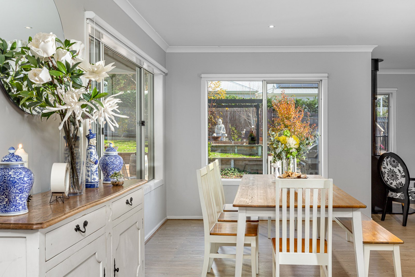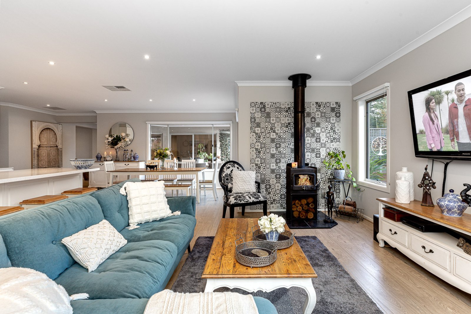 The spacious open-plan layout seamlessly connects the three living areas, creating an ideal space for family gatherings and entertaining guests. The living room exudes a cosy ambiance, complemented by the slow combustion heater, where you can unwind on chilly evenings. The adjoining dining area offers an inviting setting for formal dinners or casual brunches with loved ones.