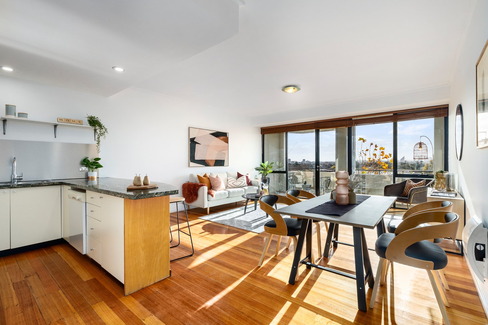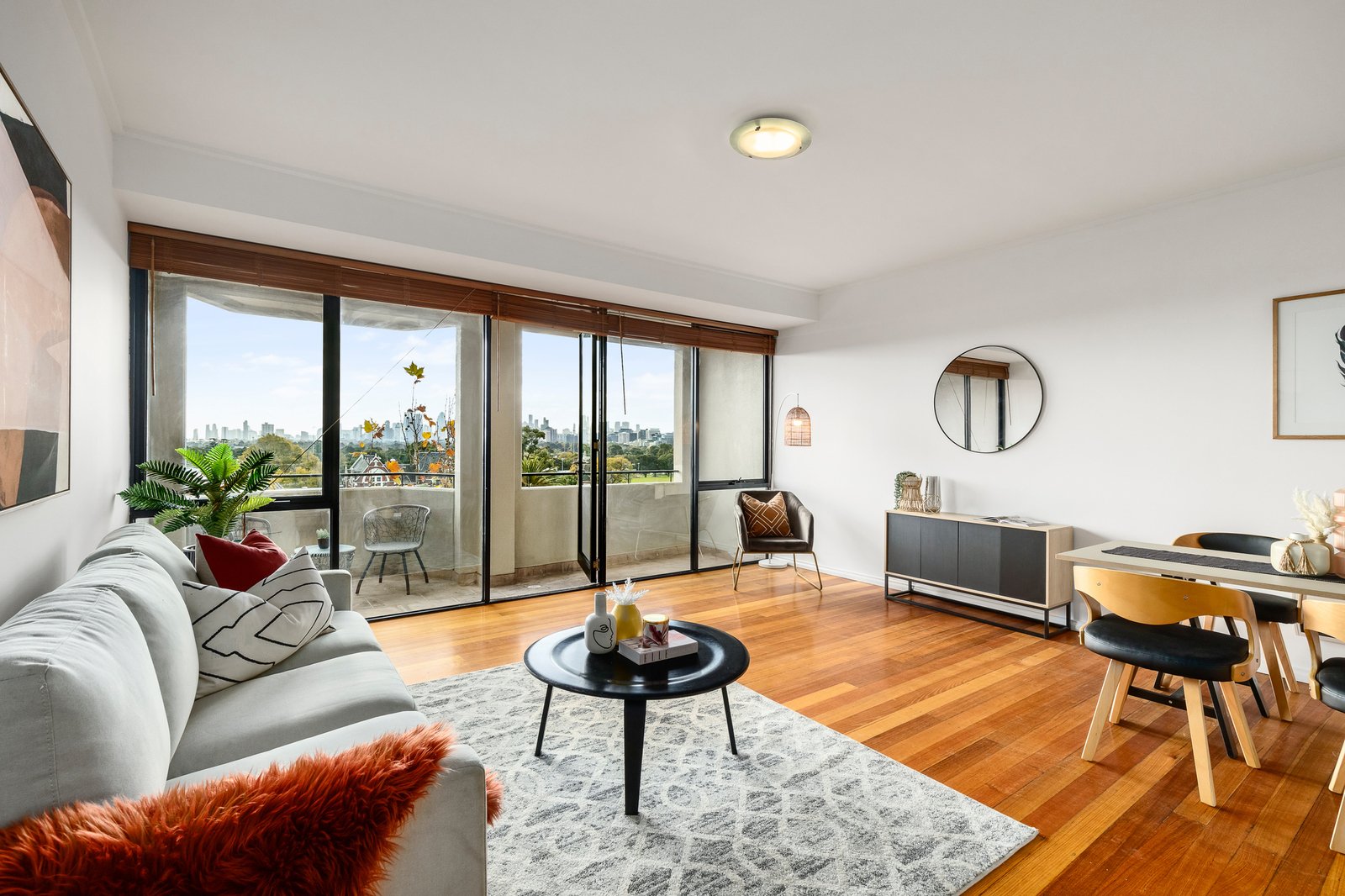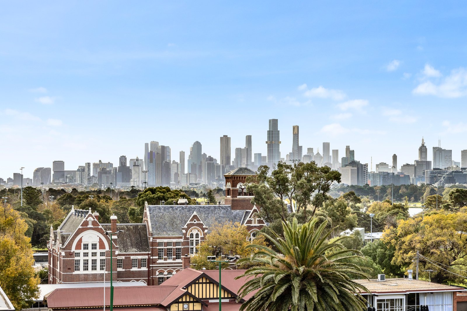Perched on the fourth level of 'The George Apartments' this vibrant two bedroom cityscape is framed by breathtaking views and offers a lifestyle opportunity like no other. A welcoming entrance hall opens onto a north/east facing living and dining room, flowing effortlessly onto the covered balcony, providing a year-round setting to entertain with views of the bay, Albert Park’s greenery and St Kilda Cricket Ground.