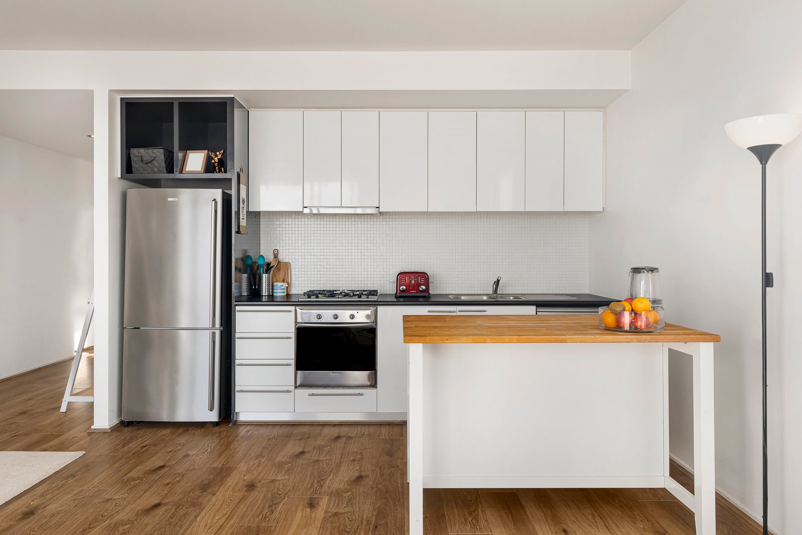 • Sleek kitchen with stainless steel appliances, dishwasher and modern tiled splashbacks