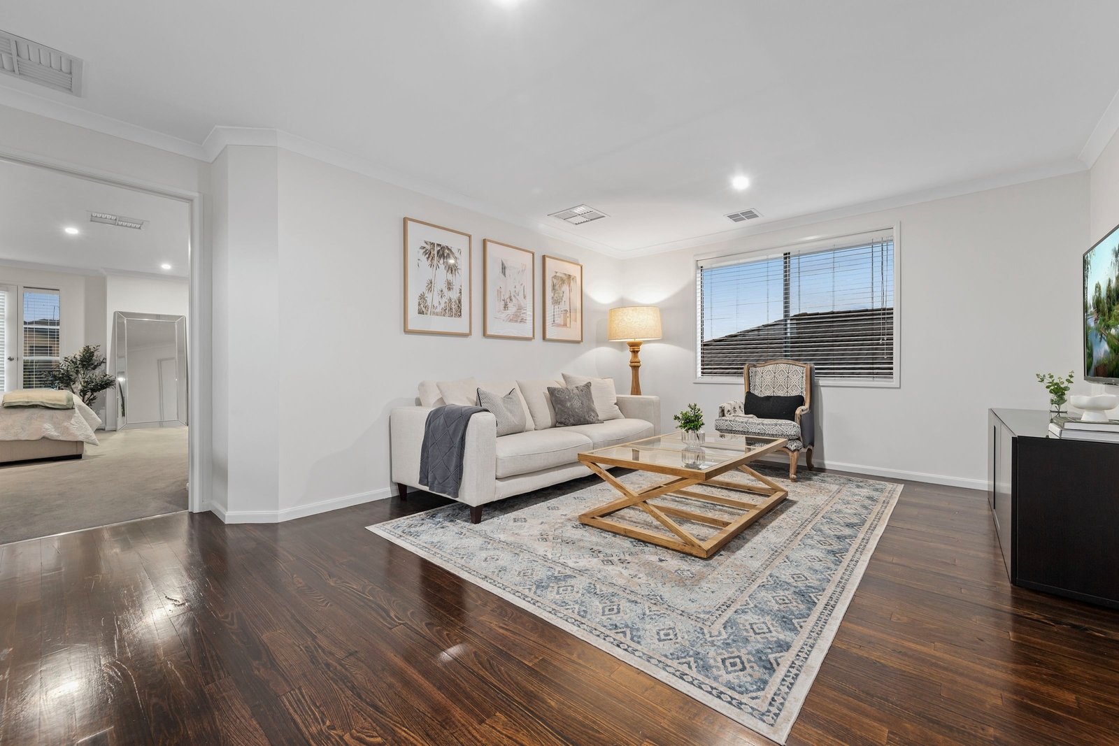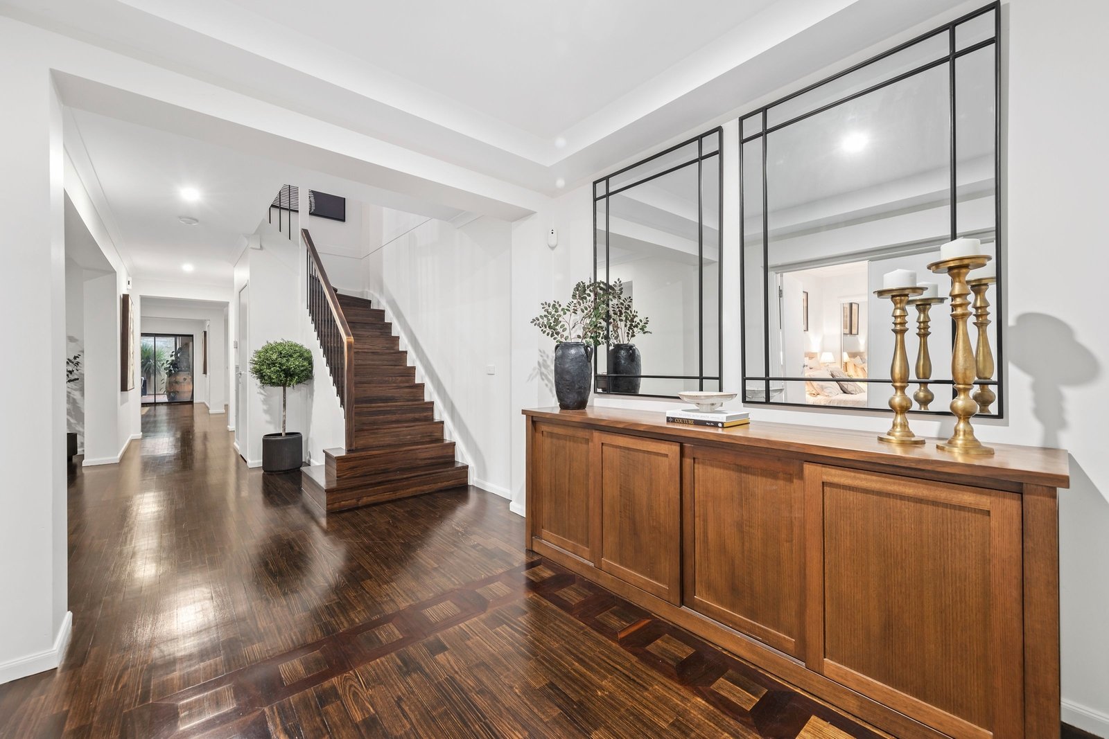 The home begins with a bright ground-floor bedroom or home office with mirrored built-in robes that will cater to the most discerning families. While a formal lounge or dining area draped with soft sheers provides the adaptable space and refuge many families seek.