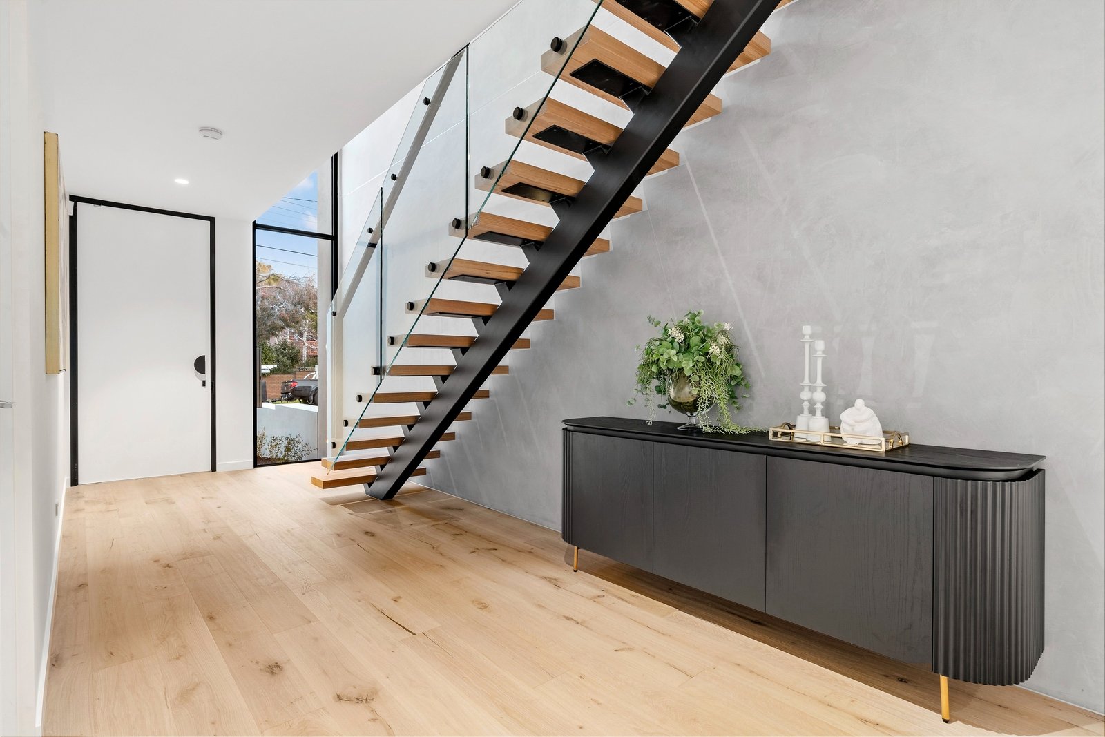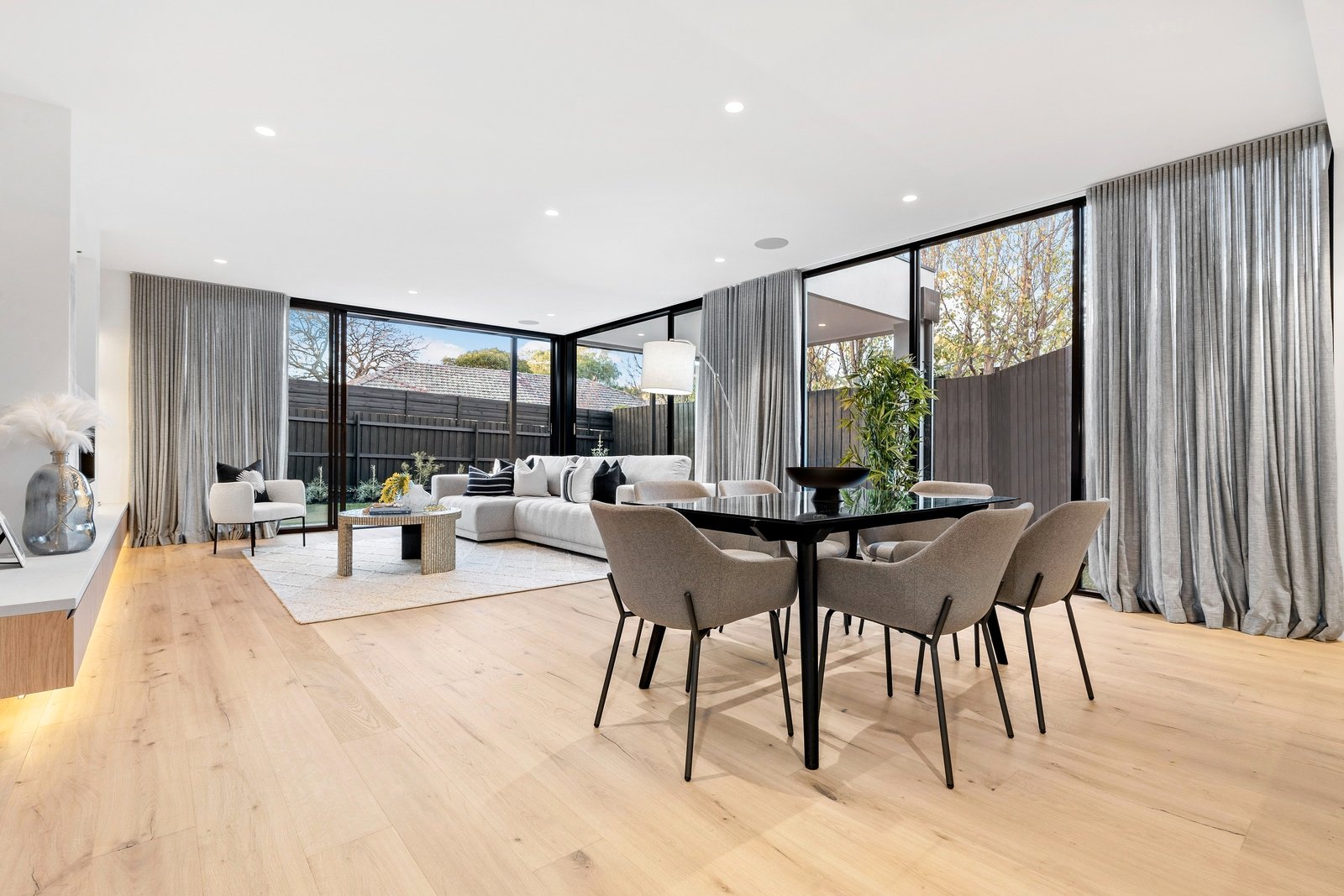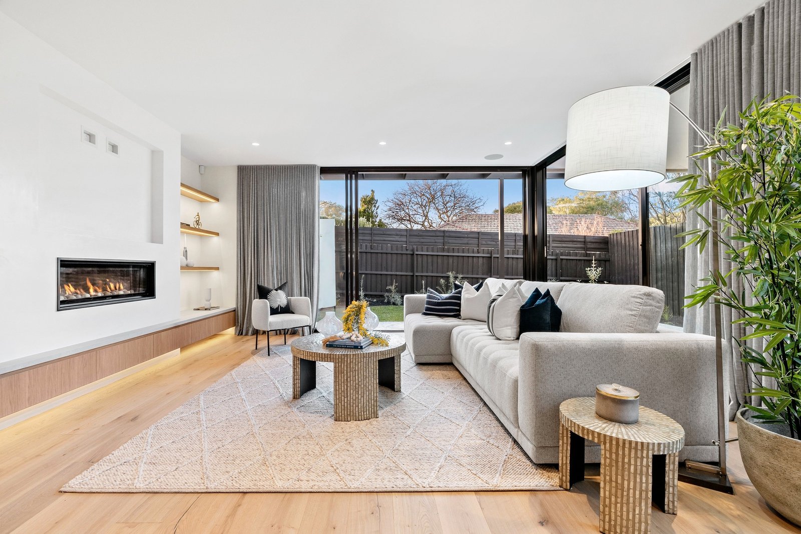 Commanding attention with its towering facade of striking black and Venetian plaster softened by creamy sandstone, this colour palette is an enduring theme through the gorgeous interiors. The entrance is breathtaking, featuring a double height void with more Venetian plaster and expanses of glass contrasting with stretches of pale oak, but it is the rear entertaining zone which raises the bar to extraordinary heights. Here, the Dolomite Super-white granite kitchen is appointed with premium Miele appliances including twin ovens and an integrated dishwasher, its curvaceous island bench featuring on-trend contoured accents. A northerly orientation floods the expansive living and dining zone (with gas fireplace and floating entertainment unit) with the purest natural light - two banks of floor-to-ceiling sliders can be thrown back to blend indoors with the landscaped garden where a sleek alfresco area sets the scene for outdoor entertaining and ample green grass provides space for kids as well as scope to add a pool if desired (STCA).
