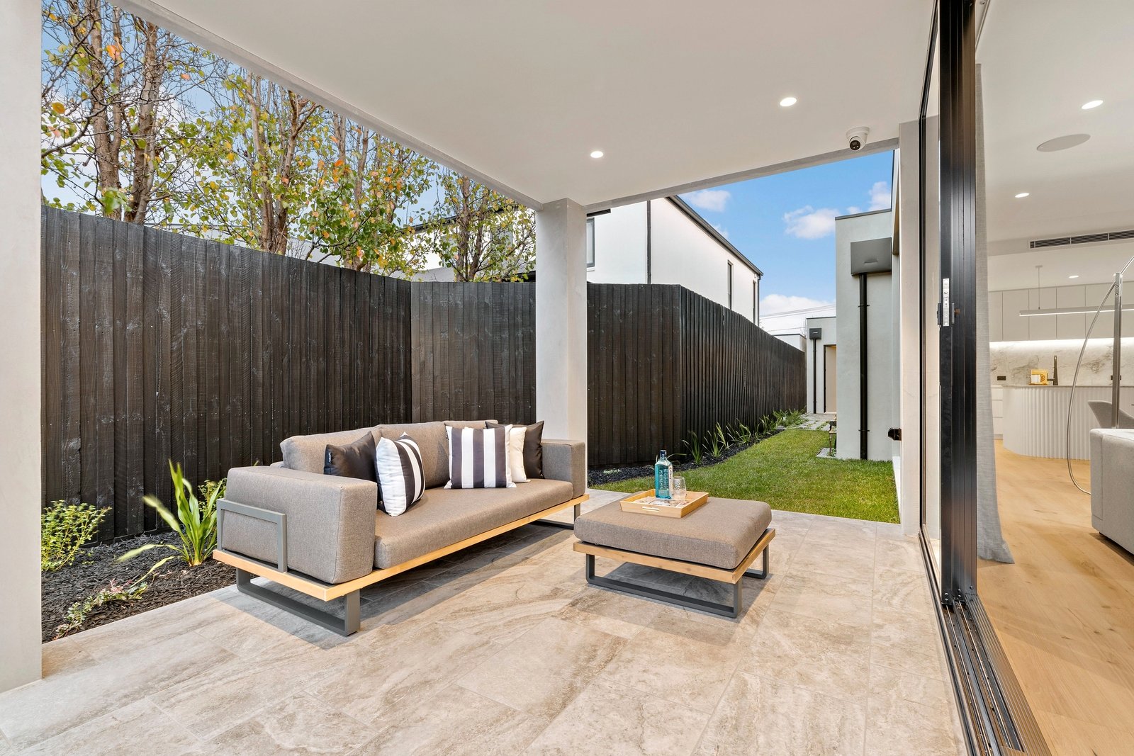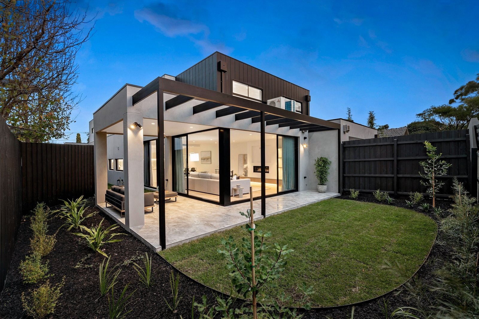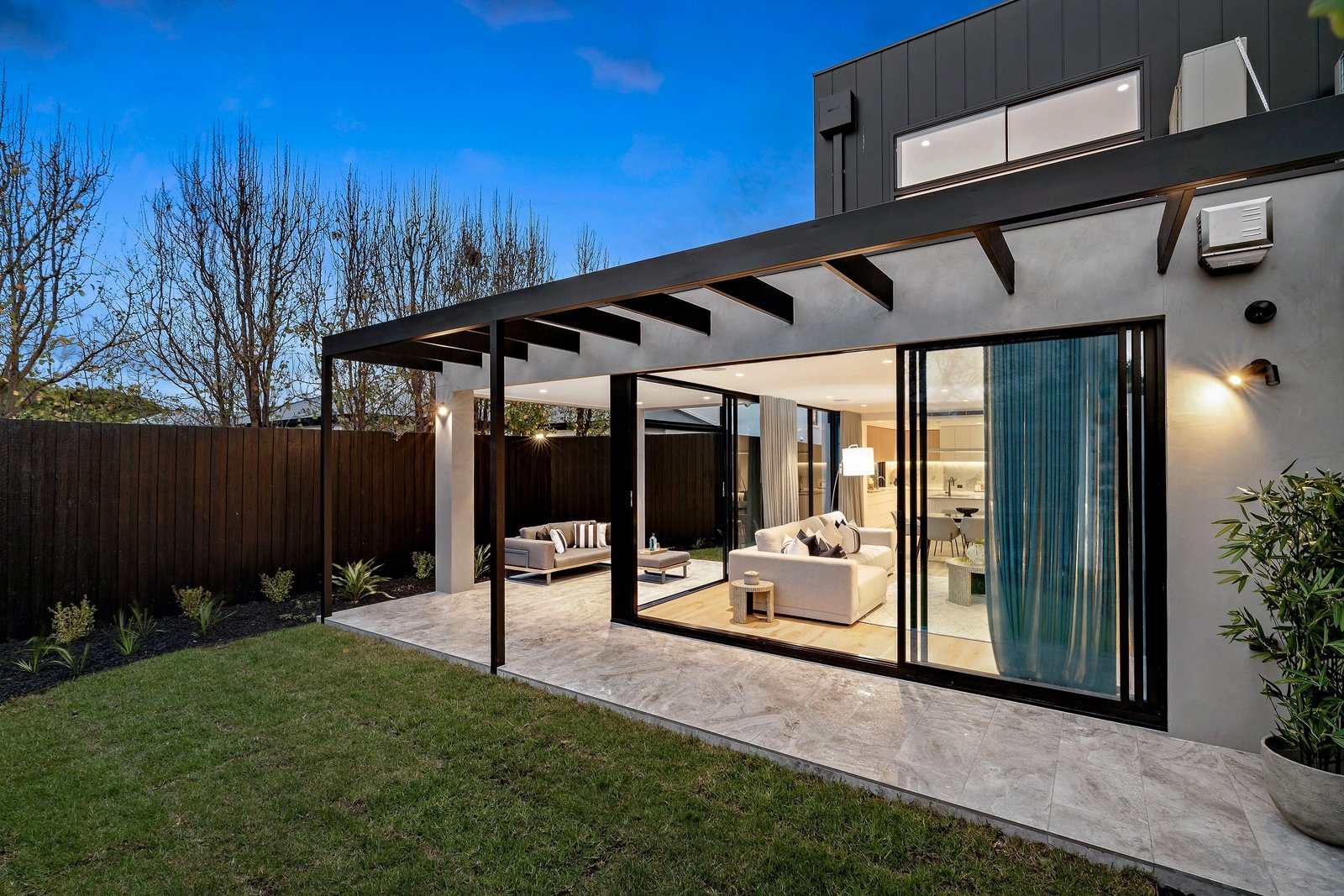 Commanding attention with its towering facade of striking black and Venetian plaster softened by creamy sandstone, this colour palette is an enduring theme through the gorgeous interiors. The entrance is breathtaking, featuring a double height void with more Venetian plaster and expanses of glass contrasting with stretches of pale oak, but it is the rear entertaining zone which raises the bar to extraordinary heights. Here, the Dolomite Super-white granite kitchen is appointed with premium Miele appliances including twin ovens and an integrated dishwasher, its curvaceous island bench featuring on-trend contoured accents. A northerly orientation floods the expansive living and dining zone (with gas fireplace and floating entertainment unit) with the purest natural light - two banks of floor-to-ceiling sliders can be thrown back to blend indoors with the landscaped garden where a sleek alfresco area sets the scene for outdoor entertaining and ample green grass provides space for kids as well as scope to add a pool if desired (STCA).