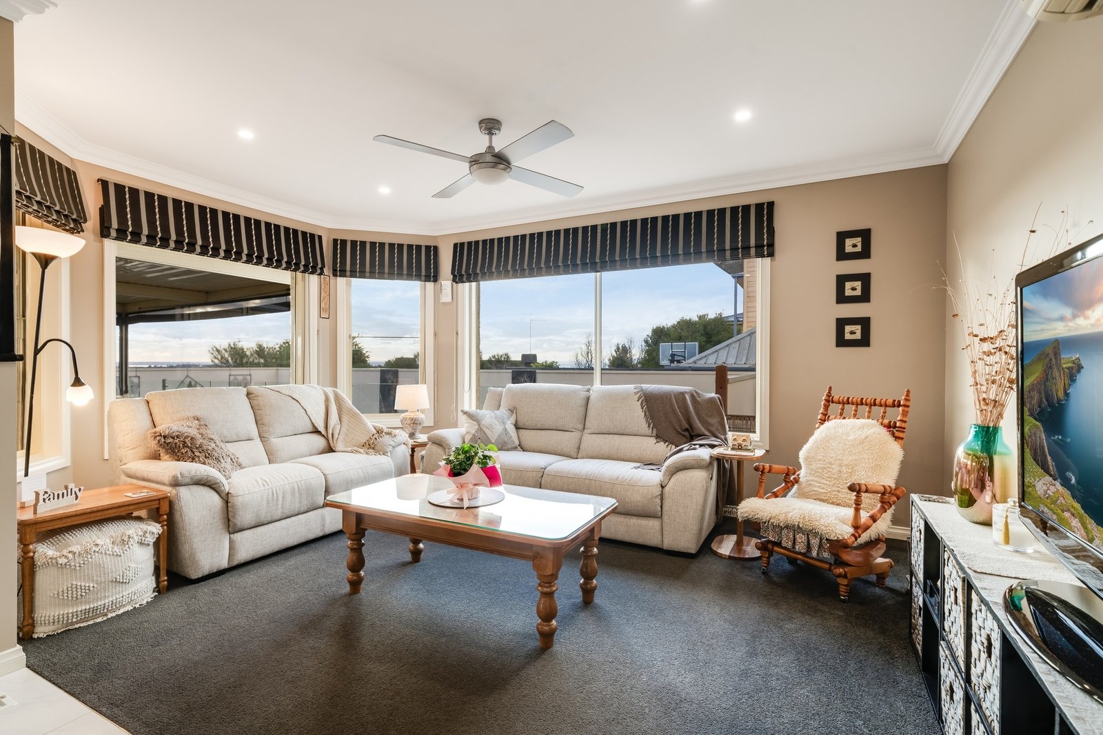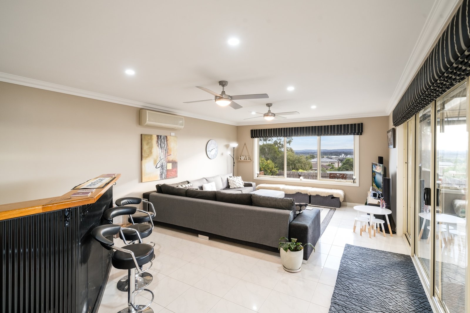 • Ceiling fans in all living areas and bedrooms, reverse cycle air conditioners in upstairs bedrooms and 2 of the downstairs living areas.