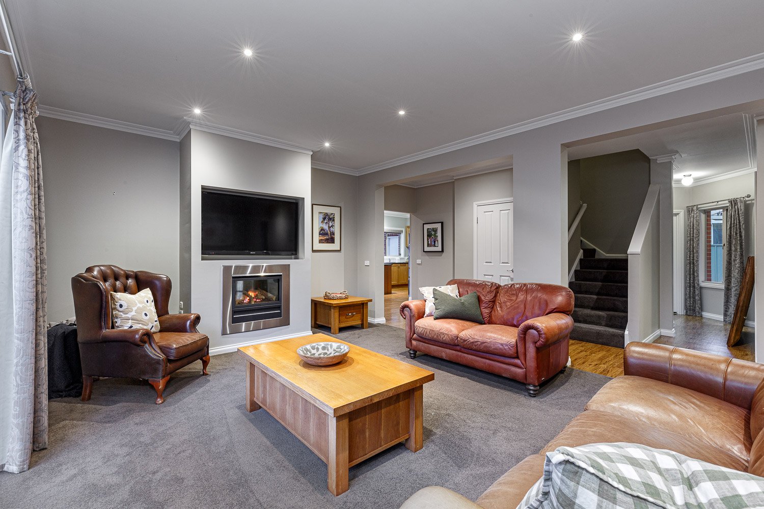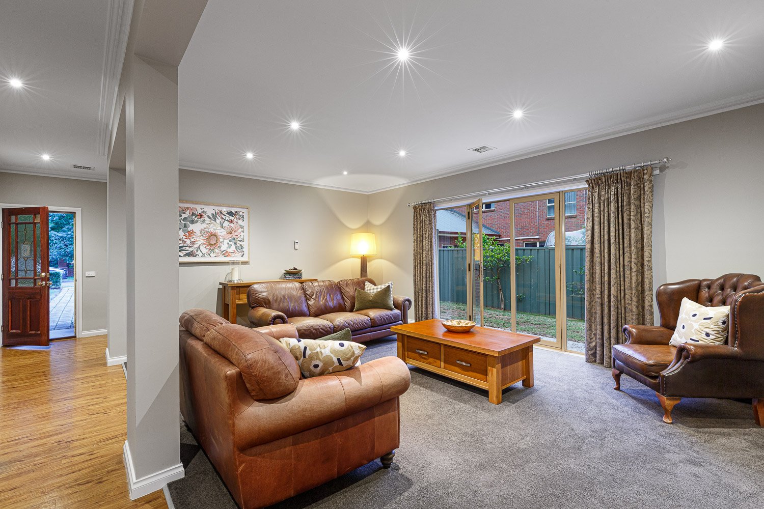 - Formal living area complete with gas log fire and double glass doors that open onto a north facing garden.