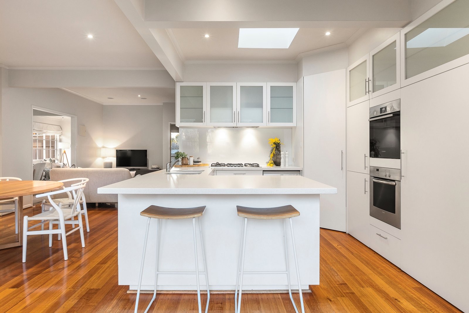 Brimming with street presence, a smartly rendered fence and facade set the tone for this private and secure home set amidst established gardens. Original rooms host an expansive formal lounge (open fireplace) and dining room that flows through to open-plan family living. A sizable kitchen sparkles beneath a luminous skylight, while wrap-around stone benches complement integrated Bosch appliances and volumes of custom storage including a walk-in pantry.