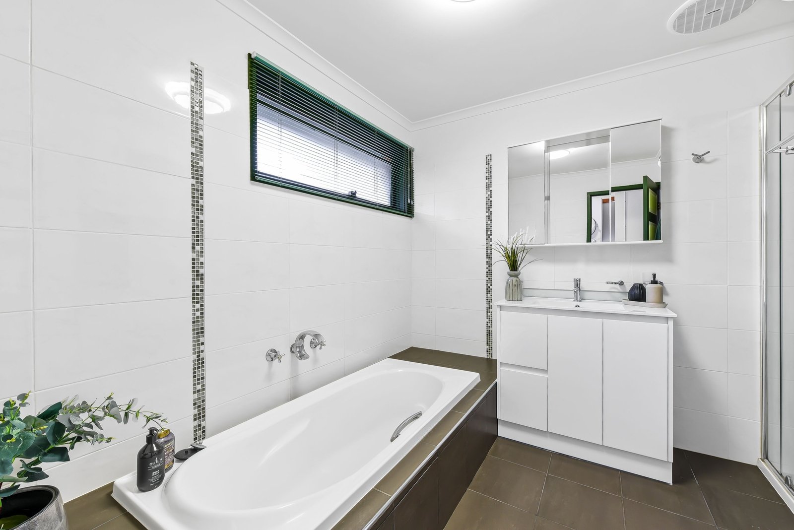 Four well-appointed bedrooms with unique garden view each offer spacious built-in robes and showcase the same attention to detail as the rest of the home. The master bedroom vaunts a walk-in robe and private ensuite with a frameless shower and stunning 2000mm high sparkling wall tiles. The main bathroom is equally elegant, adding a tiled hob bathtub.