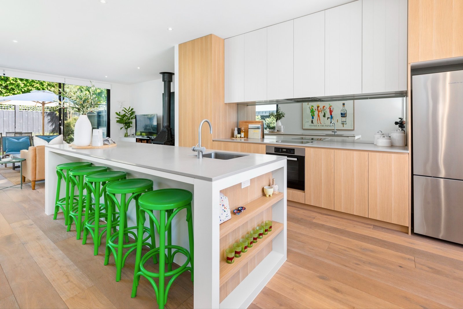 Immersed in unexpected privacy mere metres from village convenience, its open-plan design is defined by soaring square-set ceilings, engineered Oak flooring and refined touches of steel and stone, accentuating its vibrant approach to lifestyle living. A stone-topped kitchen features integrated Miele appliances and a buffet island between the living and dining zones, kept romantically warm with a Chiminees Philippe wood heater.