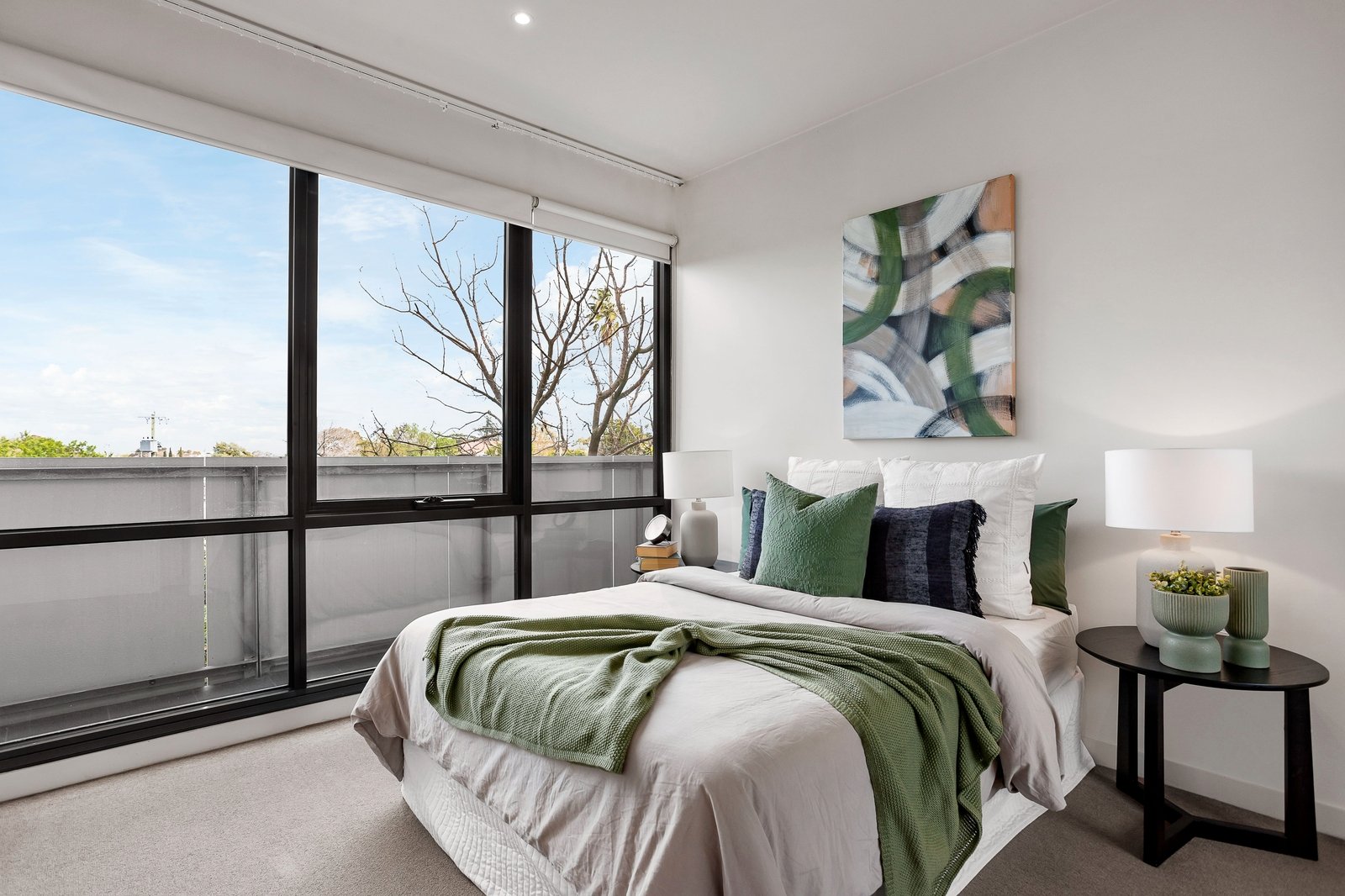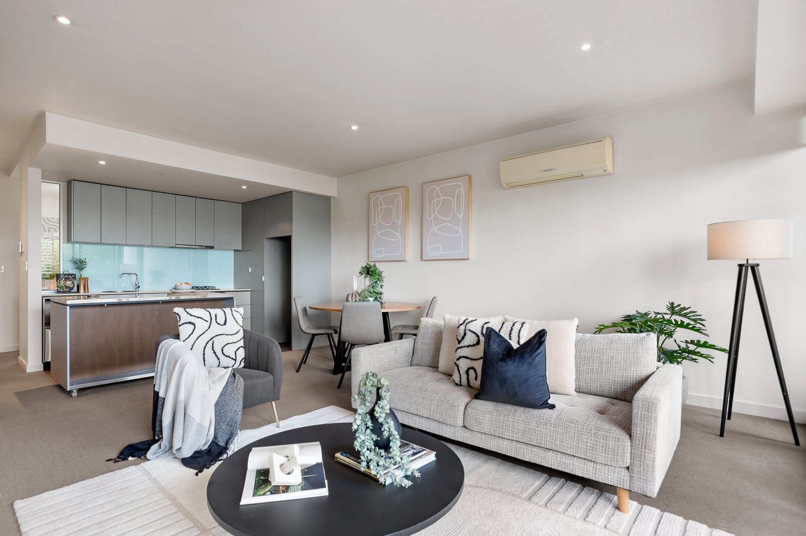 The huge main bedroom is another stand-out feature with its spacious en suite, mirrored robes and study niche that opens to the balcony. The second robed bedroom boasts exclusive use of another stone vanity bathroom. This ultra-secure property also features a European laundry, reverse cycle air conditioning and electric heat panels plus surveillance security, video intercom and lift access to basement parking for two cars and a storage cage. Enjoy modern-amenity all within steps of one of Melbourne's most vibrant lifestyle precincts.