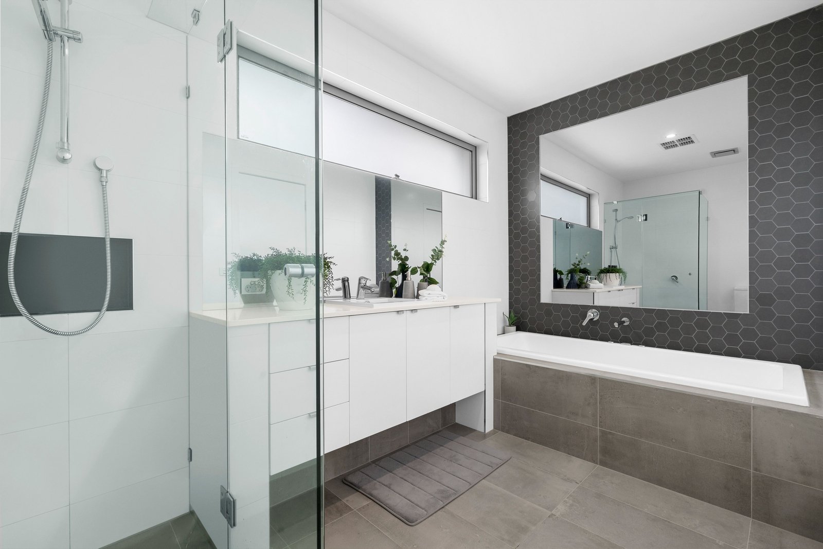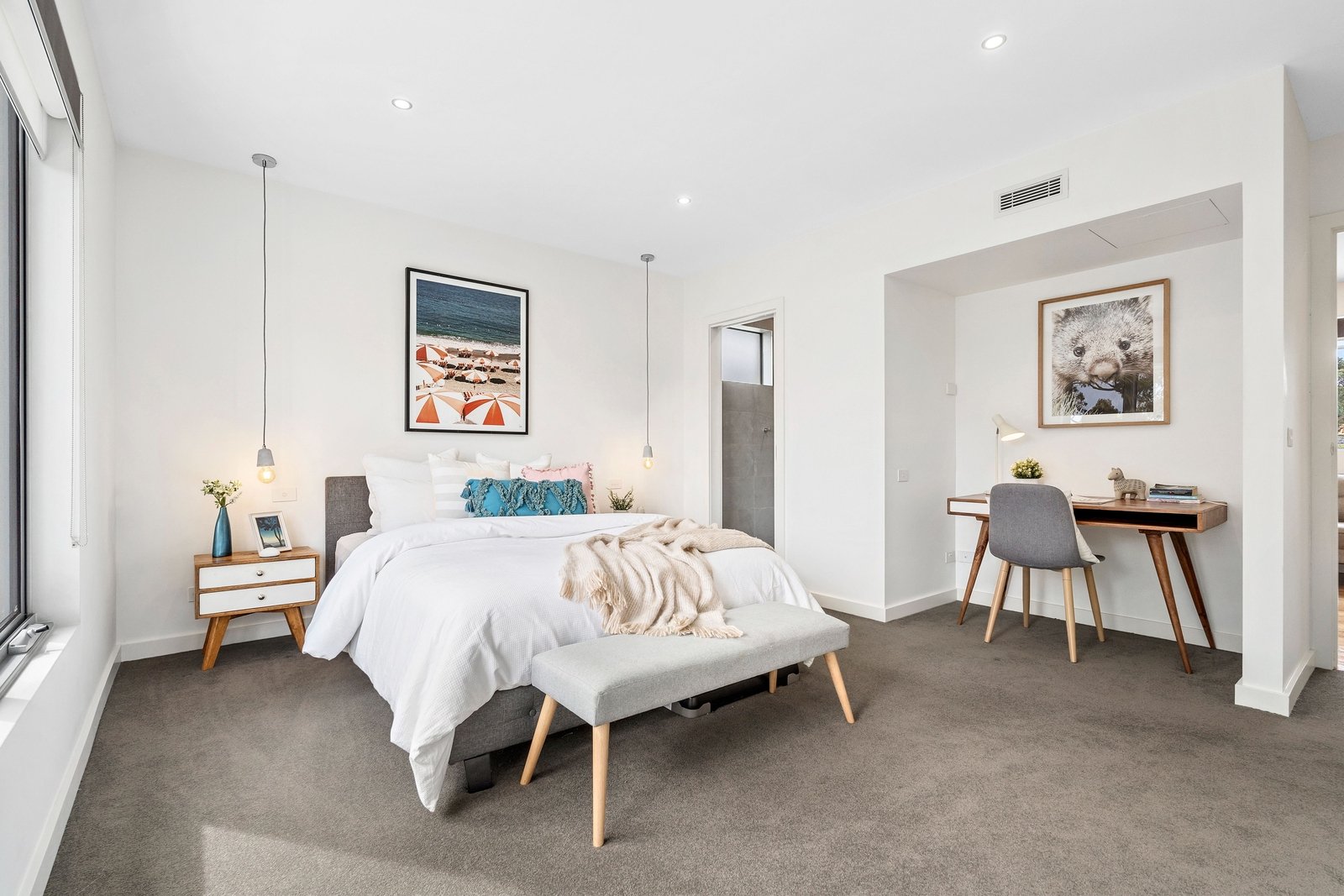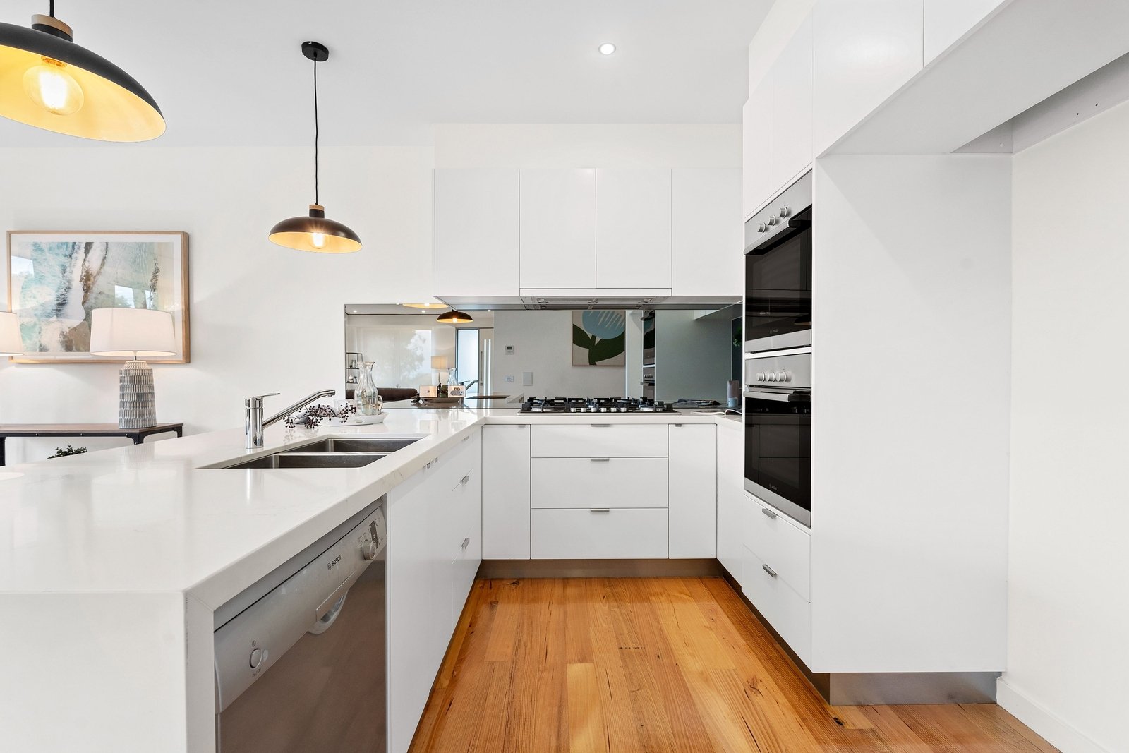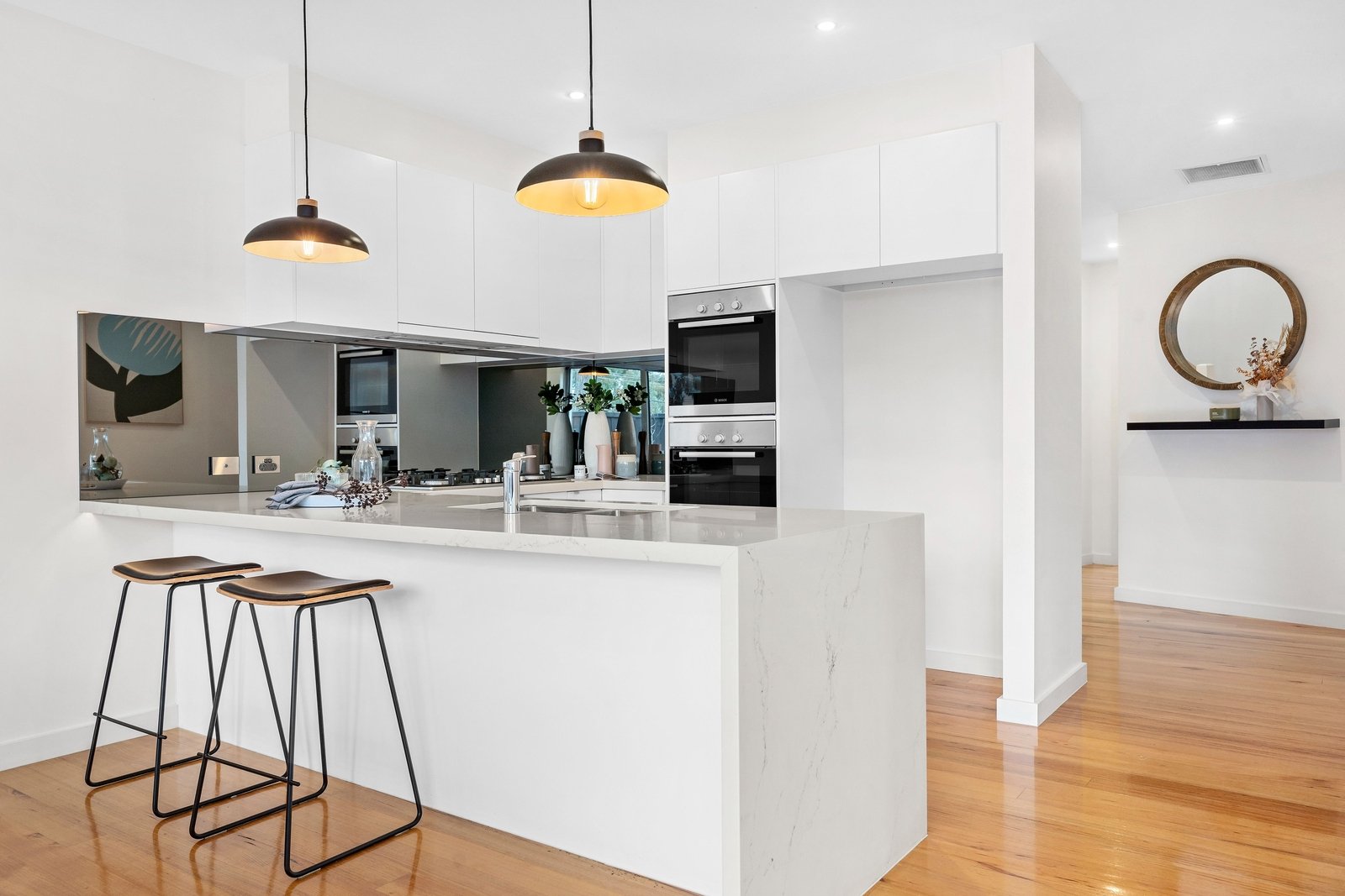 A timber staircase leads up to the first floor where a generous light-filled retreat precedes two generous bedrooms. The master bedroom features built-in robes, study nook and sumptuous ensuite. The second bedroom again offers built-in robes and is adjacent to the sleek family bathroom with deep designer tub.