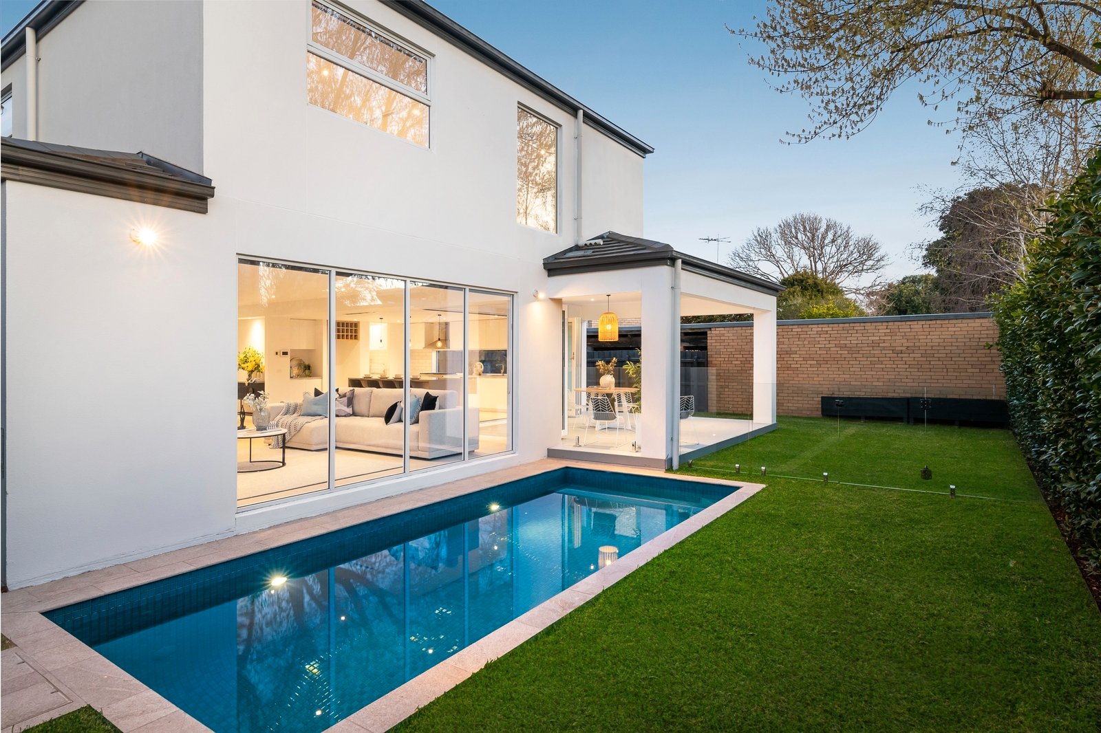 Making an impactful first impression thanks to its chic streamlined façade, the home opens to flawlessly finished interiors and a practical floorplan that caters to every stage and phase of family living. Downstairs, a choice of flexible living areas ensures there is plenty of space for everyone to spread out and enjoy. The hero of the home is the vast open plan living/dining area & sophisticated Epicurean kitchen where banks of bi-folds can be thrown open, extending the living outside to a sheltered alfresco terrace and sparkling fully tiled pool. A versatile lounge and home office (potential 5th bedroom) are also positioned downstairs, while on the home’s upper level, discover another invaluable living area with calming leafy outlooks.