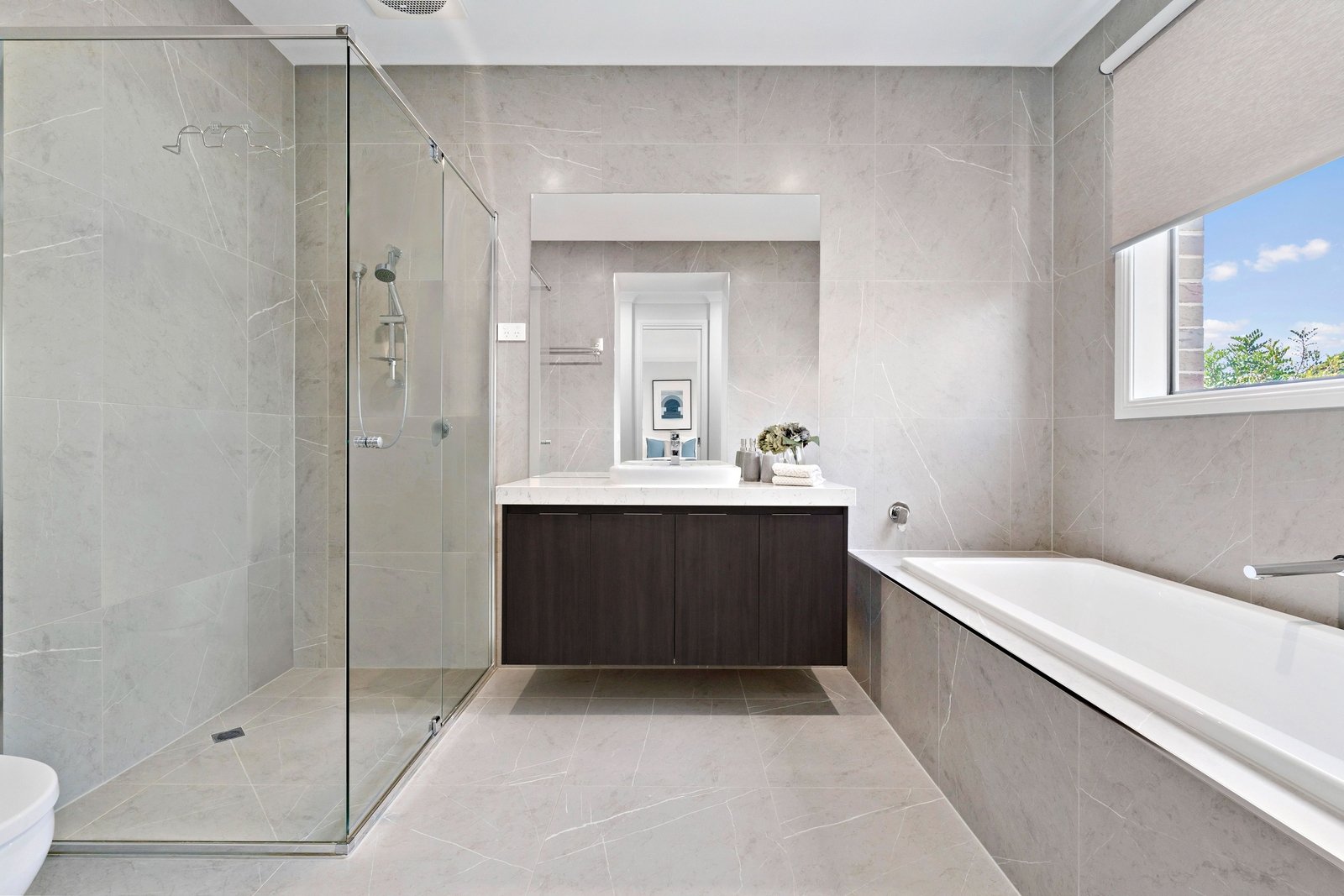 A dramatic hallway entrance frames the formal living room, drawing across to a ground floor guest suite with a full bathroom featuring a high picture window over the shower.