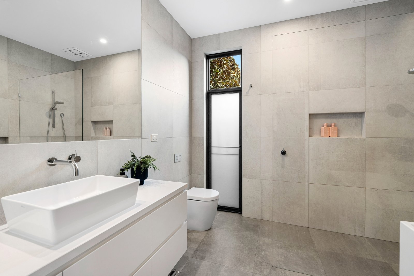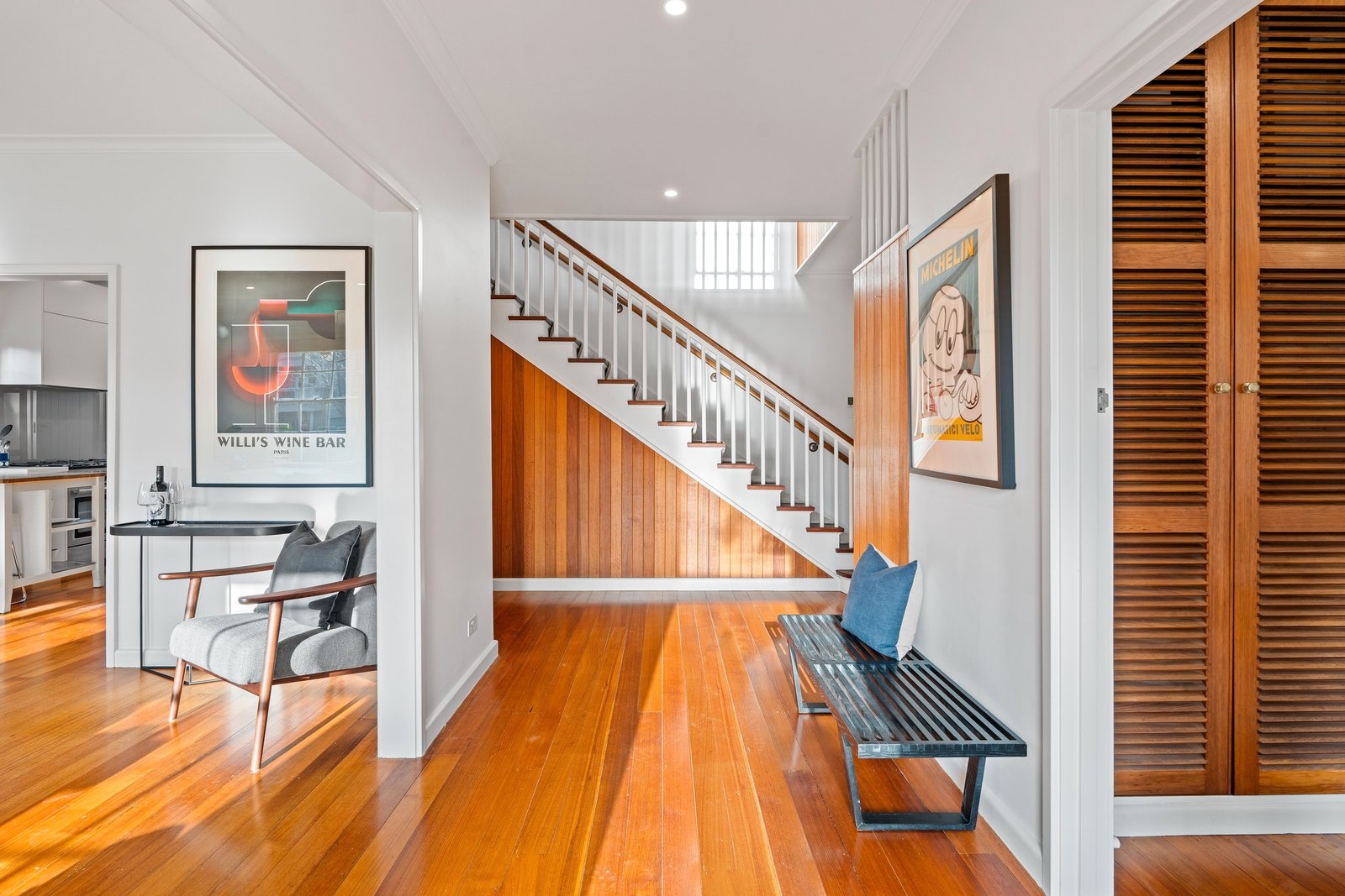 The immaculate stone-finished designer bathroom and similarly clean-lined semi-ensuite are perfect for family living, while the re-fitted laundry with exposed concrete floor offers generous storage.