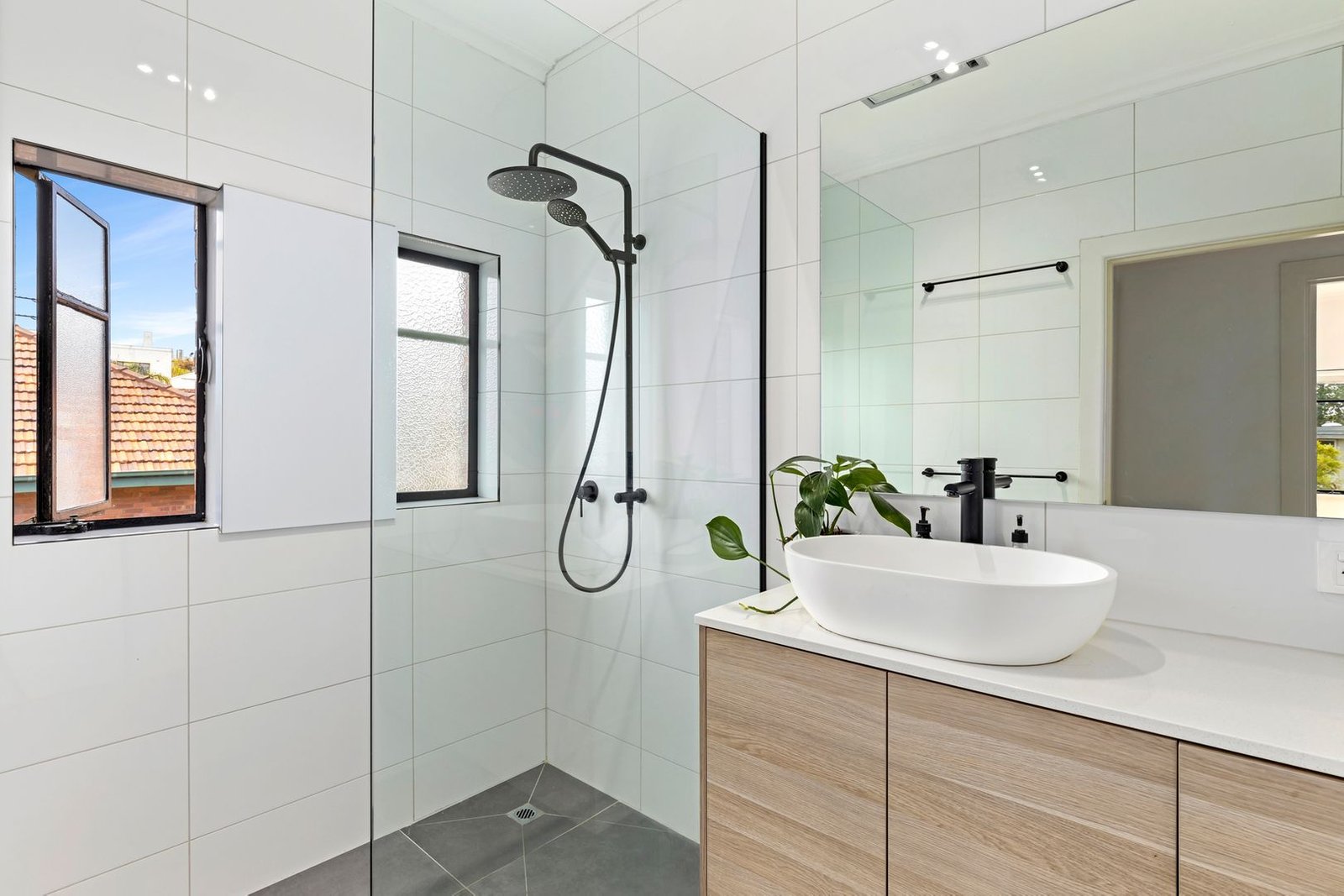 - Stylish fully tiled bathroom highlighted by black accents