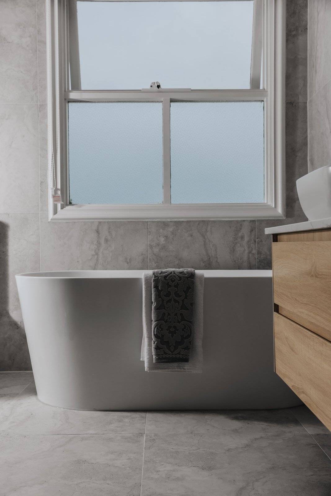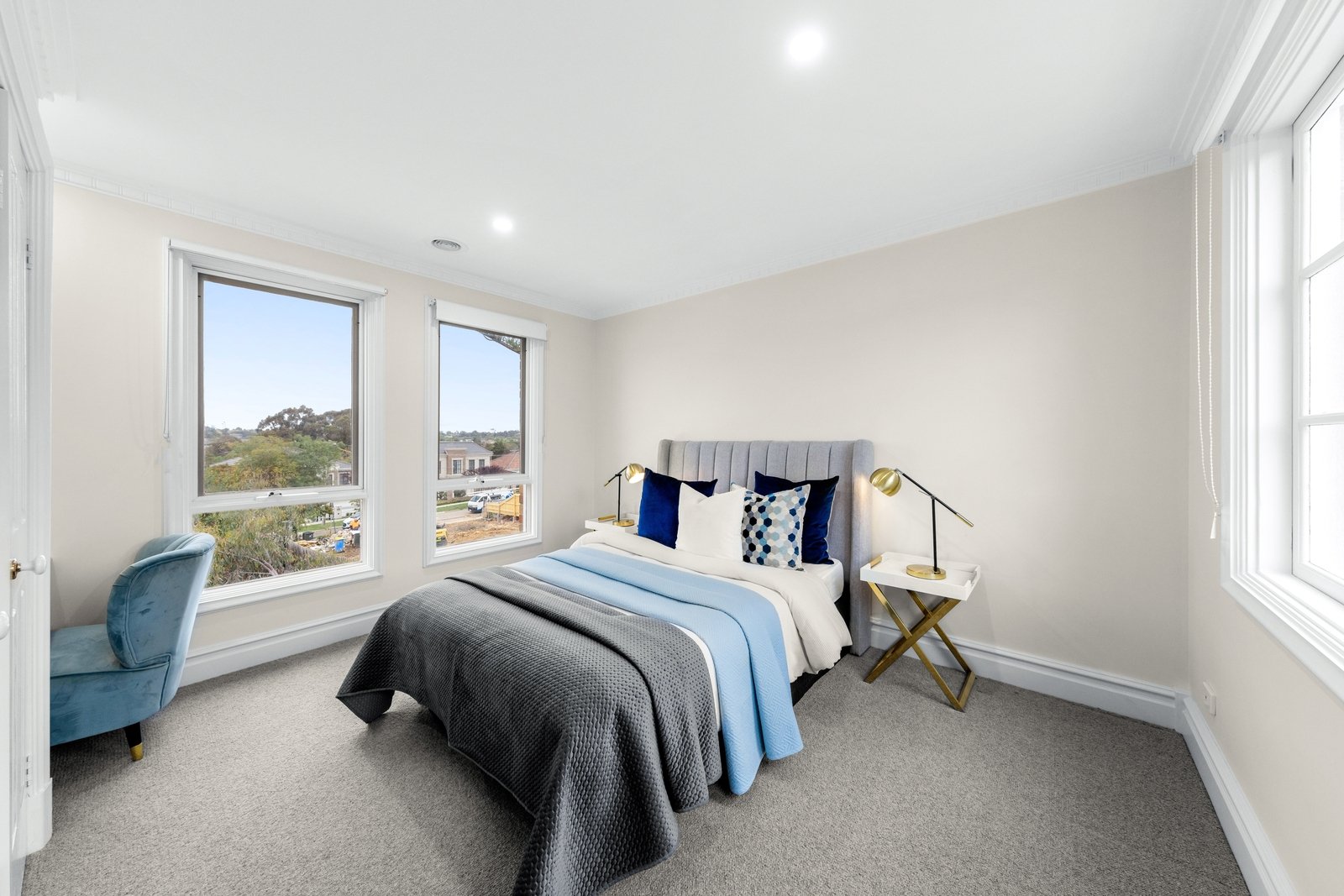 A ground-floor bedroom is serviced by a modern ensuite and features beautiful Tasmania oak floorboards. This warm and inviting flooring choice adds a touch of natural elegance to the space, creating a cozy and welcoming atmosphere. Ideal for visiting guests or in-law accommodation. Upstairs, the sizable master bedroom with built-in robes and a deluxe ensuite is adorned with plush Australian wool carpet, providing both comfort and luxury underfoot. The two additional robed bedrooms (including one with a built-in desk) also boast the comfort of Australian wool carpeting, making them cozy and inviting spaces. They share a sleek main bathroom featuring a freestanding bathtub, rain shower, and a stone-topped vanity.
