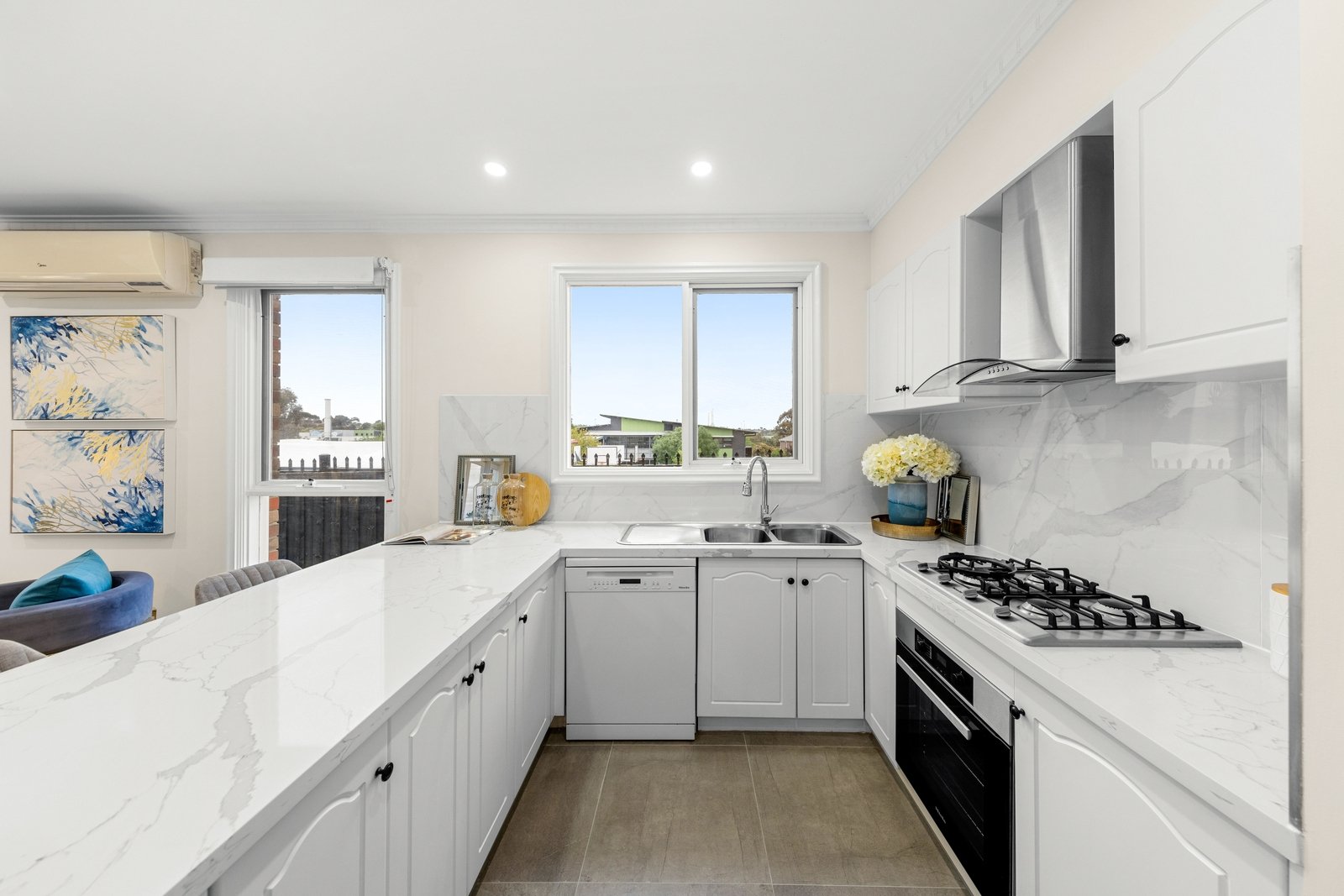 Family-focussed and flooded in natural light, the generous lounge room provides a restful retreat and can be closed off for privacy, accompanied by an open plan family room, dining zone and a gourmet stone kitchen appointed with premium Miele appliances.