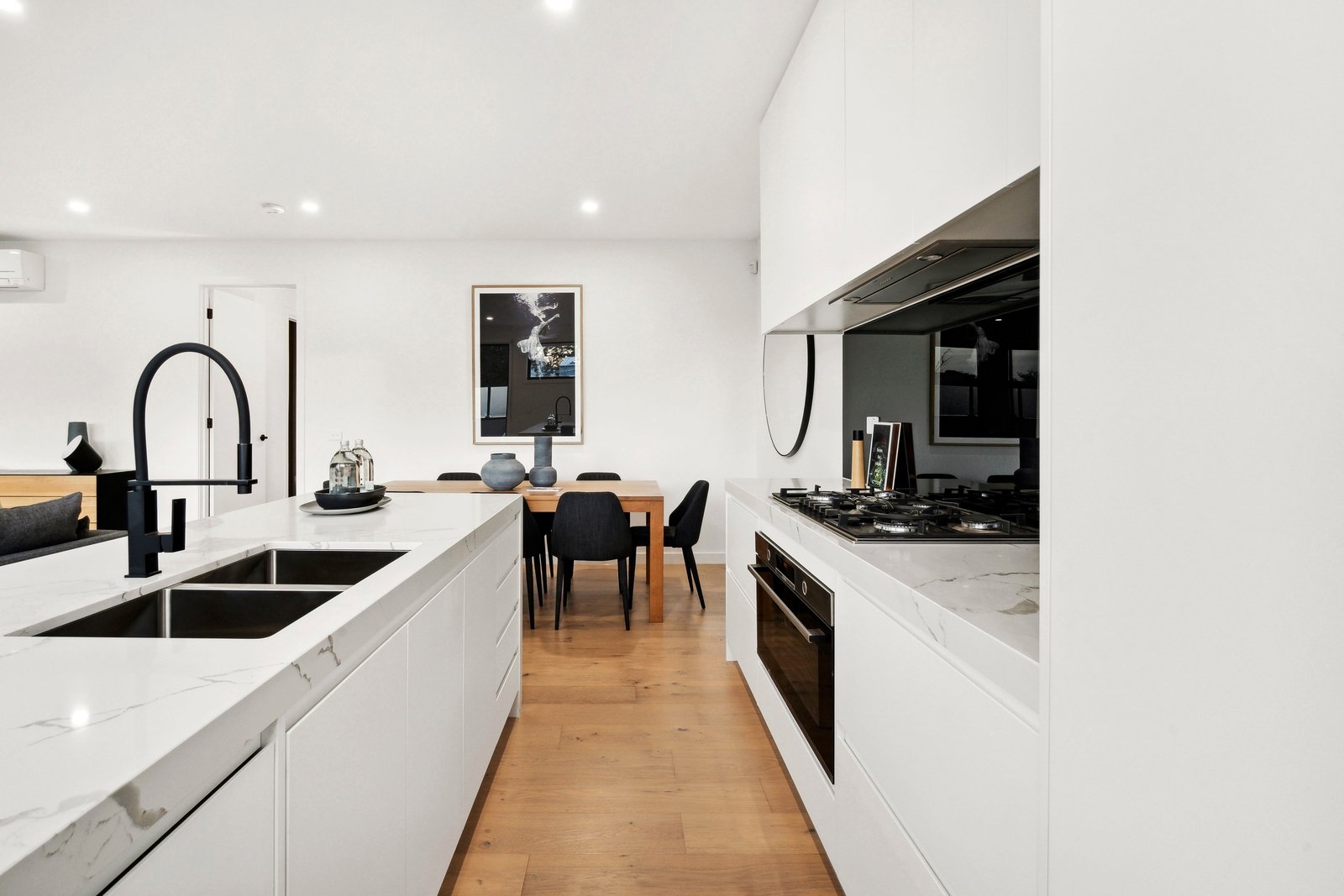Conceived to accommodate family and friends with sizeable suites (each with luxe ensuite) on separate levels, this architectural design is crafted to entertain with big, balconied, north-facing living-dining plus a quietly cosy entertainment lounge. Just completed to a cutting-edge specification with a family-sized Bosch kitchen (with 900mm appliances, integrated dishwasher & stone-wrapped bench), the home stars bathrooms cocooned in concrete-style tiles, floors covered in plush carpets and Oak boards, and stone benchtops with classic Calacatta style.