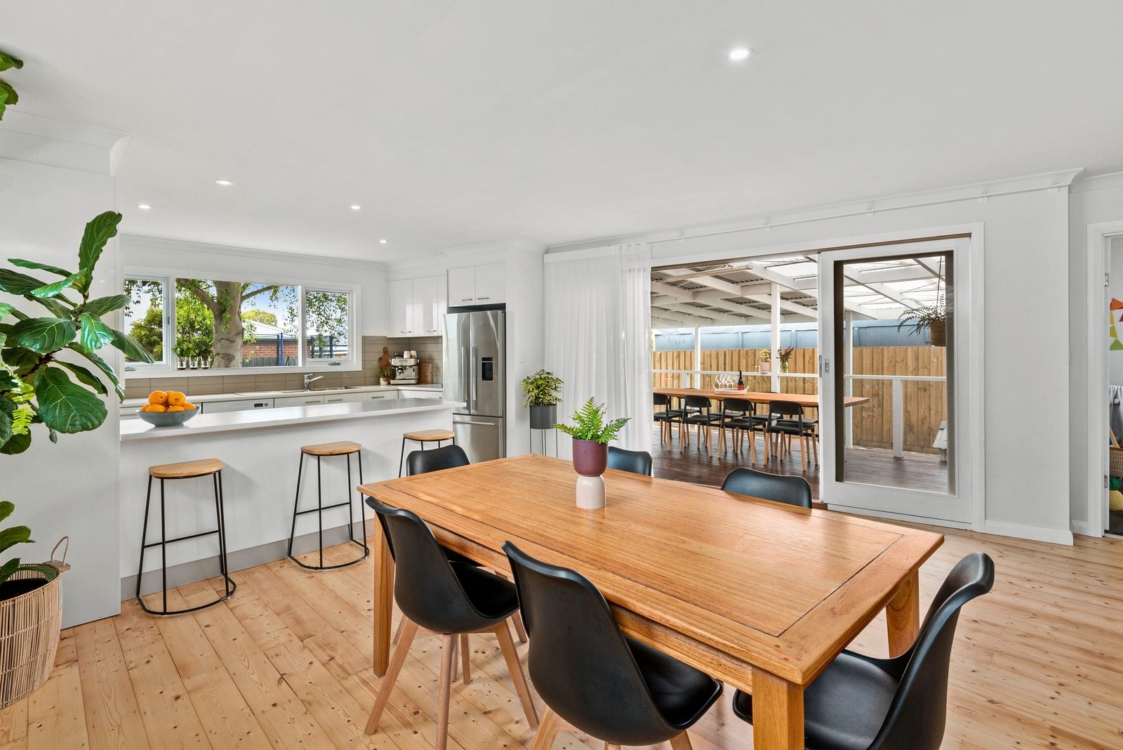The rear of the home seamlessly transitions into a modern open plan, with custom shelving and cabinetry offering both style and function. The contemporary kitchen is well-equipped with stainless steel oven and gas cooktop, dishwasher, plumbing for fridge, ample storage and bench space, the perfect vantage point to watch the kids at play in the backyard, and easy access to the dining and alfresco for effortless entertaining.