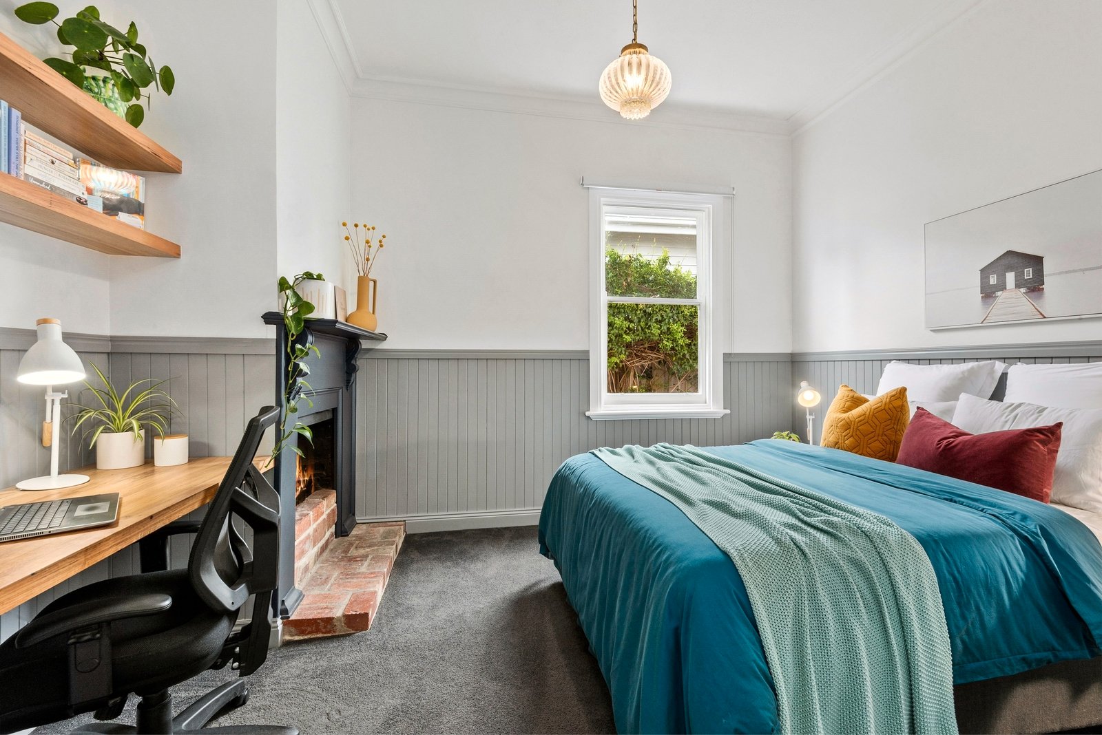The graceful façade features a grand red brick veranda and stunning leadlight windows, offering an impressive introduction on arrival. Inside, the central hallway showcases high ceilings, polished timber floors, ornate fretwork, timber wall paneling, and beautiful pendant lighting. Off the entry, the master features a corner fireplace and built-in robes, an adjacent second bedroom includes built-in desk and robes, and the third bedroom features stunning dado walls, fireplace and office facilities. A fourth bedroom provides a versatile space that could also be used as a second living or home office. The family bathroom has been tastefully updated in modern finishes with double vanity, bath and separate shower.