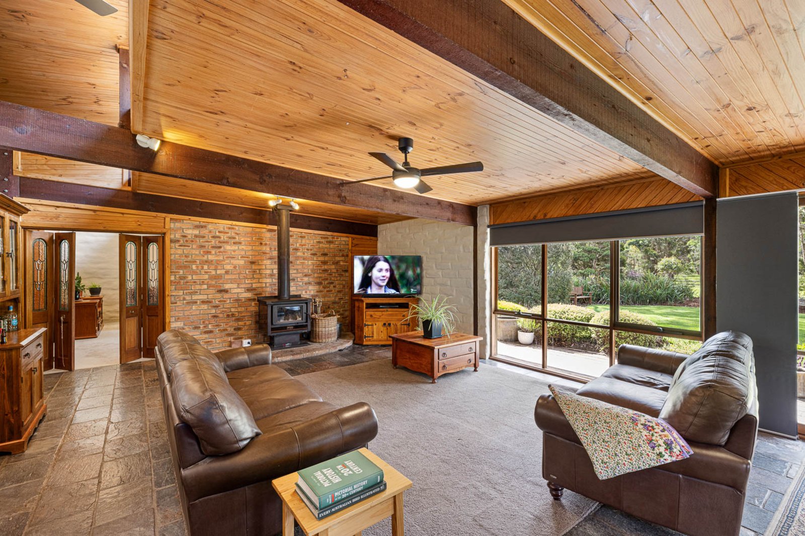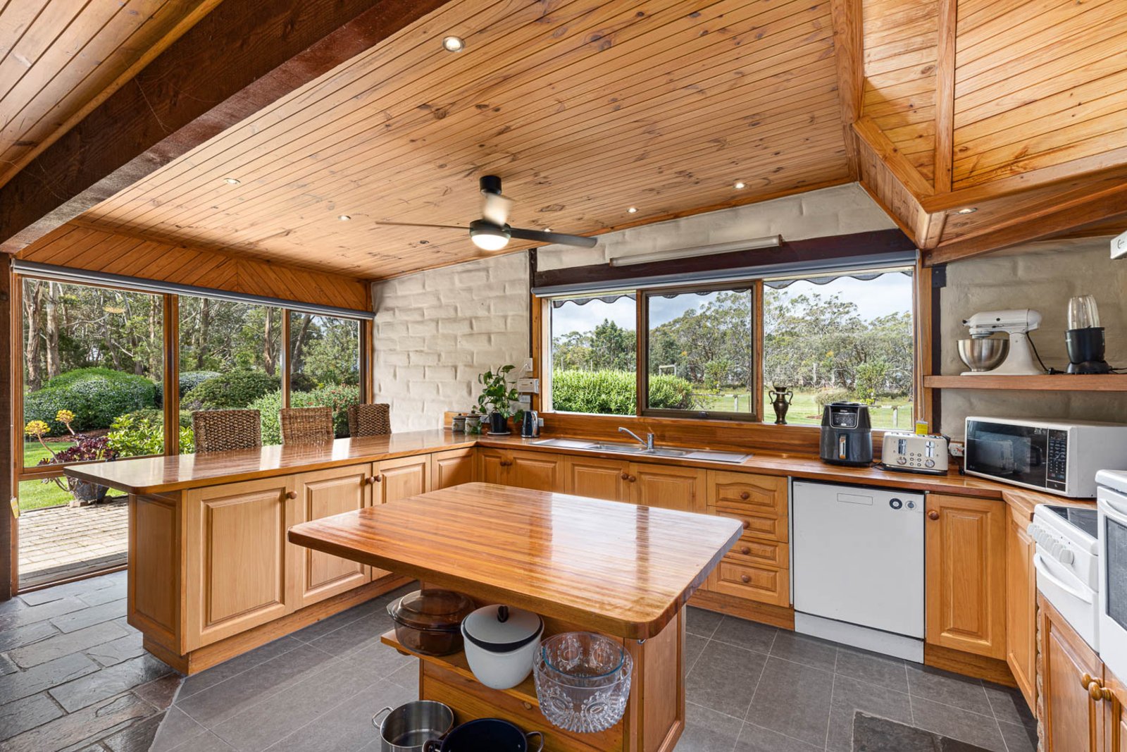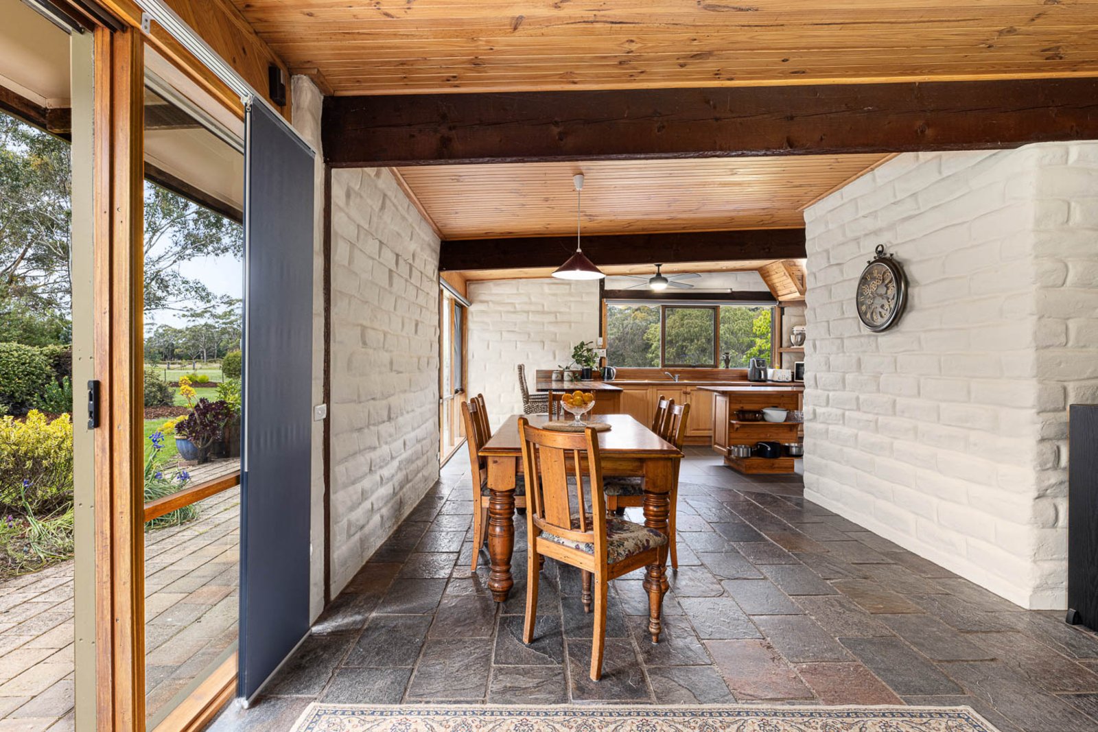 The home exudes rustic charm with its slate floors in the kitchen and living area, a carpeted lounge room, timber ceilings with exposed timber beams, and a central light well that fills the living space with natural light. Sliding doors lead to a front veranda, providing a perfect spot to enjoy the picturesque surroundings.