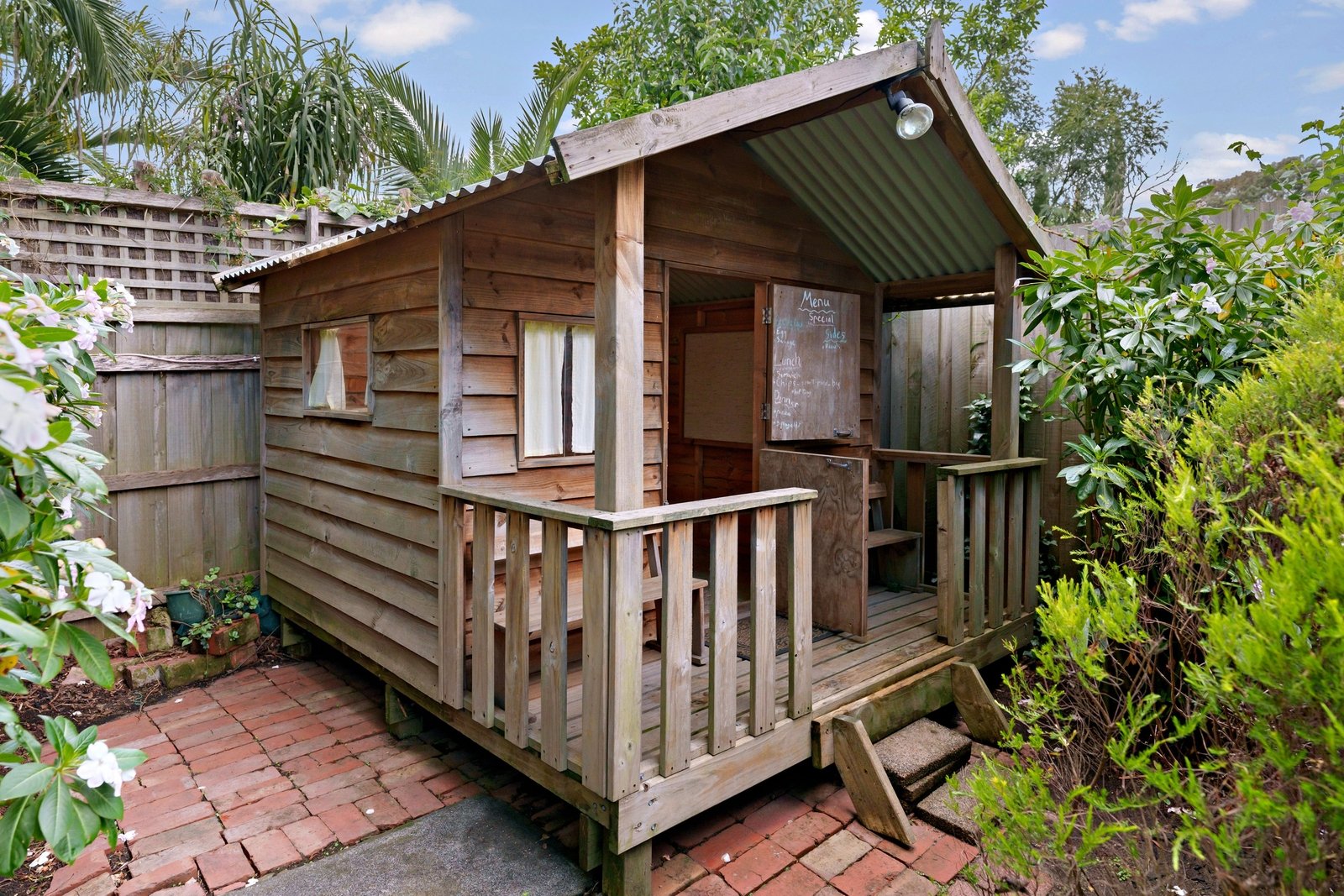 Uniquely detailed by ample attic storage with a pull-down ladder, a cubby house in the back corner for the kids to play in, and a freestanding garage and workshop at the top of the gated driveway.
