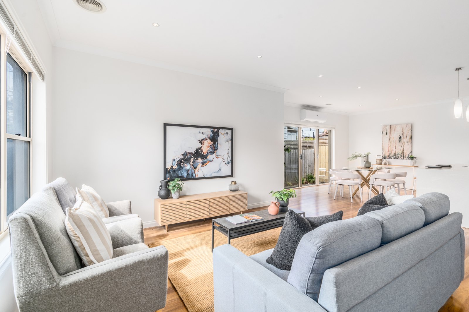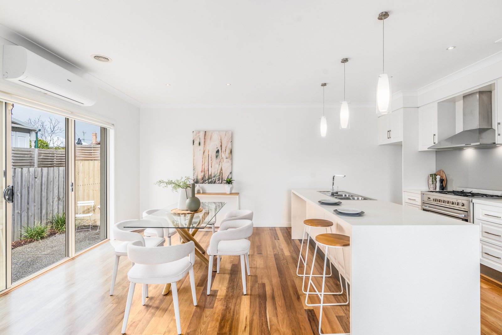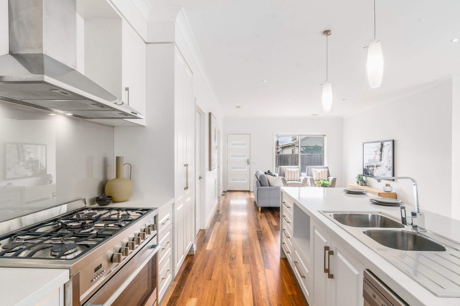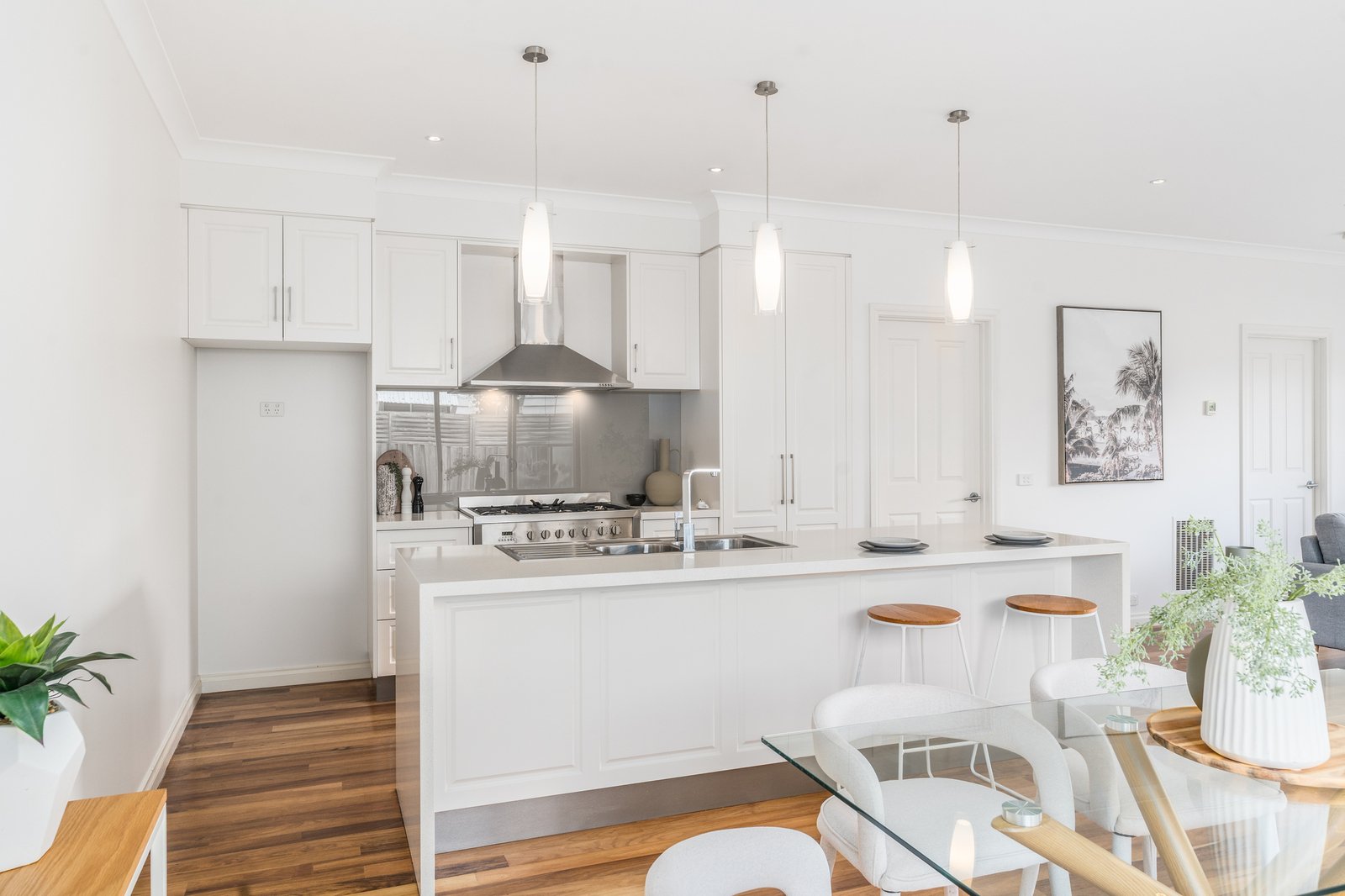 From the elegant façade to the tasteful interiors, the timeless design of the home will impress at every turn. Stepping inside, the north-facing open plan living area enjoys an abundance of natural light, with beautiful polished timber floors showcasing the elevated quality within. The well-appointed kitchen features a large island, waterfall stone benchtops, classic cabinetry, quality stainless steel appliances including 900mm freestanding oven and cooktop, dishwasher, excellent storage provisions, and modern pendant lighting. Positioned to overlook the dining area and courtyard, this is the perfect layout for everyday living and easy entertaining.
