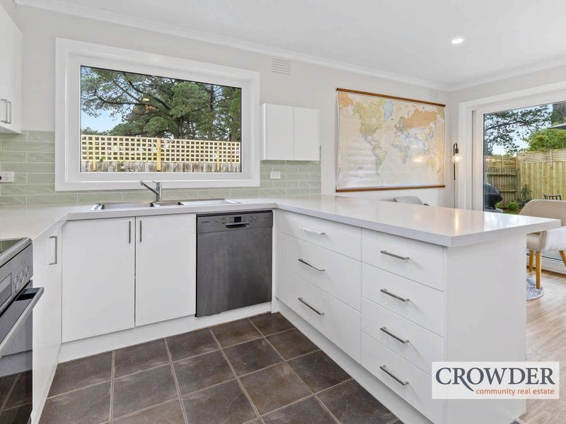 With a bay window and white timber plantation shutters, the floating timber floors of the open living and dining area, spill into a beautifully modernised kitchen with stone benchtops and Bosch stainless-steel appliances.