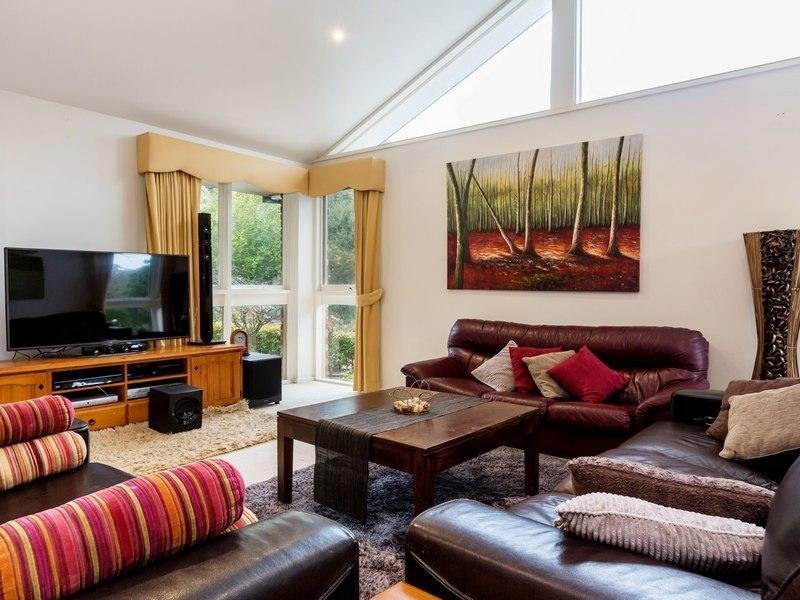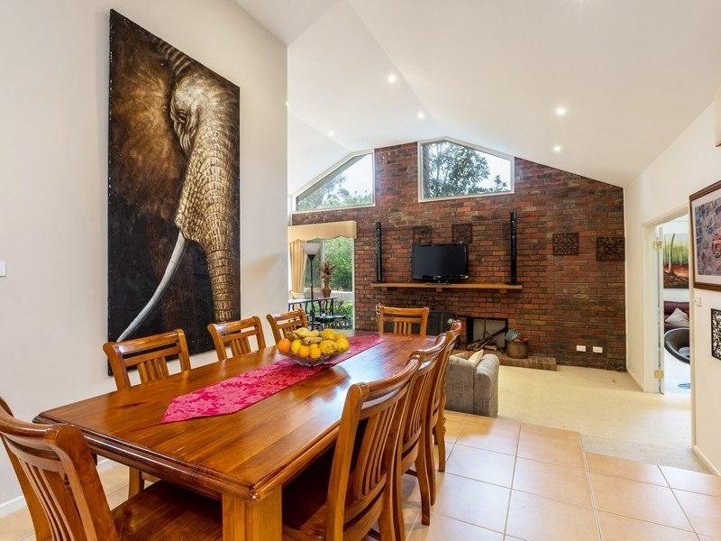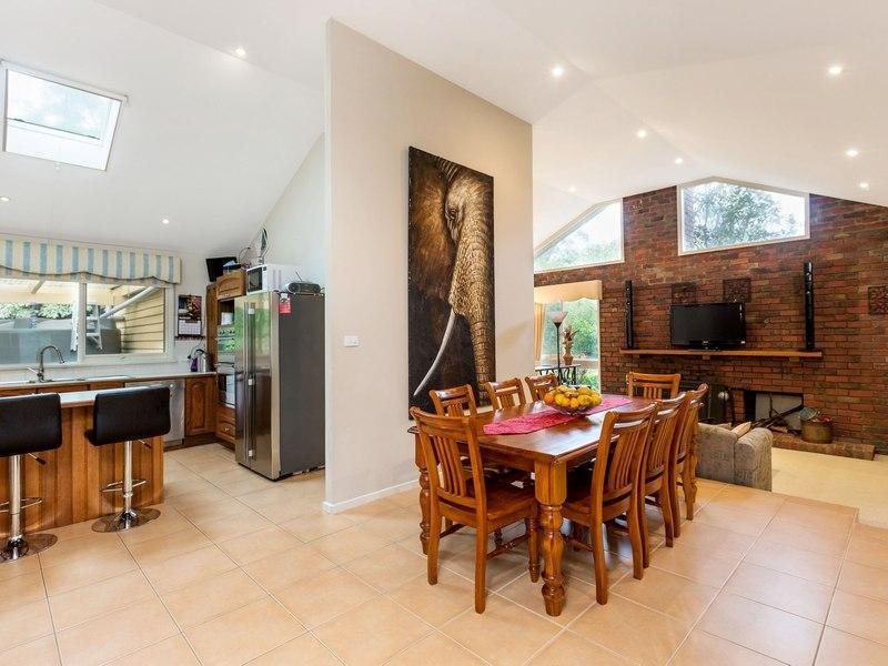 Forming the central hub of this inviting solid-brick home is a sweeping open-plan family living and dining area flooded with natural light from high cathedral ceilings and clerestory windows, while a wood fire exudes a cosy ambiance.