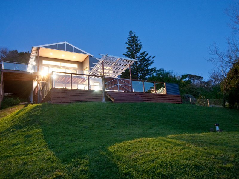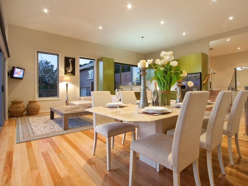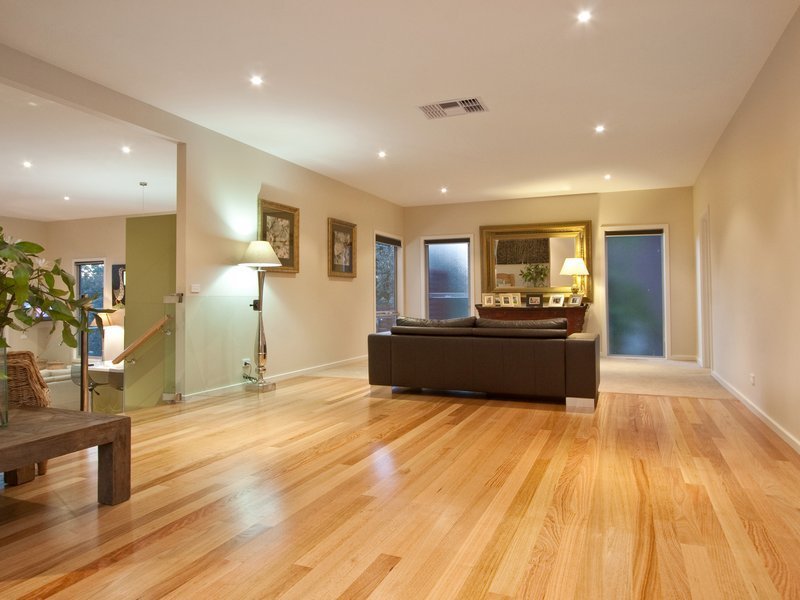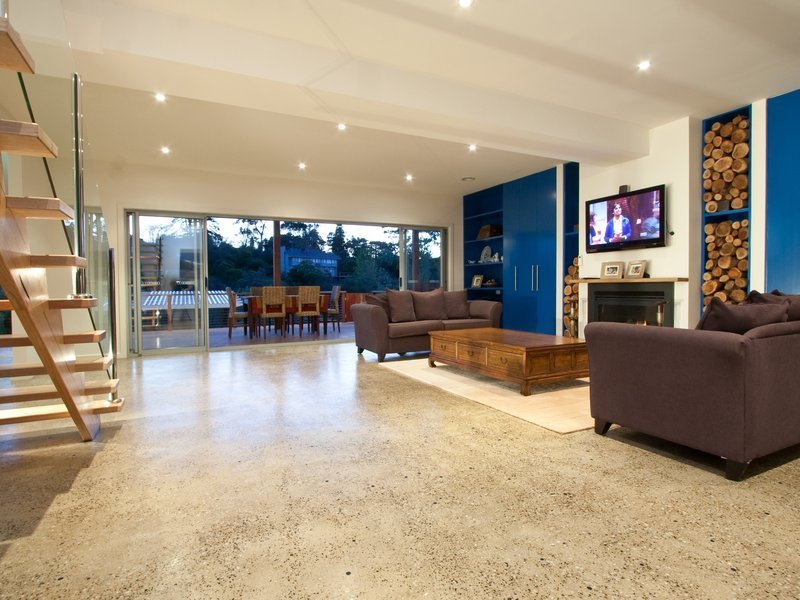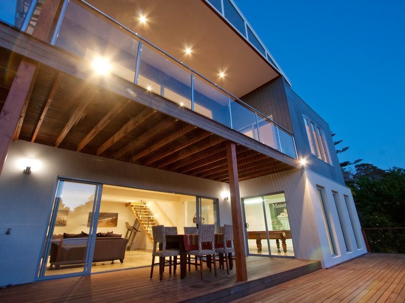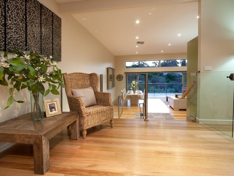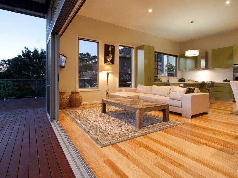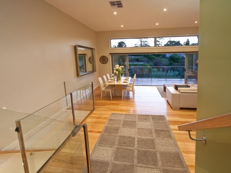 Straight ahead of the front entrance you are greeted by a magnificent view of the Kackeraboit Creek valley and vast area that is the dining/family and open kitchen area. Generous storage, Caesar stone bench tops and island counter. Appliances are stainless steel Bosch. Six stacker sliding doors take you on to the massive wrap around upper deck with stainless steel and glass panel balustrade and previously mentioned views plus seasonal views of the bay. Timber flooring throughout the home is blonde sustainable, harvested wood - Australian chestnut, finished with 'traffic', giving a soft polished hard wearing finish.