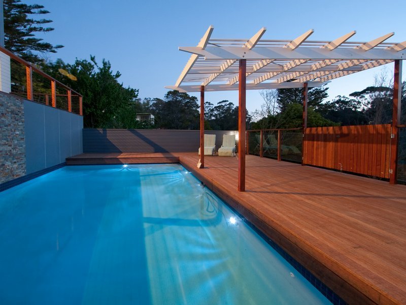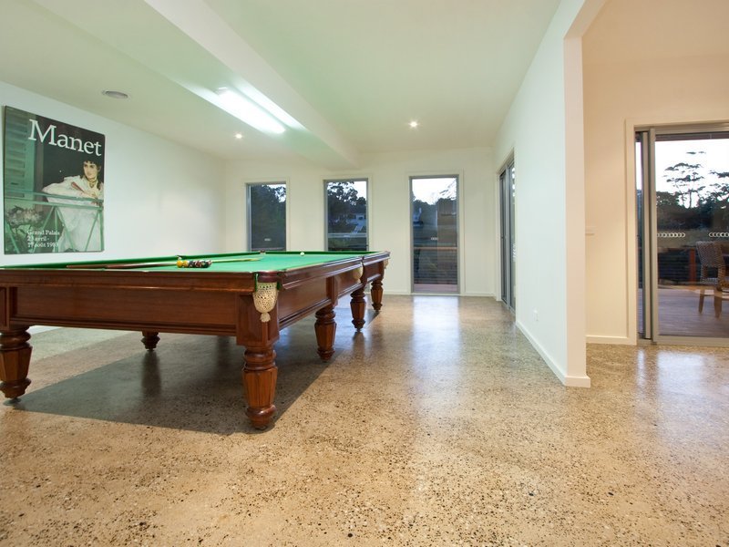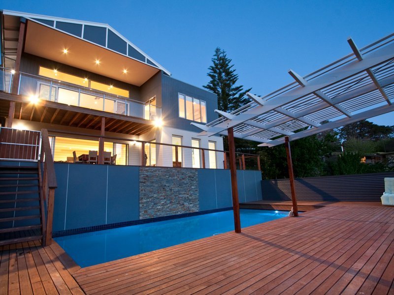 From this inside level you can descend the open string stairwell to the ground floor. Exposed aggregate flooring covers the billiards room and separate lounge room with jet master gas log heater. There is a storage room and toilet. This house has evaporative heating and cooling throughout. At this lower, cool level, you exit onto another two massive deck areas to relax or swim in the salt water swimming pool and sloping grassed area. At the rear of the yard you have a privileged access walkway to Davey's Bay Beach.