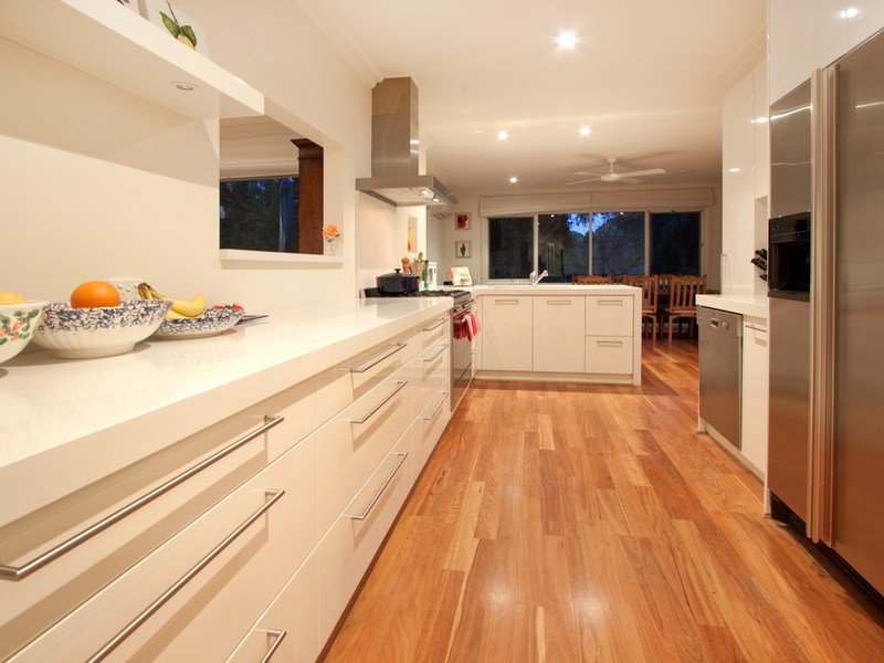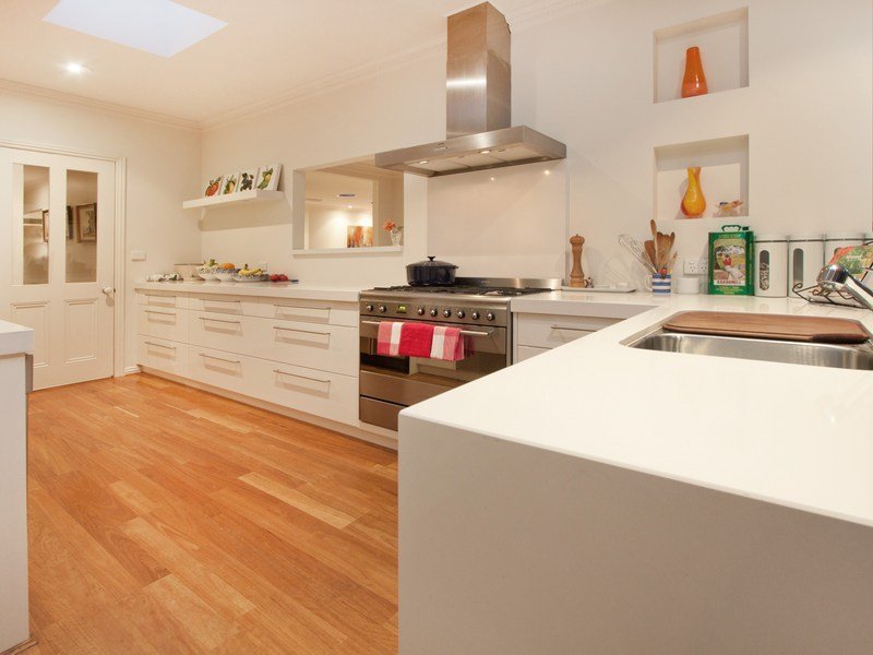 The designer kitchen features Caesar stone bench tops, glossy white cabinetry, stainless steel appliances, a Smeg oven and integrated fridge, making entertaining indoors or out, a hostess' delight.